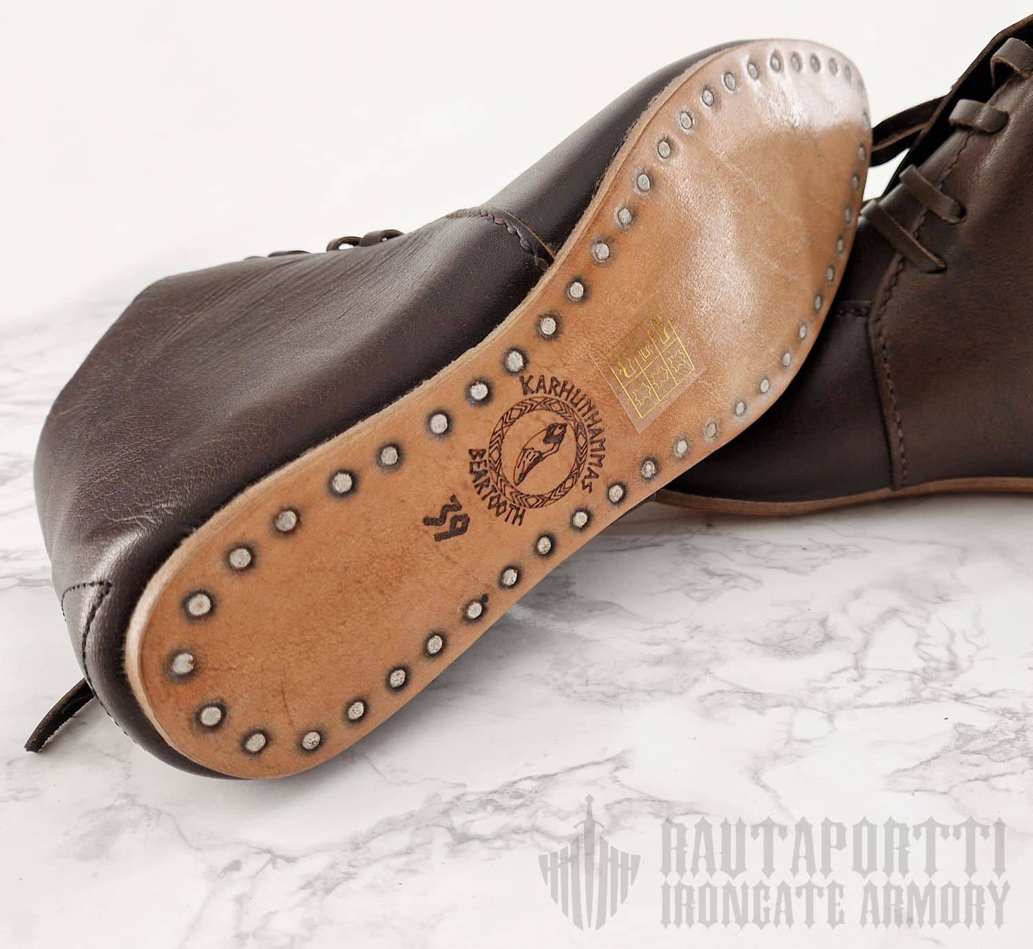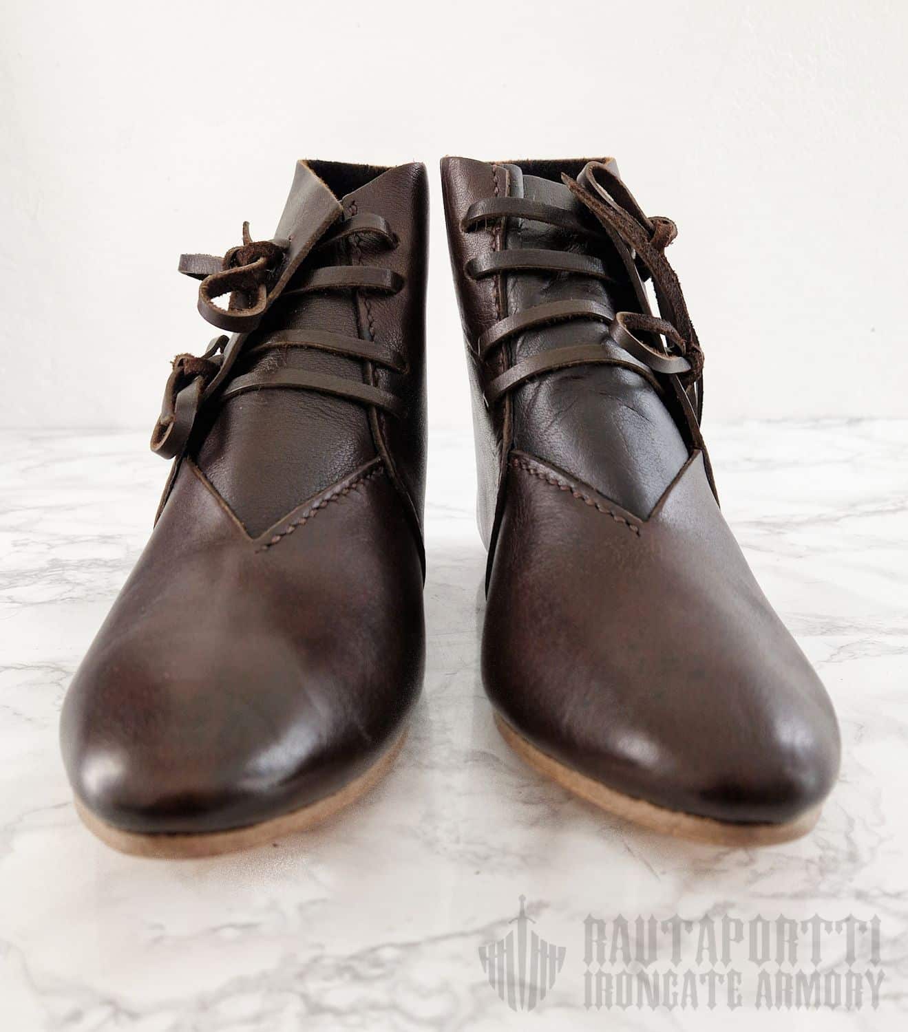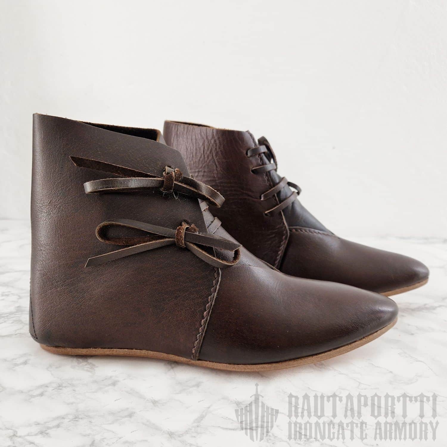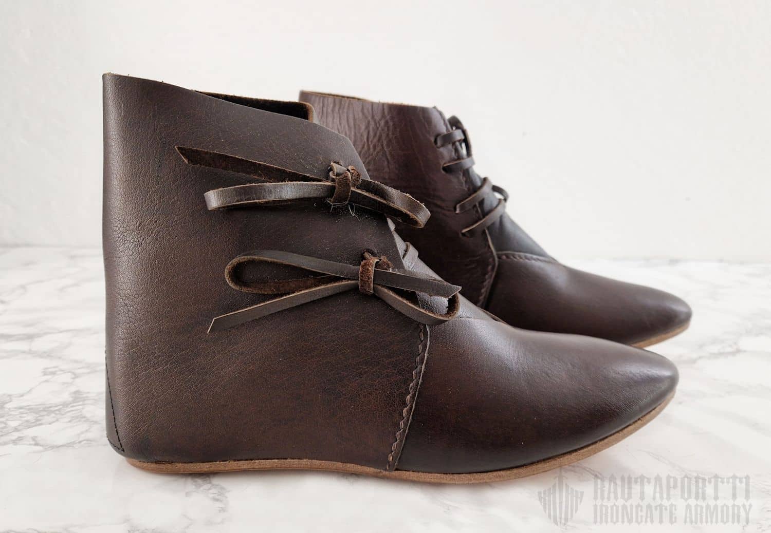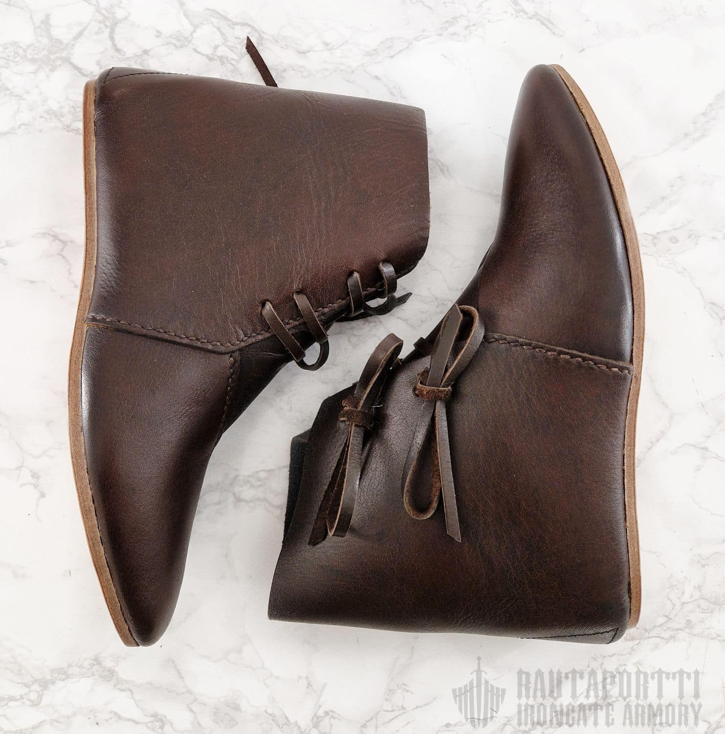 Astu ajassa menneisyyteen jalassasi autenttiset 1300-luvun kengät, jotka edustavat klassista tyyliä, jota käytettiin kautta keskiajan Euroopan. Nilkkapituiset kengät olivat suosittu valinta päivittäiseen käyttöön keskiajalla. Kahdella nahkanauhalla varustetut kengät takaavat tukevan istuvuuden. Nämä kengät on valmistettu kokonaan nahasta, kuten alkuperäisetkin, mikä takaa kestävyyden ja historiallisen tarkkuuden. Naulattu nahkapohja varmistaa pitkän käyttöiän. Nämä kengät ovat täydellinen valinta historiaharrastajille, elävöittäjille ja roolipelaajille, jotka haluavat panostaa autenttiseen asukokonaisuuteen.