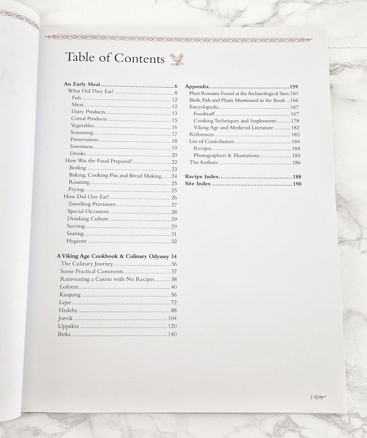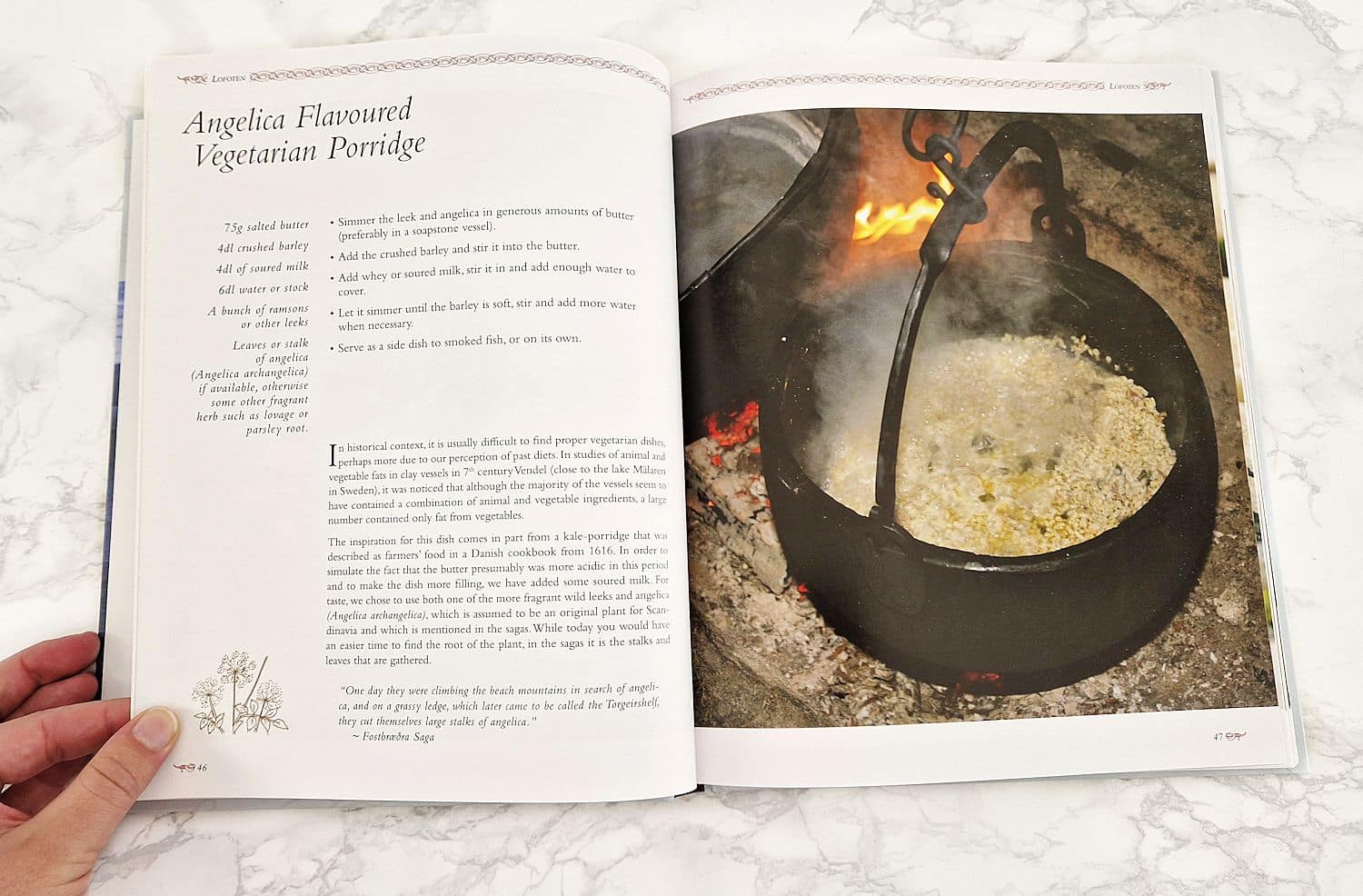 Tämä kirja on sekä opas viikinkiajan ruokailutottumuksiin ja -tapoihin, että keittokirja, joka perustuu arkeologisiin löytöihin ja kokeelliseen arkeologiaan. Reseptiosiossa käydään läpi 42 eri reseptiä seitsemältä eri maantieteelliseltä alueelta. Lähes kaikki reseptit ovat valmistettavissa niin keittiössä kuin viikinkileirissäkin. Taustamateriaalin ja reseptien lisäksi kirjassa on mielenkiintoiset liiteosat, mm. tietosanakirjamainen sanasto, sekä käännökset ainesosista englanniksi, latinaksi, ruotsiksi, tanskaksi, norjaksi sekä saksaksi.