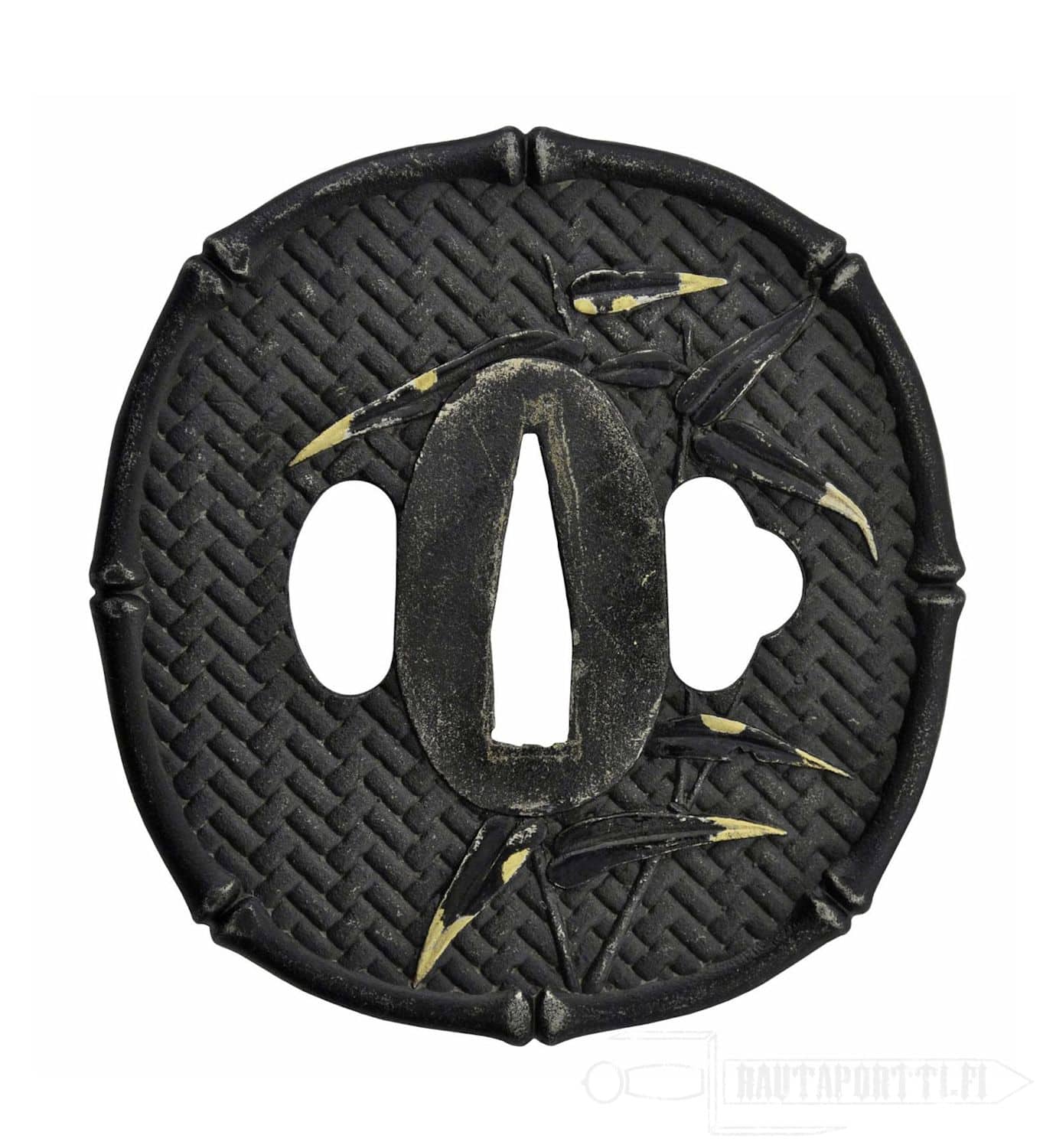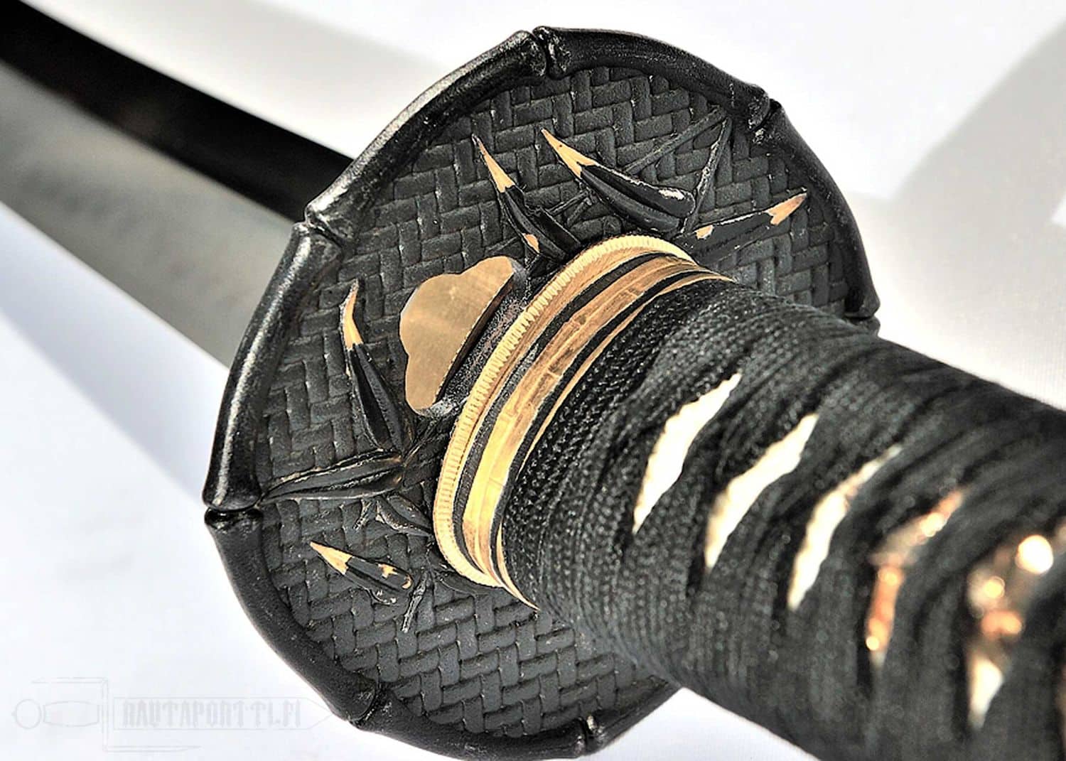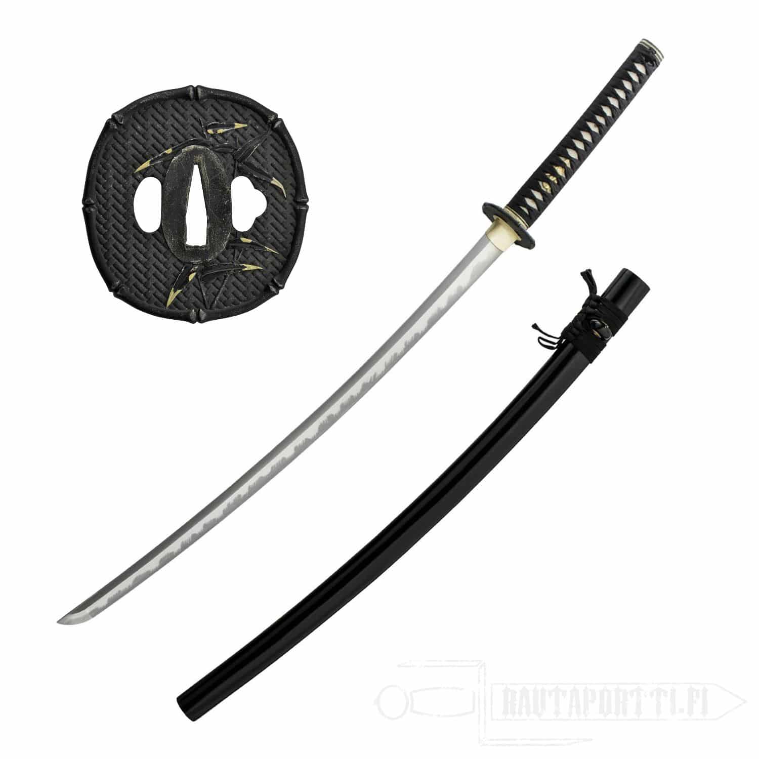 Katanan helat ovat bambuaiheiset. Mustassa rautaisessa tsubassa on bambumattokuvio, bambukuvioreunus, ja se on koristeltu kultakärkisillä bambunlehdillä. Fuchi/kashira noudattavat samaa teemaa ja kultaisessa menukissa on varpuspari. Saya on viimeistelty korkeakiiltoisella lakalla, ja siinä on sarviset helat.