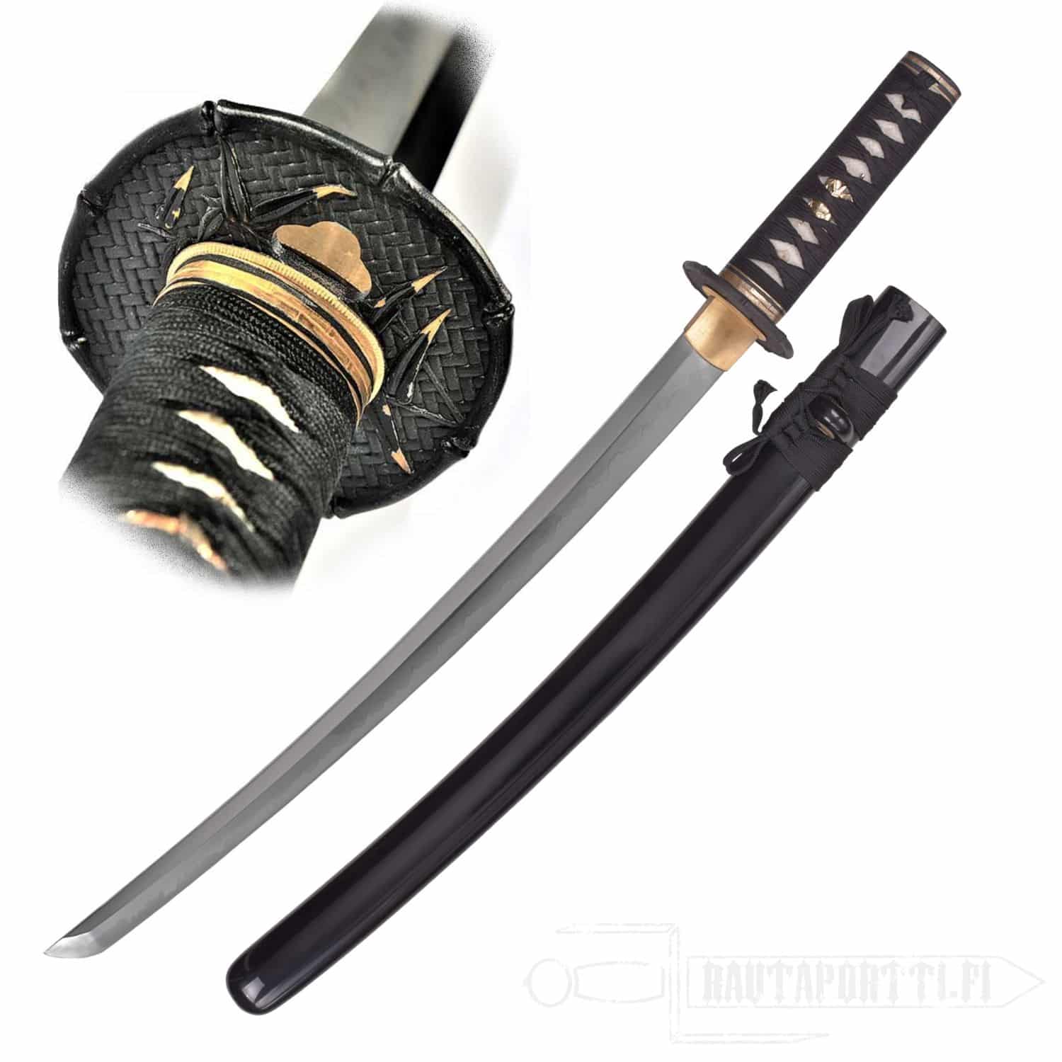 Wakizashin helat ovat bambuaiheiset. Mustassa rautaisessa tsubassa on bambumattokuvio, bambukuvioreunus, ja se on koristeltu kultakärkisillä bambunlehdillä. Fuchi/kashira noudattavat samaa teemaa ja kultaisessa menukissa on varpuspari. Saya on viimeistelty korkeakiiltoisella lakalla, ja siinä on sarviset helat.