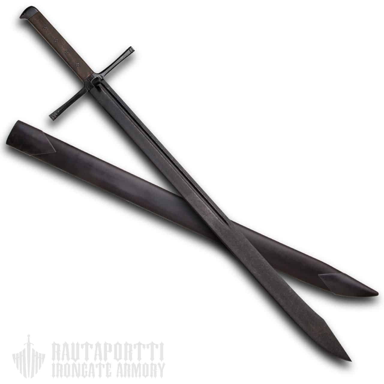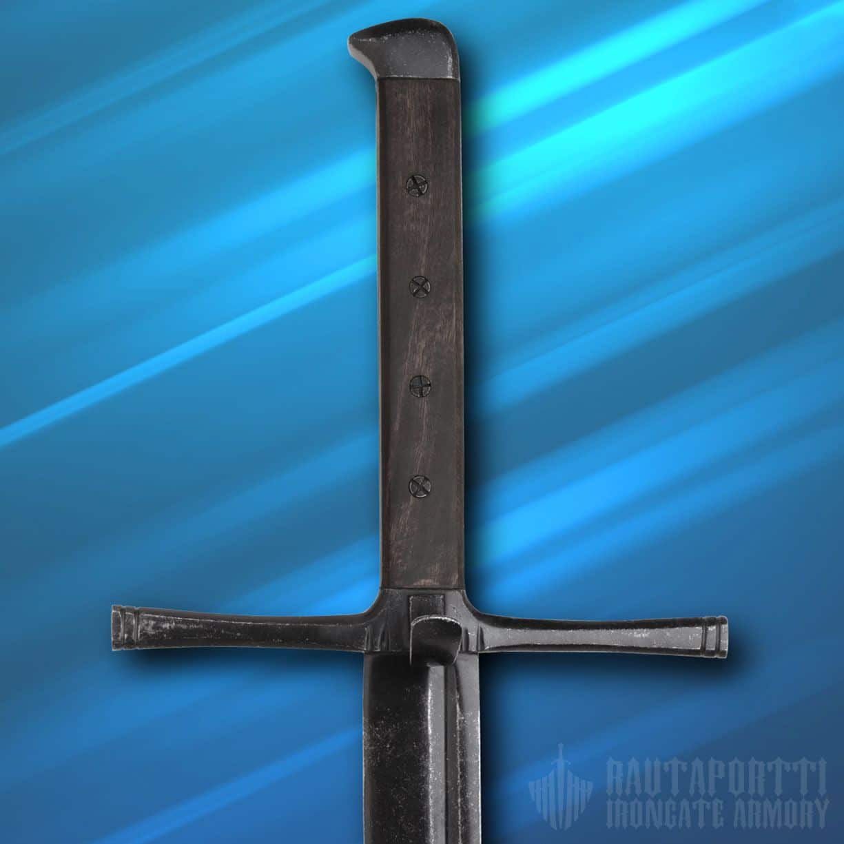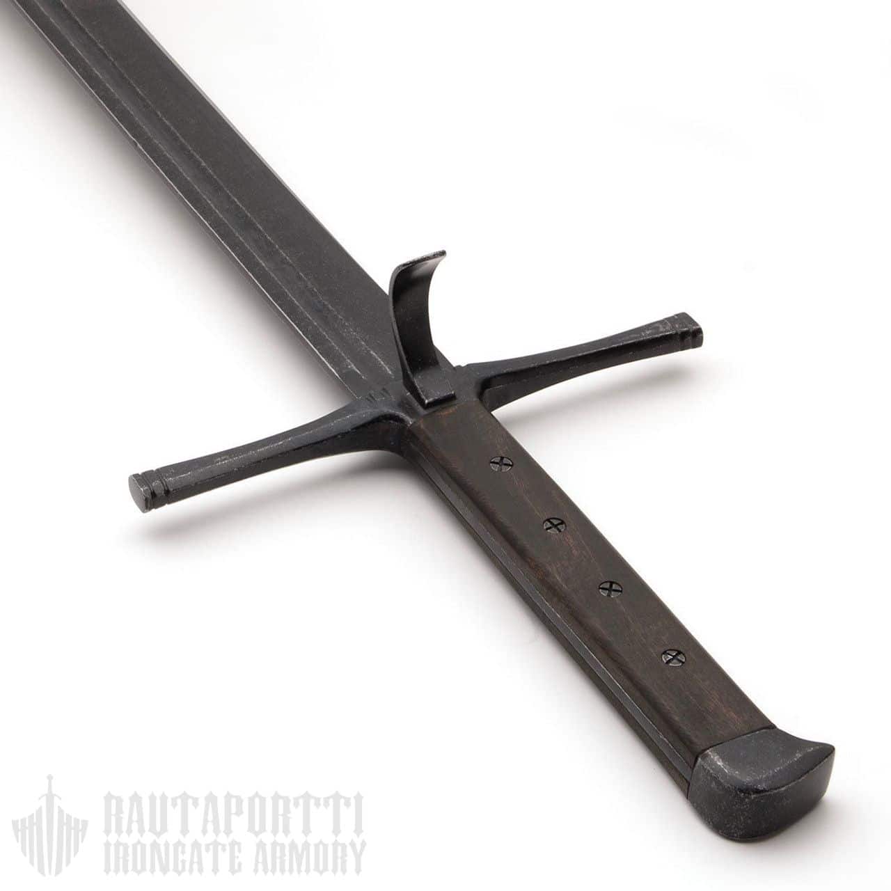 - Tässä puolentoista käden miekassa on pitkä kahva jolle mahtuu kaksi kättä