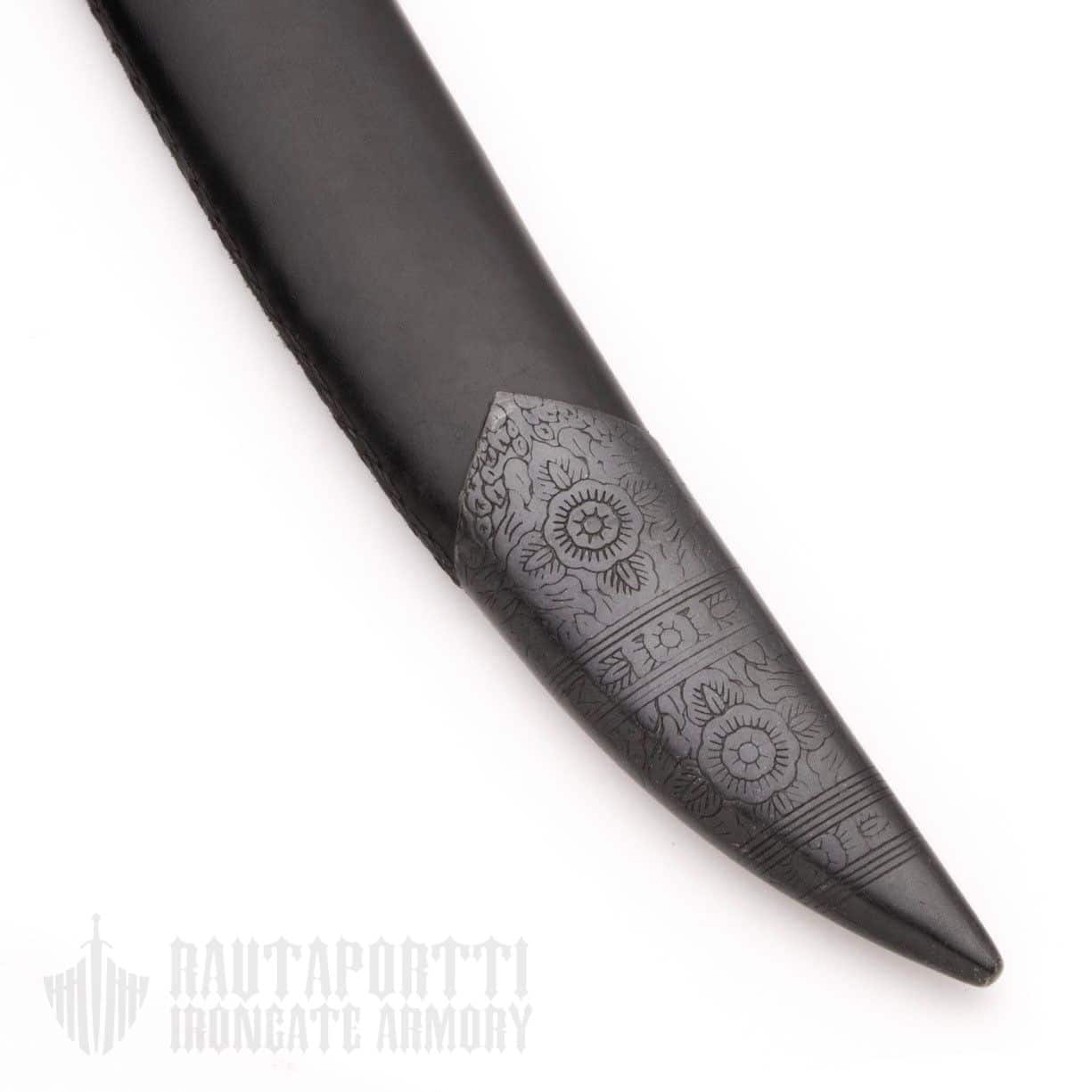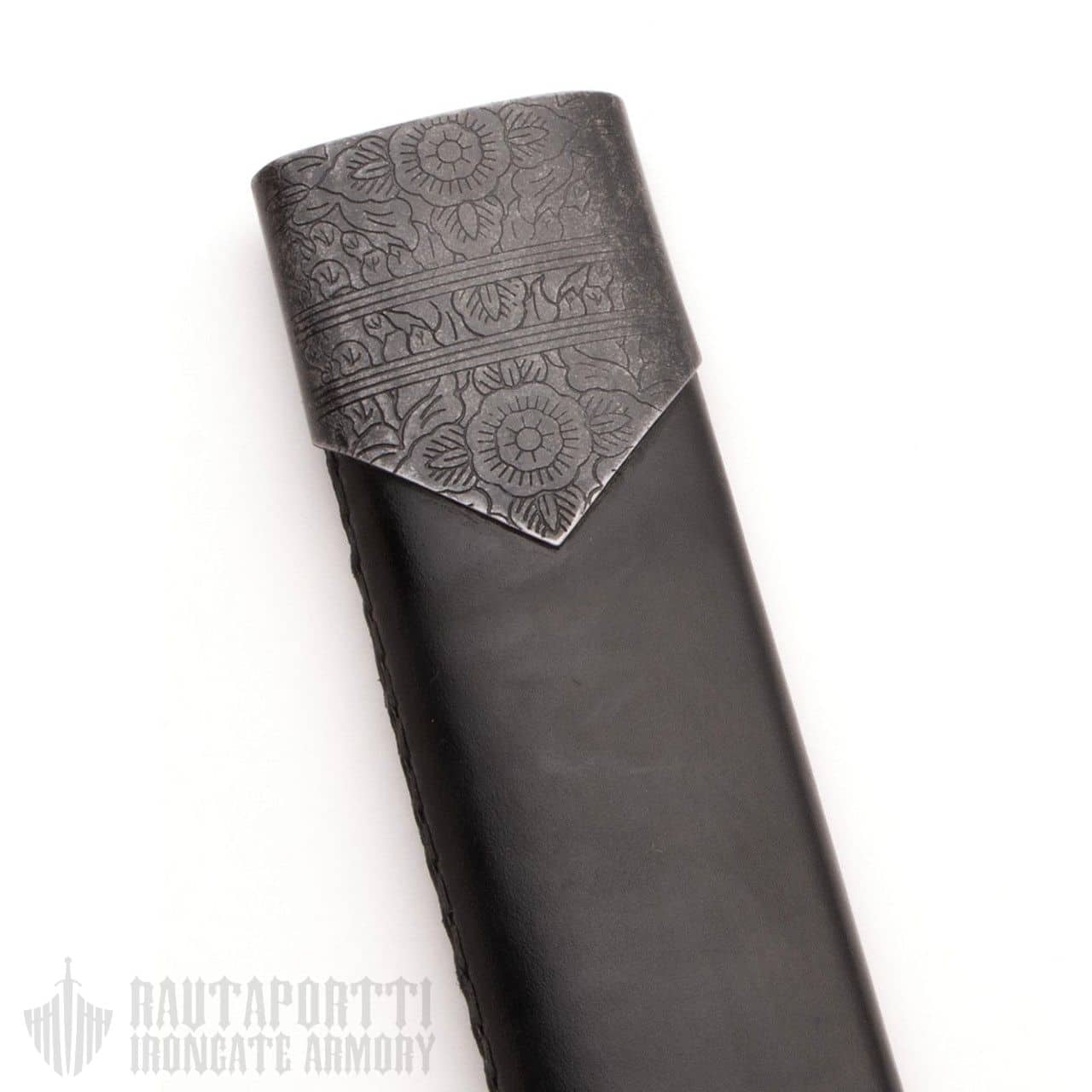 Nahkaisessa huotrassa on teräksinen suuhela ja kärkihela, jotka on koristeltu perinteisellä kukkakuviokaiverruksella.