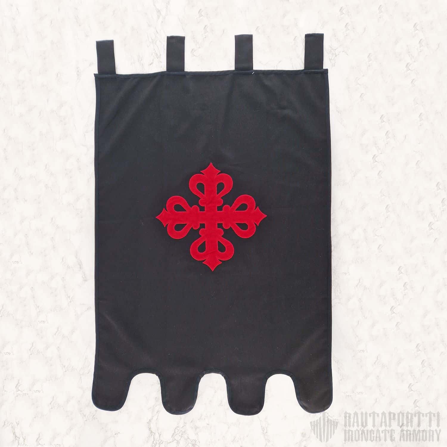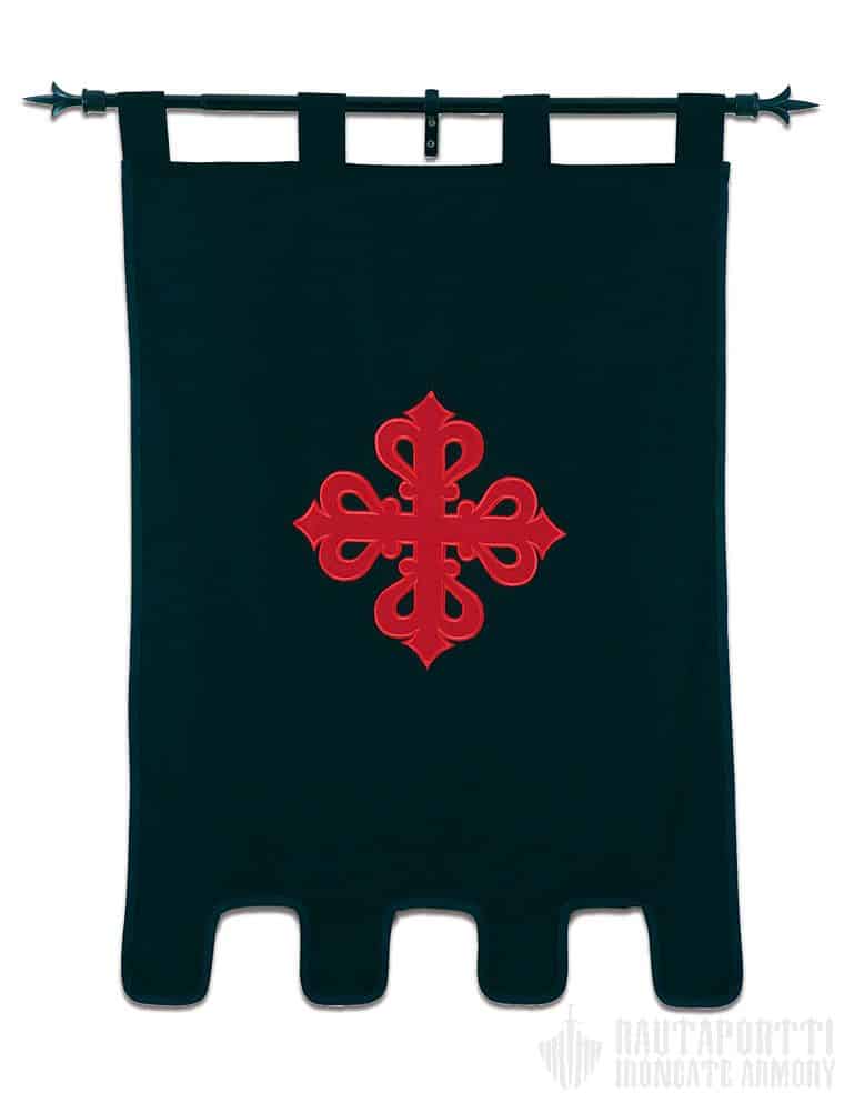 Tämä standaari on valmistettu paksusta mustasta puuvillakankaasta, ja sen etupuolelle on kirjailtu punainen tasahaarainen fleur-de-lis risti, Calatravan ritarikunnan tunnus. Lipussa on neljä kangaslenkkiä, joilla voit ripustaa sen joko airueesi trumpettiin, tai vaihtoehtoisesti verhotankoon tai muuhun seipääseen tuomaan ripauksen keskiaikaista viehätystä kotisi sisustukseen.