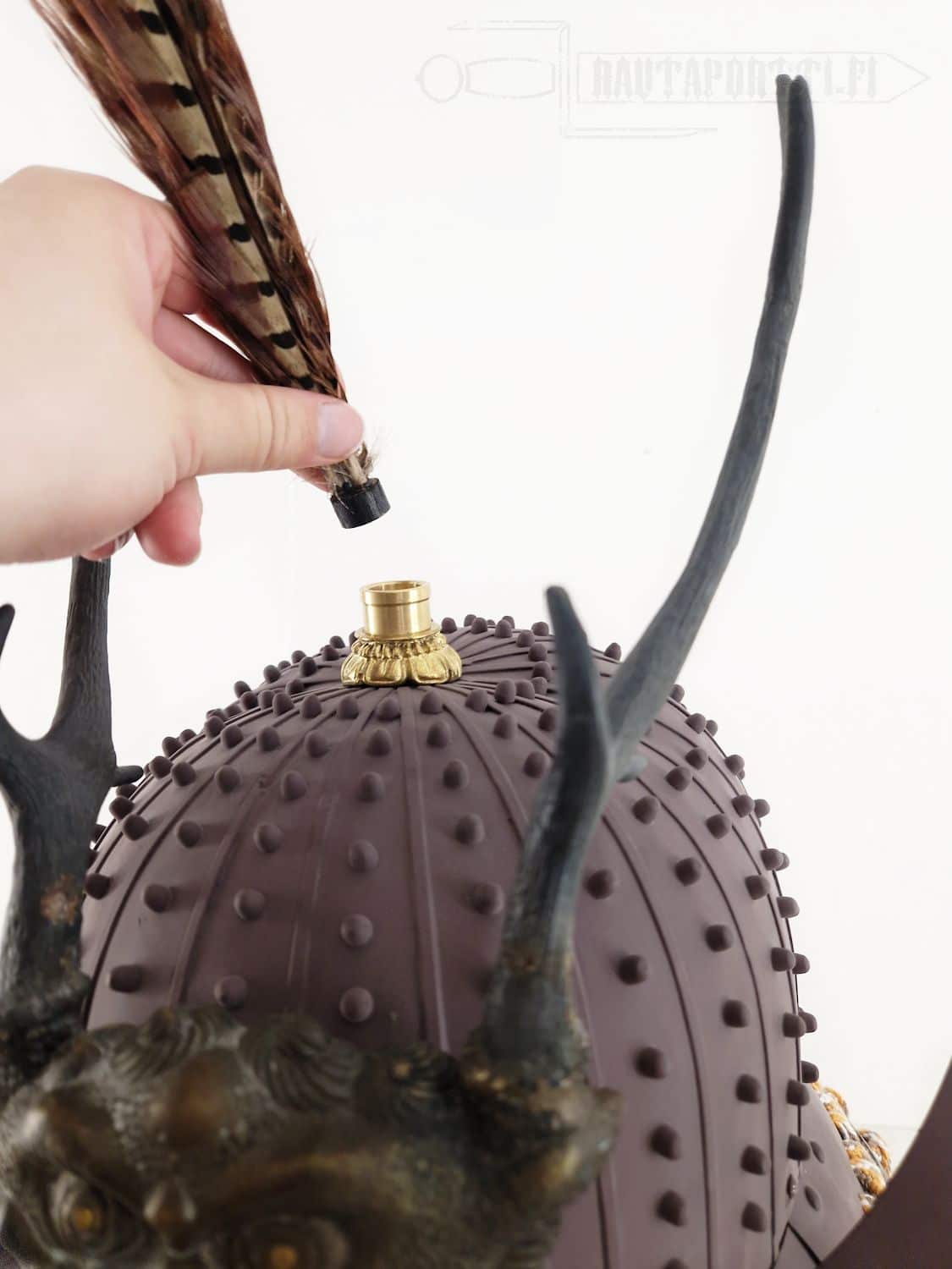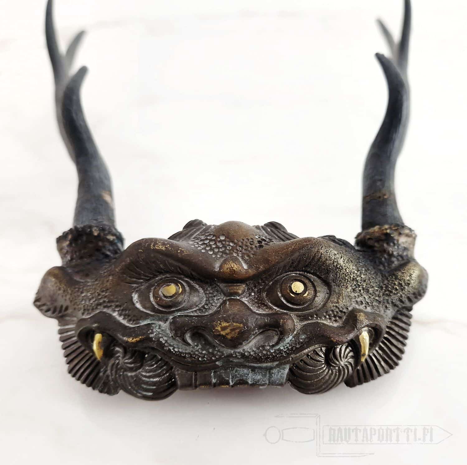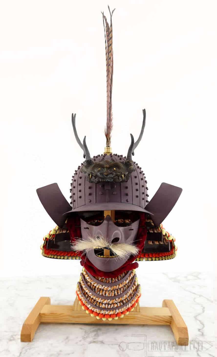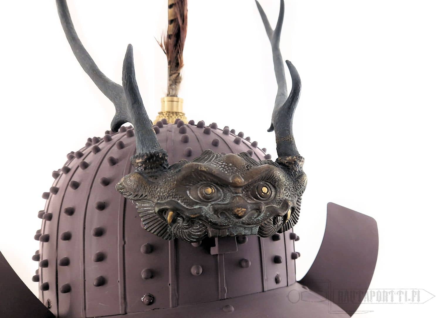 Menpo, kasvoja suojaava teräksinen naamio, on erillinen iroitettava kappale, joka kiinnitetään paikoilleen kasvoja suojaamaan solmimalla se kypärään paksuilla kiinnitysnaruilla. Menpon viikset on tehty aidoista hevosen jouhista. Kypärän otsaa koristava sarvekas Oni demoni on tehty umpimessingistä ja sen pinta on antikoitu kypärään sopivaksi. Kypärän laella on aidoista fasaaninsulista tehty töyhtö. Sekä sulkatöyhdön että demonin saa halutessaan irroitettua. Kypärän mukana tulee puinen teline johon kypärän saa hienosti näytille.