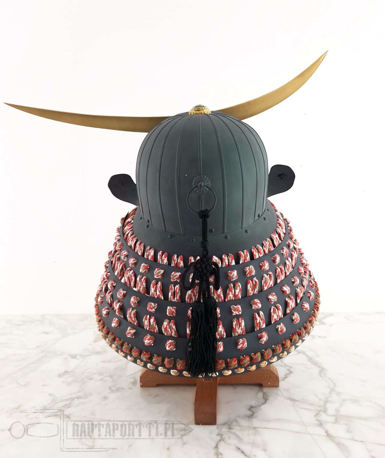 Tämän kypärän yksi kohokohta on irroitettava kasvoja suojaava menpo-naamio, jossa viikset on tehty aidoista hevosen jouhista. Kypärän otsaa koristaa Date Masamunen ikoninen kuunsirppi, joka on valmistettu kiiltävästä messingistä. Tämä näyttävä otsakoriste on irroitettava. Kypärän mukana tulee puinen teline johon kypärän saa hienosti näytille.