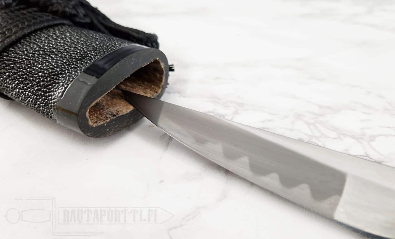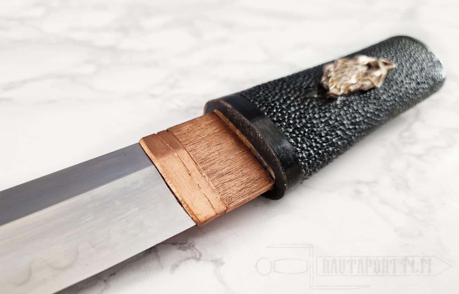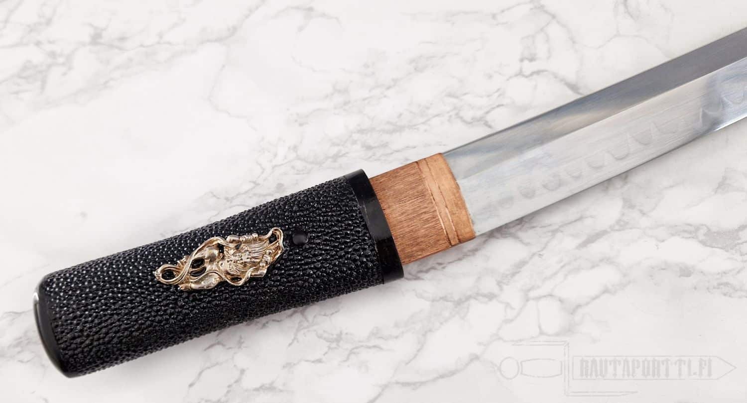 - Aikuchi-tyylinen kahva, jossa musta rauskun nahka ja yksilölliset hopeiset menukit