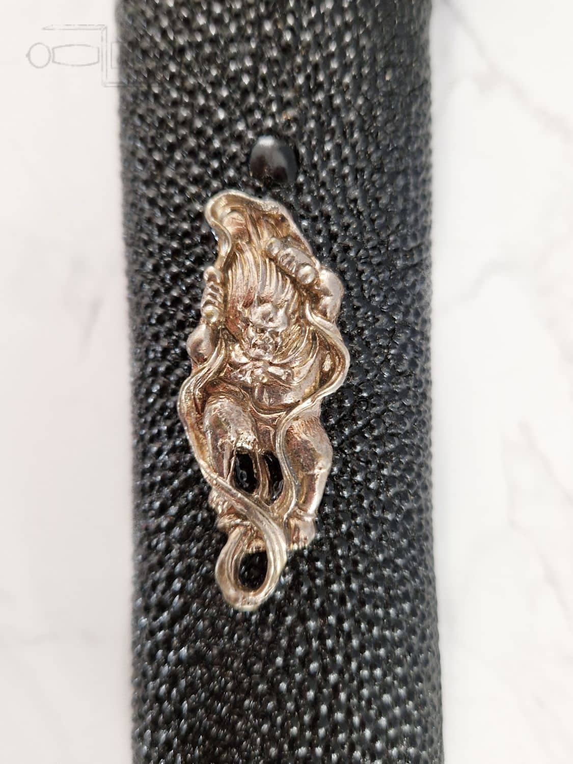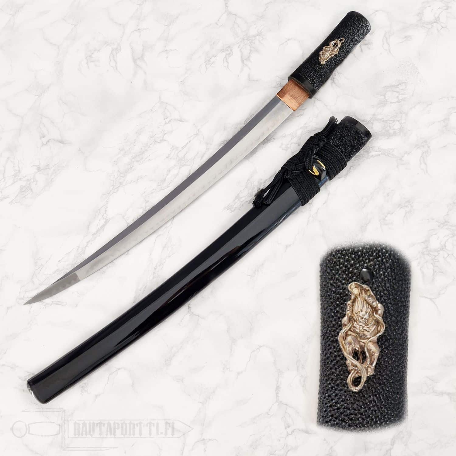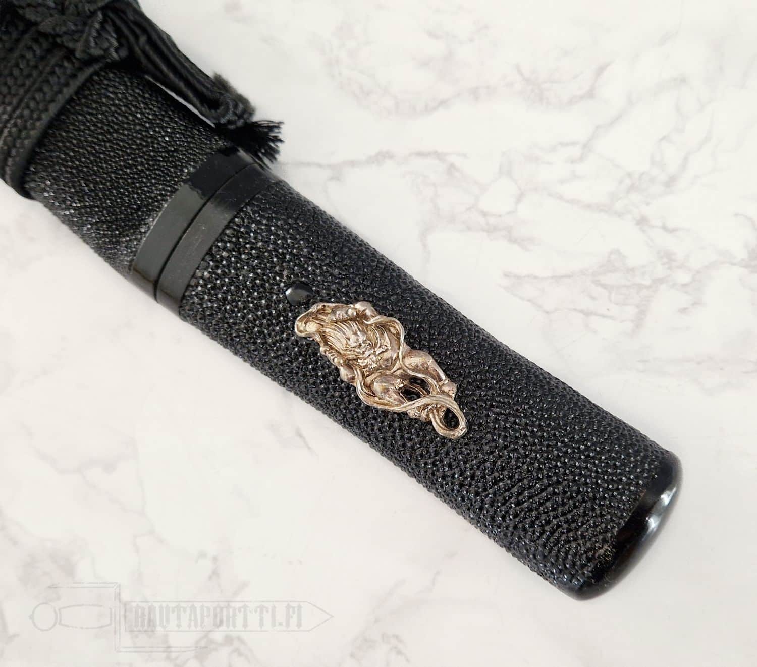 - Aikuchi-tyylinen kahva, jossa musta rauskun nahka ja yksilölliset hopeiset menukit