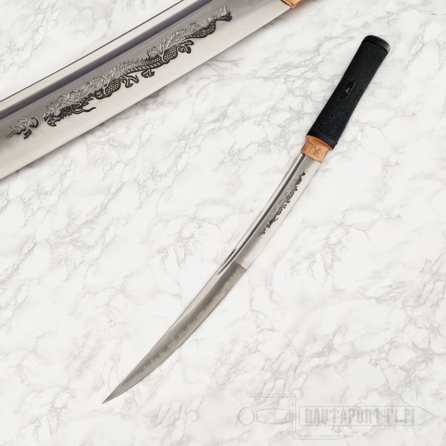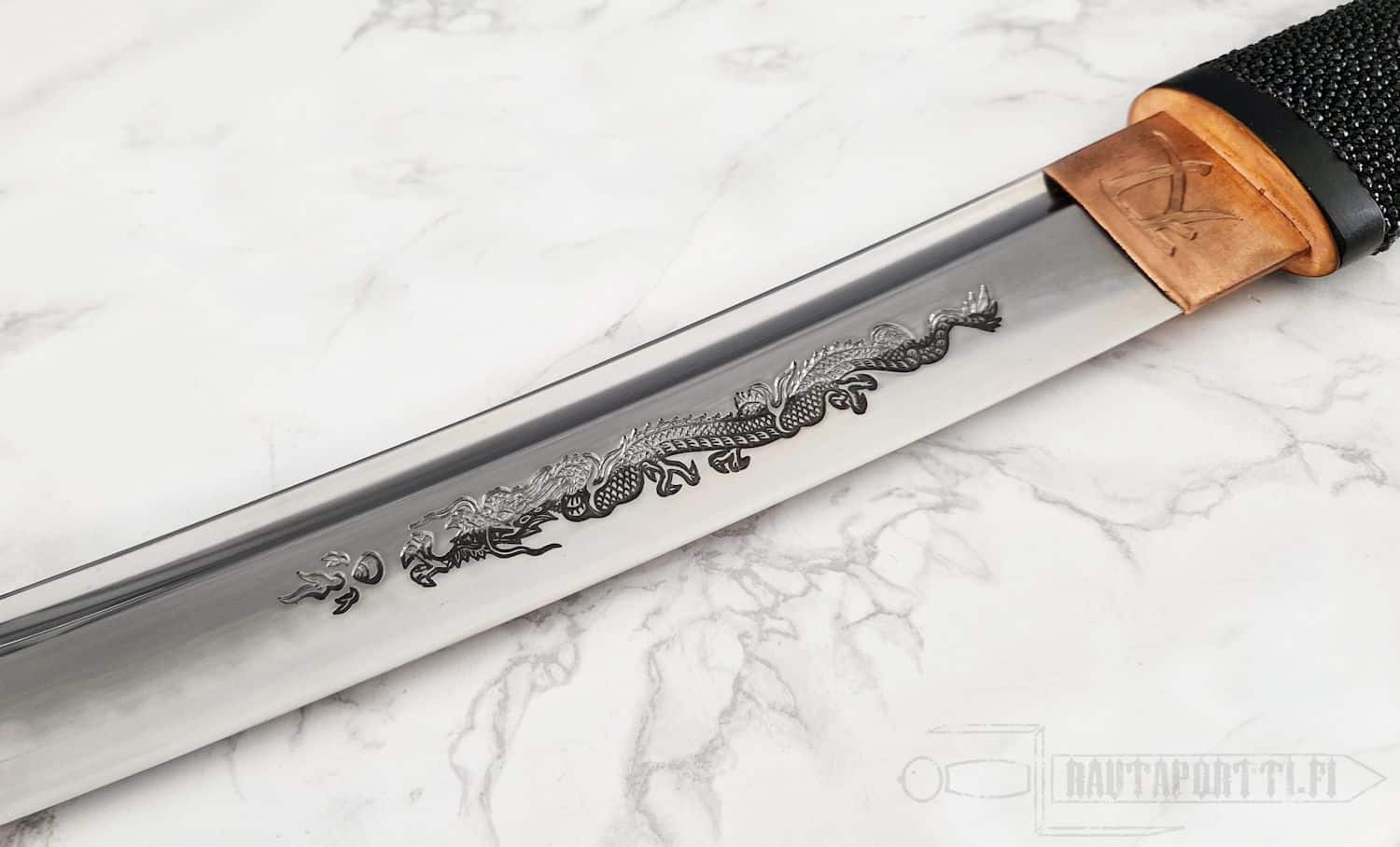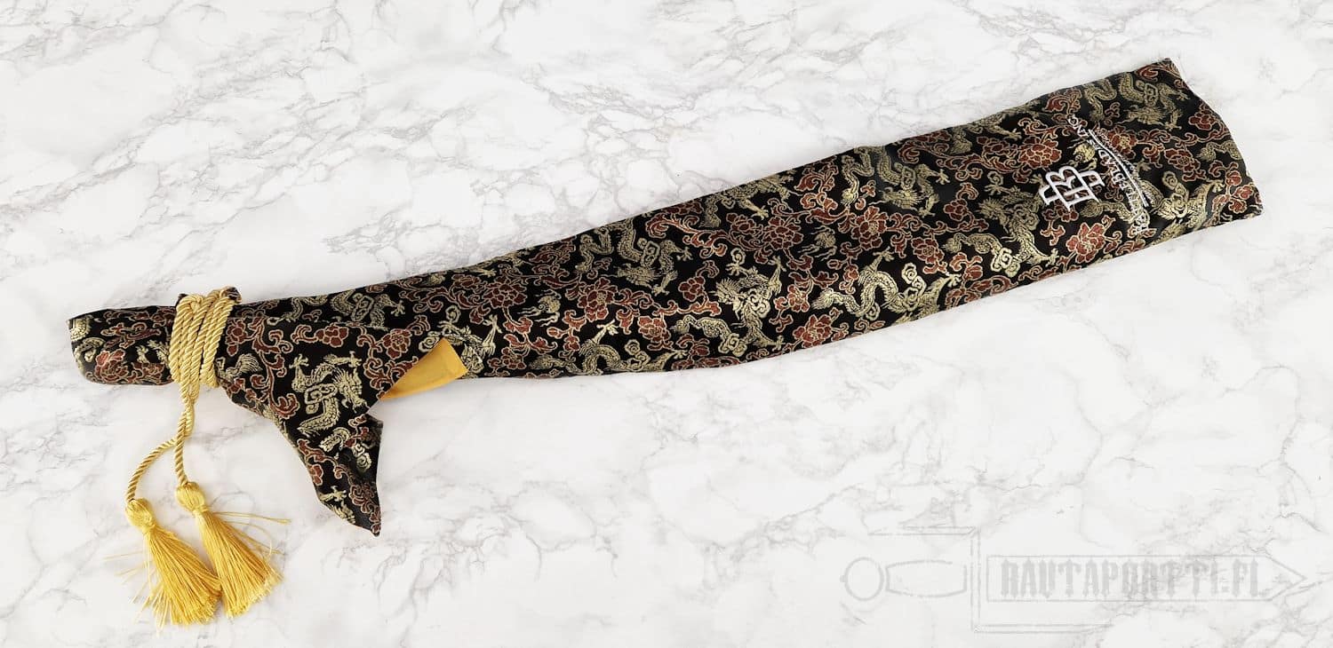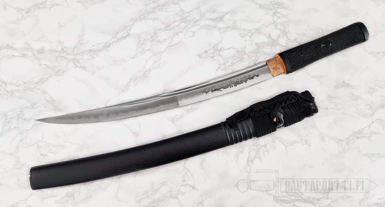 - Terään on käsin kaiverrettu yksityiskohtainen lohikäärmekaiverrus (horimono)