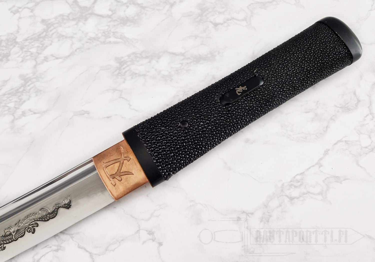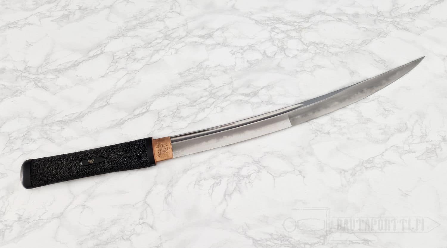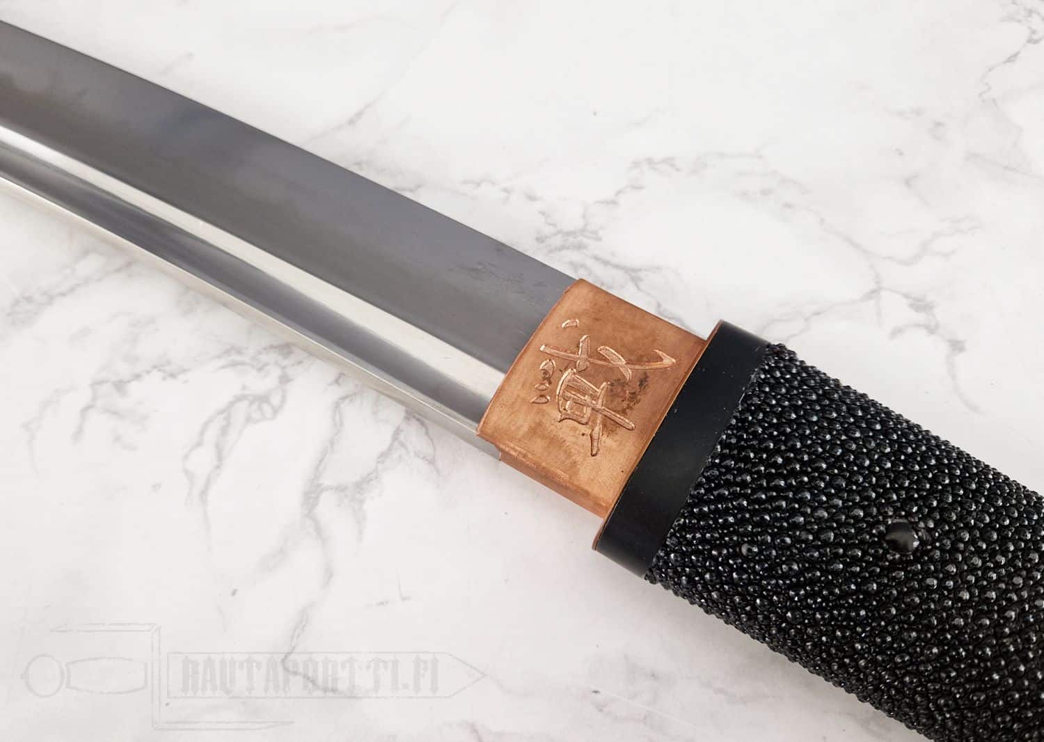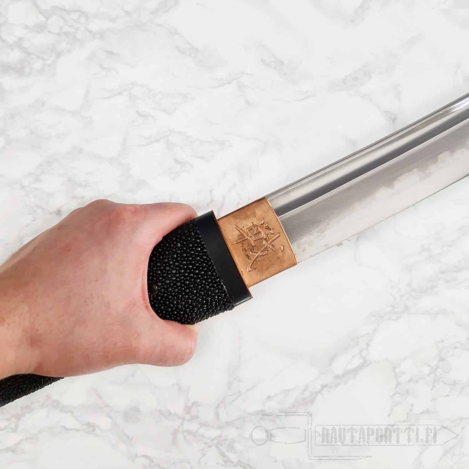 - Kuparinen habaki, jossa kaiverrettuna japanilaiset BattleBlades-kanjit