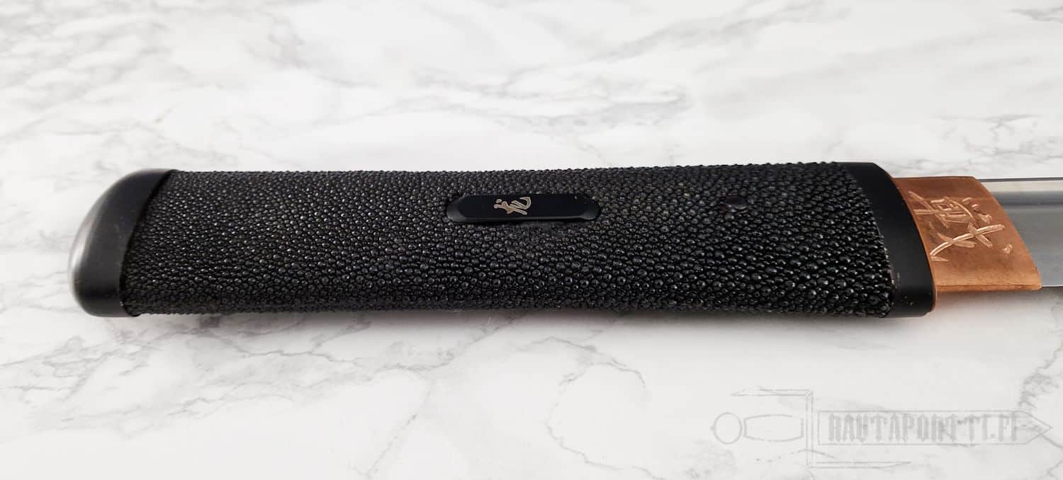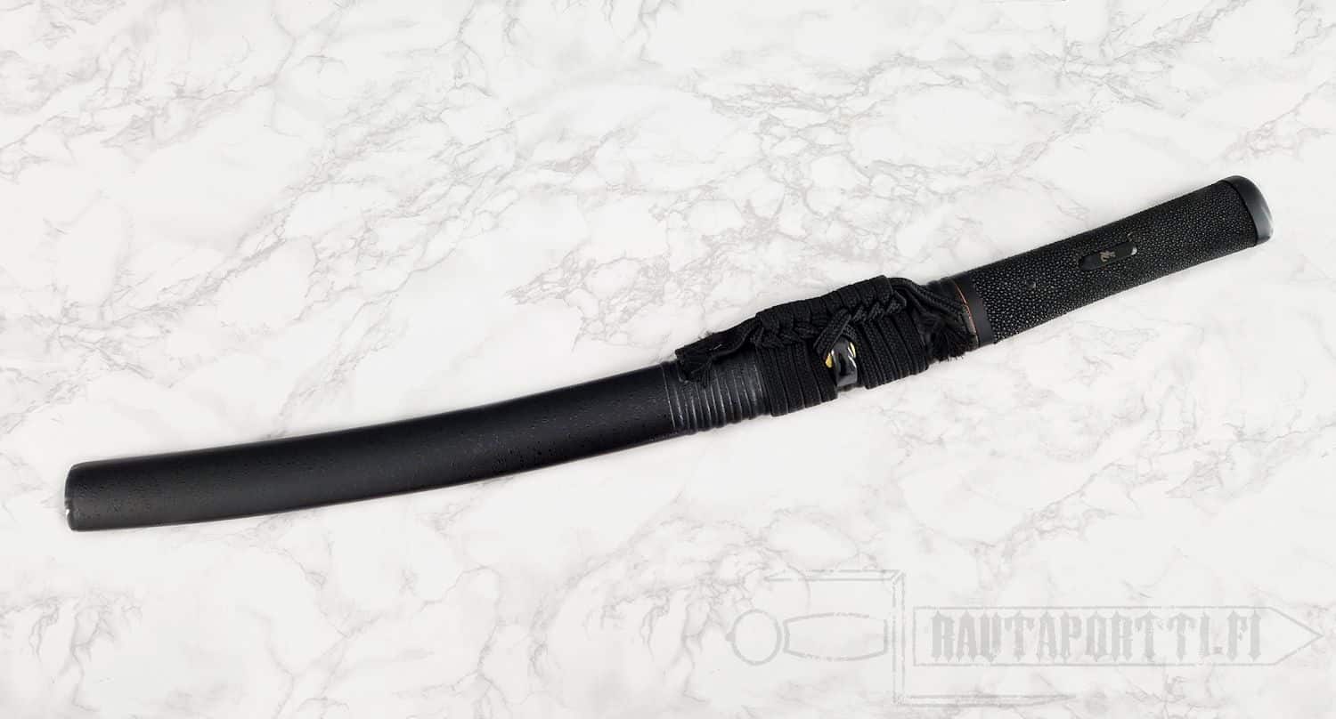 Kahva (tsuka) on kovapuuta ja päällystetty kauttaaltaan aidolla rauskun nahalla, mikä takaa pitävän otteen. Käsintehty kuparinen habaki on kaiverrettu japanilaisilla kanji-merkeillä, jotka tarkoittavat "BattleBlades". Mustaksi käsitellyt fuchi ja kashira ovat rautaa. Miekan saa suojaan täysin mustaan lakkapintaiseen saya-tuppeen, jota koristavat aidot puhvelinsarviosat (kojiri, koiguchi, kurikata) ja jonka viimeistelee musta silkkinen sageo.
