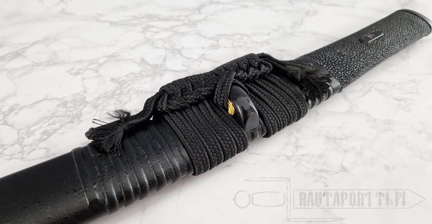 - Kashira, fuchi ja menuki: Mustaksi viimeistelty rauta (käsin viimeistelty)