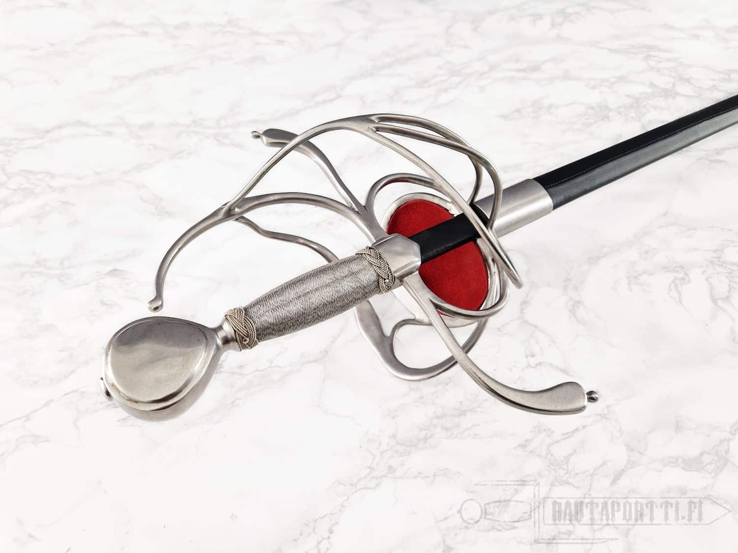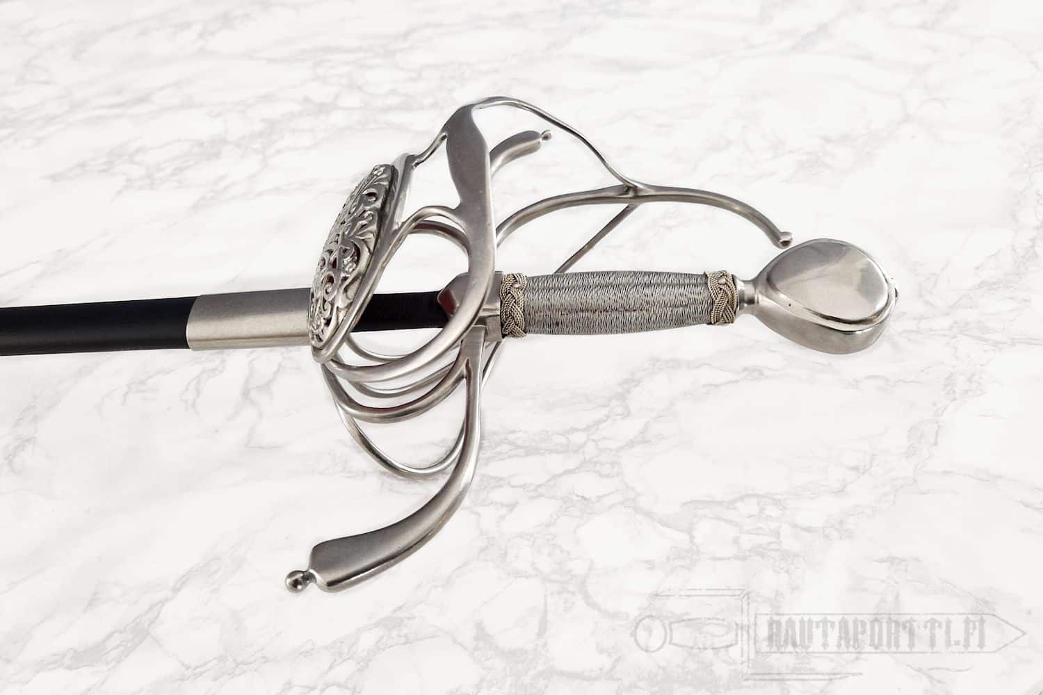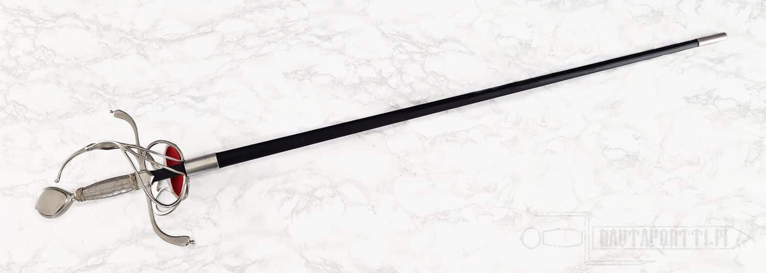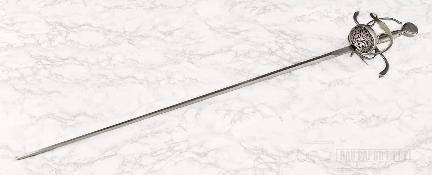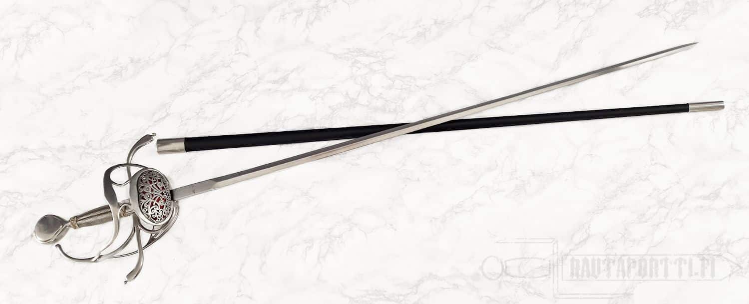 Kättä suojaavan korikahvan pohjaa koristaa avoin kukkakuviointi. Miekan terä on epätavallisen kapea rapiiriksi, mikä tekee tästä miekasta yllättävän nopean ja miellyttävän kevyen aseen. Kahva on päällystetty teräspunoksella. Koristeelliset teräspunokset erottavat kahvaimen päärynänmallisesta ponnesta ja kättä suojaavista korikahvan väisteistä. Korikahva on saman kokoinen kuin alkuperäiskappaleessa, samoin miekan paino ja tasapaino vastaavat alkuperäistä, mikä saa miekan tuntuumaan autenttiselta. Kuvissa näkyvä, tyyliin sopiva, nahkainen huotra teräsheloilla sisältyy hintaan.
