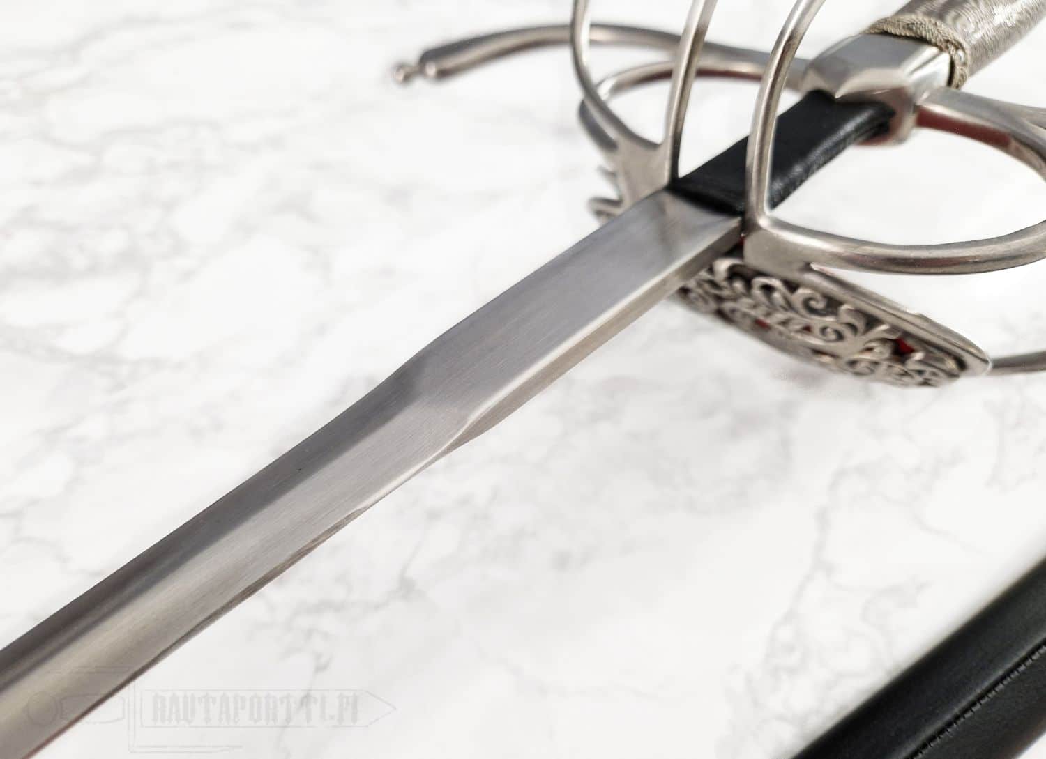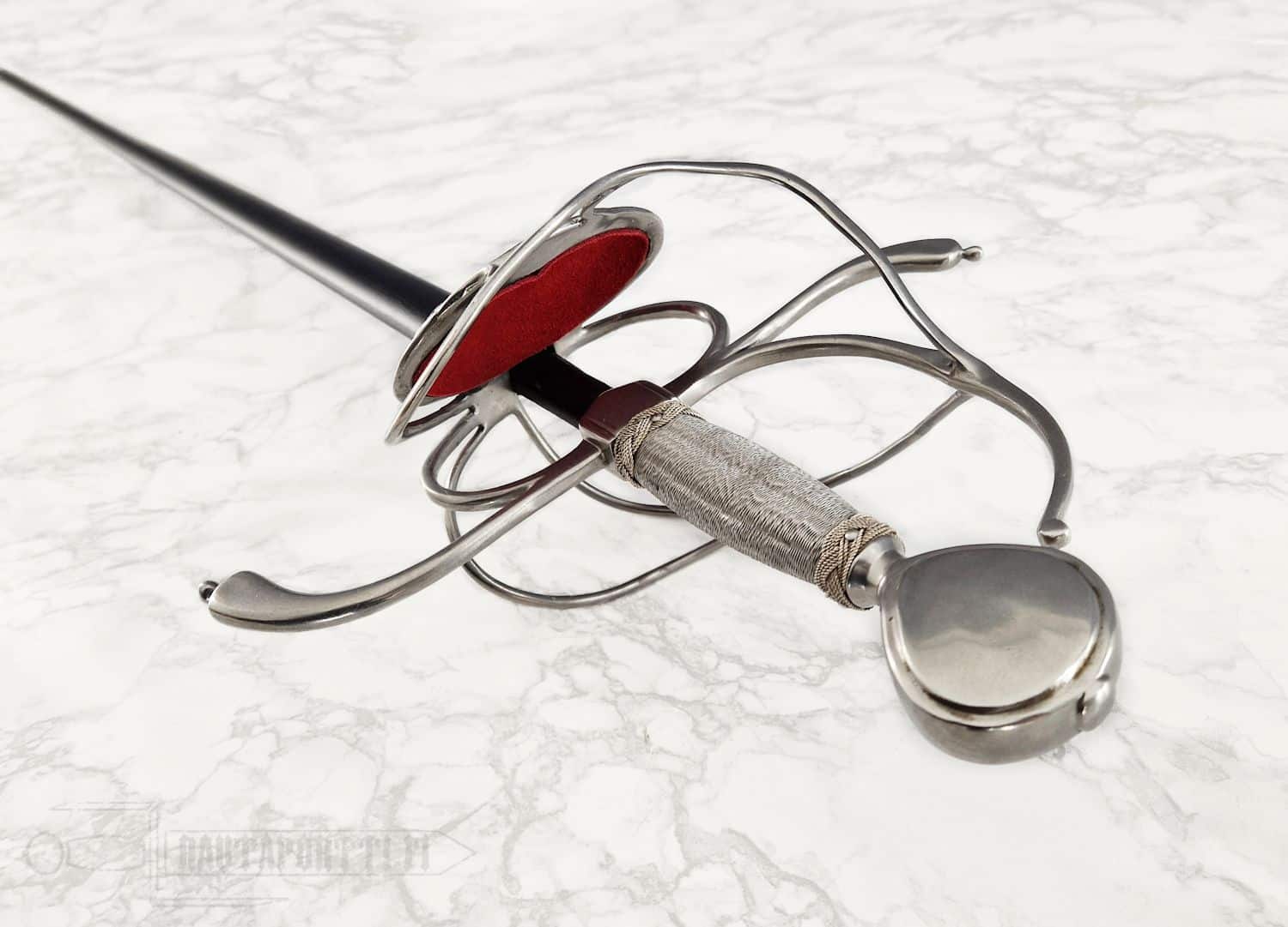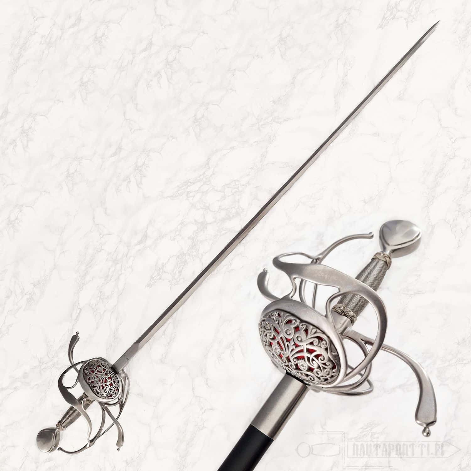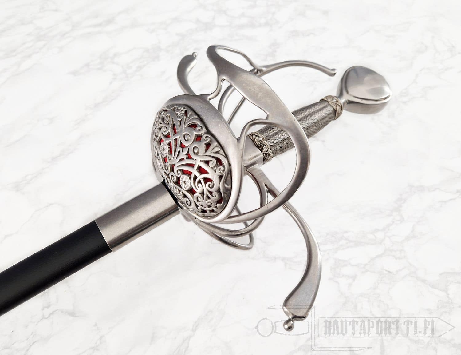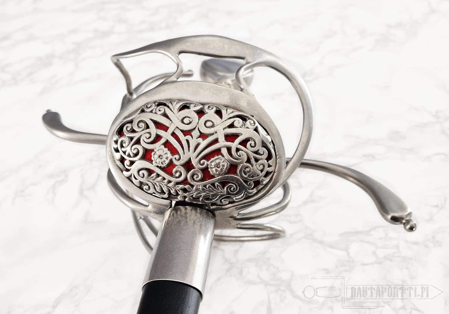 Kättä suojaavan korikahvan pohjaa koristaa avoin kukkakuviointi. Miekan terä on epätavallisen kapea rapiiriksi, mikä tekee tästä miekasta yllättävän nopean ja miellyttävän kevyen aseen. Kahva on päällystetty teräspunoksella. Koristeelliset teräspunokset erottavat kahvaimen päärynänmallisesta ponnesta ja kättä suojaavista korikahvan väisteistä. Korikahva on saman kokoinen kuin alkuperäiskappaleessa, samoin miekan paino ja tasapaino vastaavat alkuperäistä, mikä saa miekan tuntuumaan autenttiselta. Kuvissa näkyvä, tyyliin sopiva, nahkainen huotra teräsheloilla sisältyy hintaan.