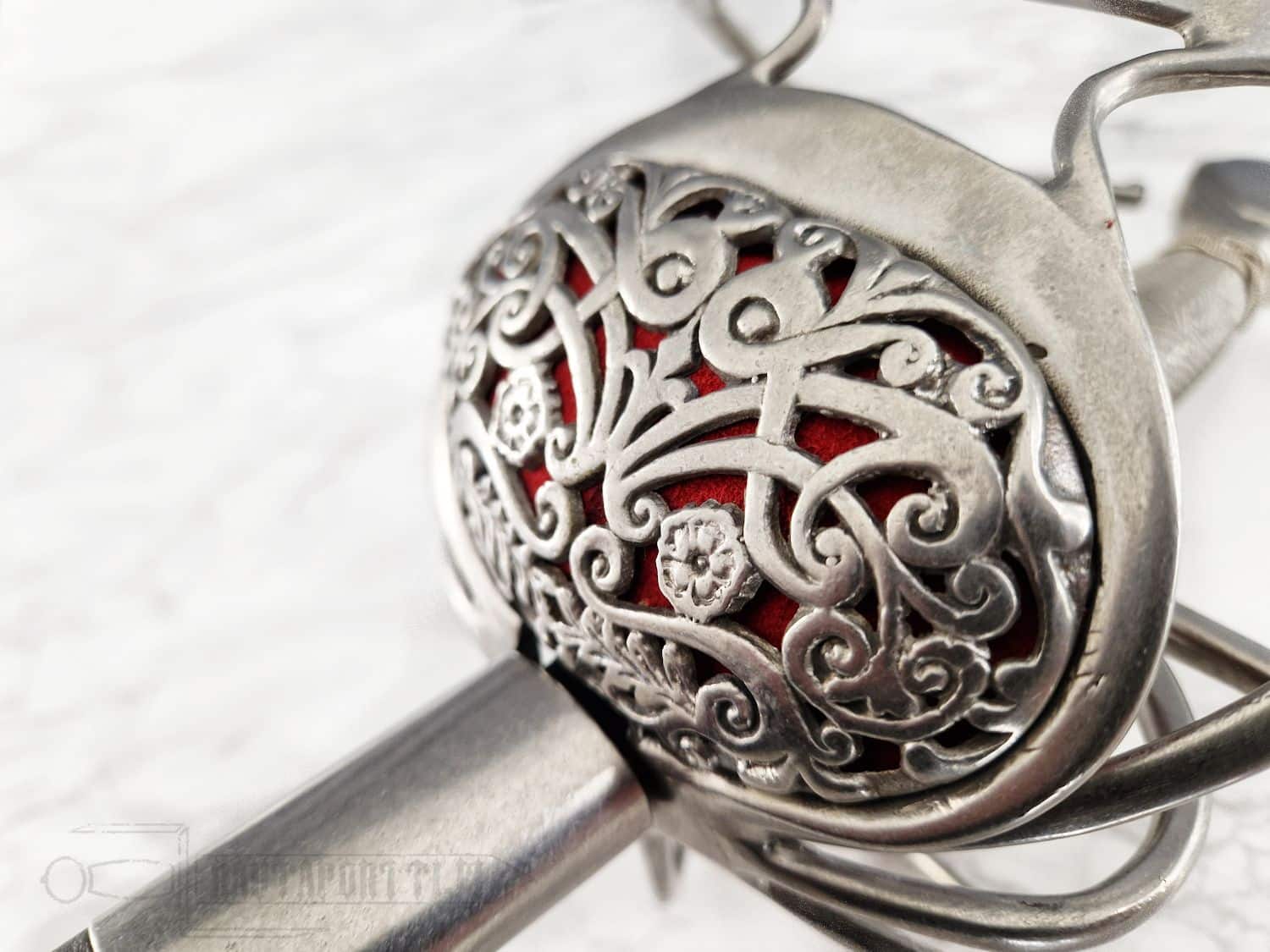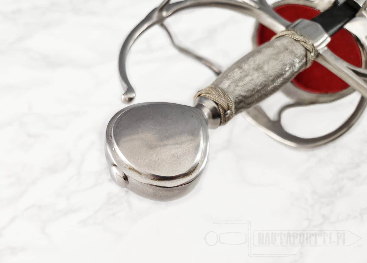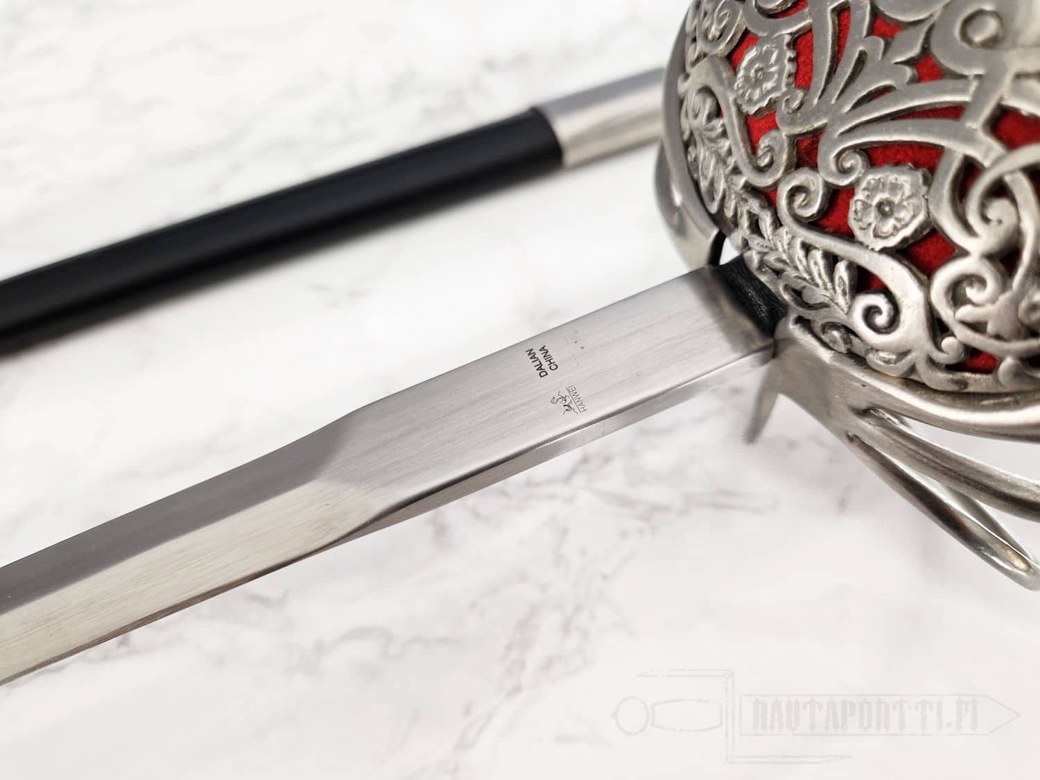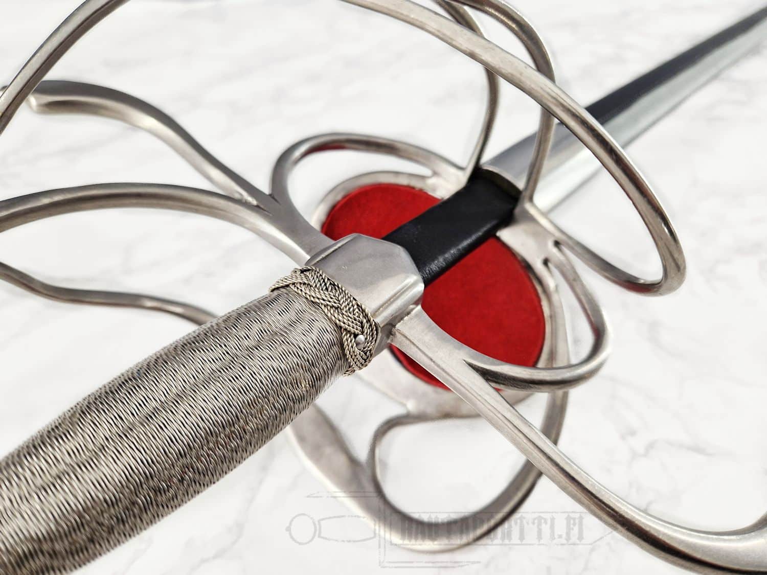 Kättä suojaavan korikahvan pohjaa koristaa avoin kukkakuviointi. Miekan terä on epätavallisen kapea rapiiriksi, mikä tekee tästä miekasta yllättävän nopean ja miellyttävän kevyen aseen. Kahva on päällystetty teräspunoksella. Koristeelliset teräspunokset erottavat kahvaimen päärynänmallisesta ponnesta ja kättä suojaavista korikahvan väisteistä. Korikahva on saman kokoinen kuin alkuperäiskappaleessa, samoin miekan paino ja tasapaino vastaavat alkuperäistä, mikä saa miekan tuntuumaan autenttiselta. Kuvissa näkyvä, tyyliin sopiva, nahkainen huotra teräsheloilla sisältyy hintaan.