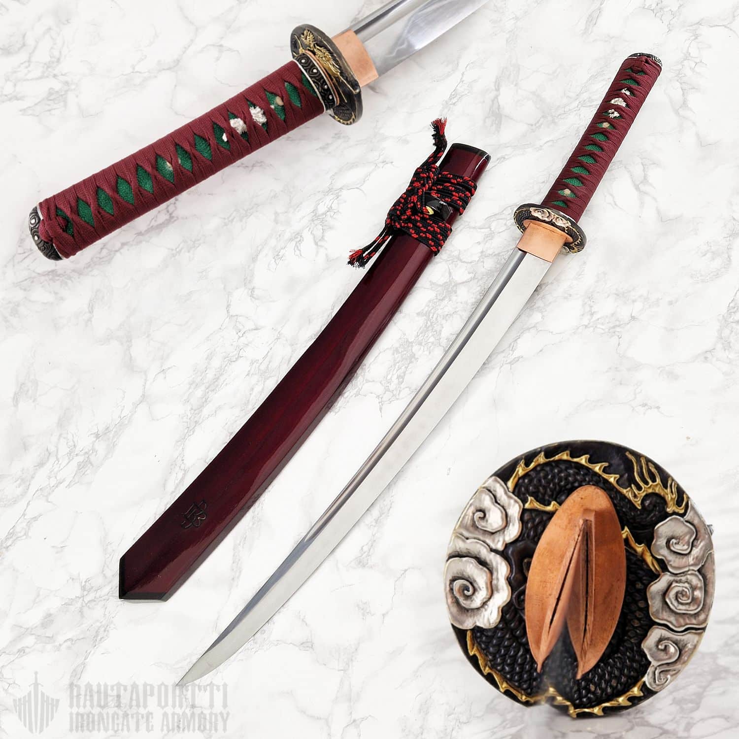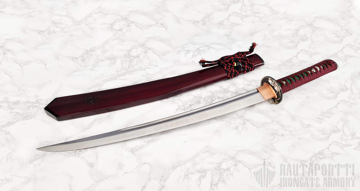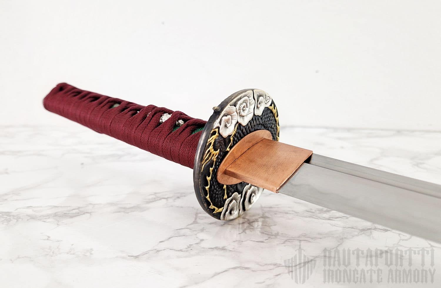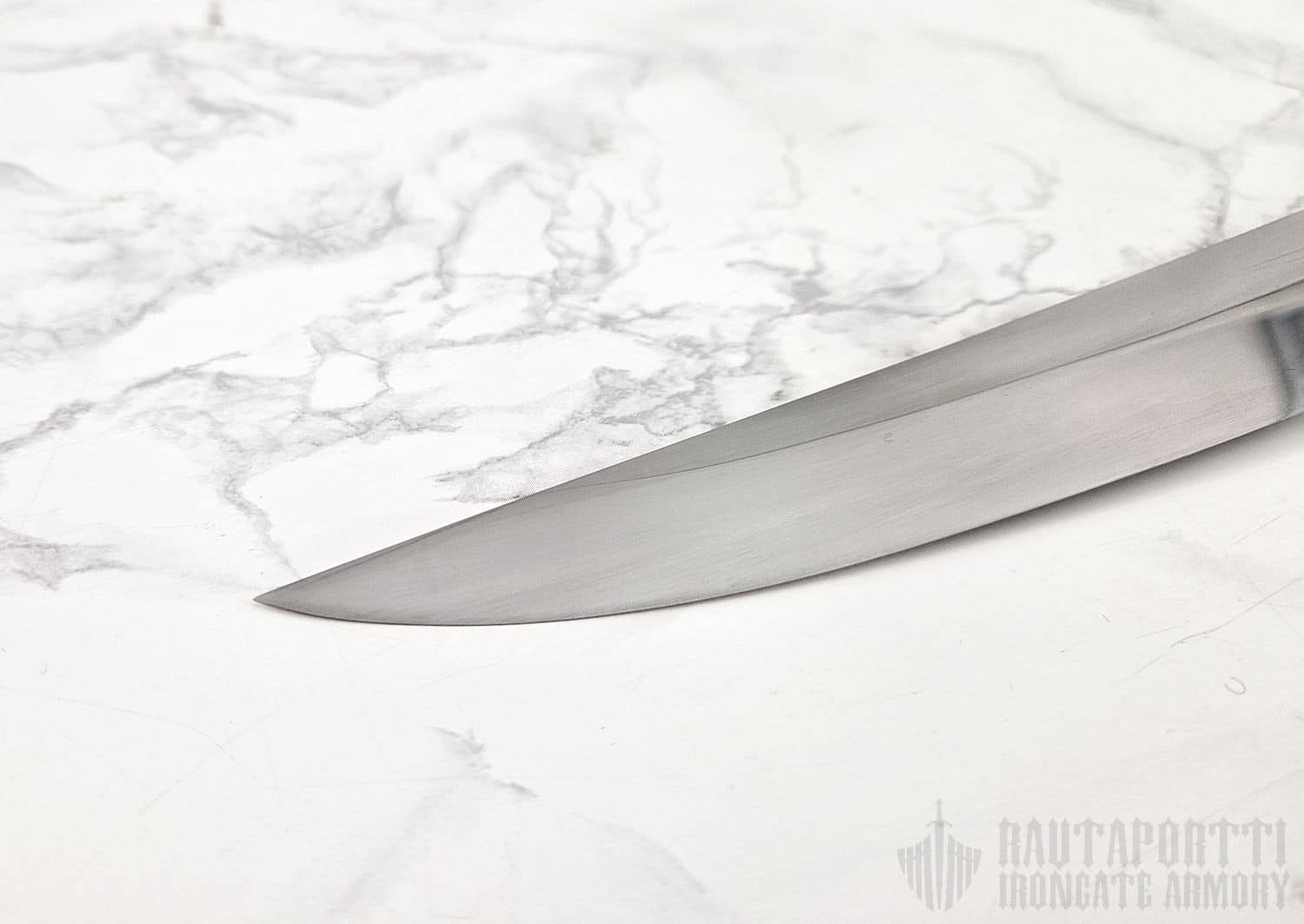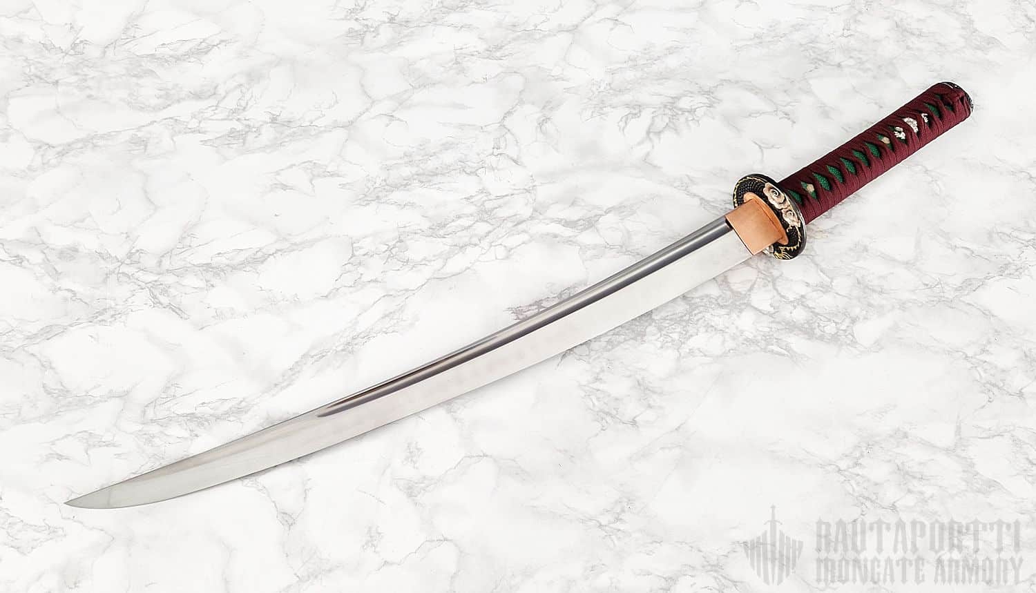 - Terän materiaali / Nagasa: Käsin taottu ja savikarkaistu T10-teräs