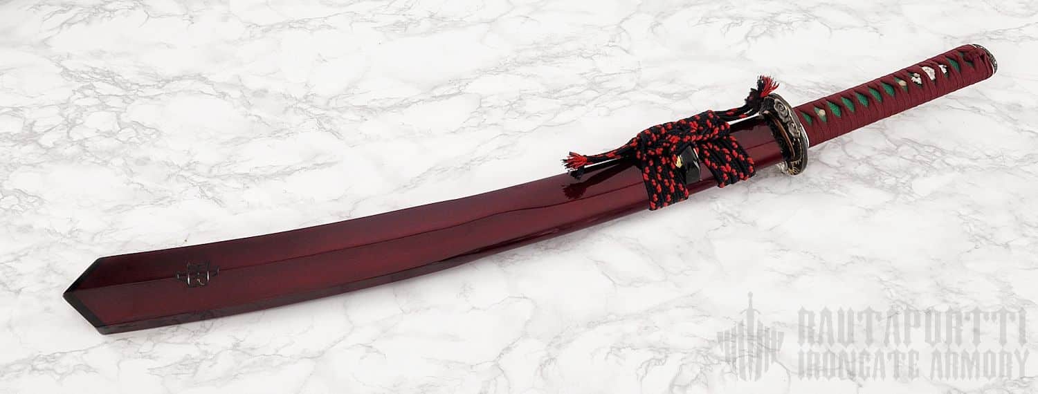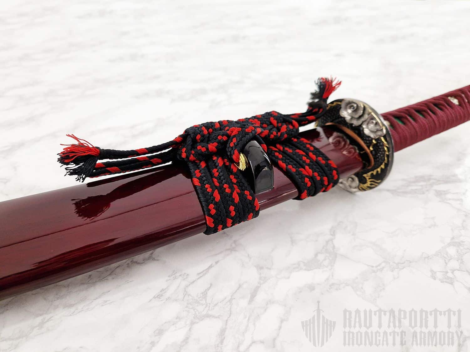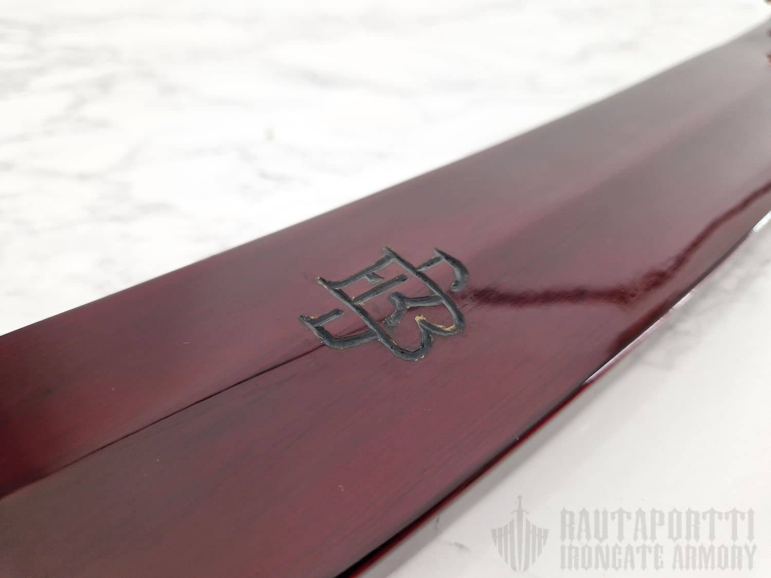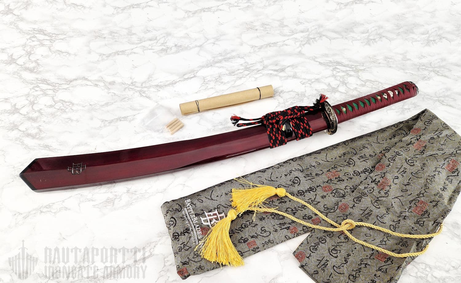 Huotra on todellinen taidonnäyte: majavan hännän muotoinen, punaiseksi värjätty ja useaan kertaan lakattu kovapuinen saya, joka on huolellisesti kaareutettu vastaamaan miekan sori-kaarevuutta. Koiguchi ja suuri kojiri on valmistettu aidosta puhvelinsarvesta, ja viimeistelynä toimii käsin kaiverrettu ja maalattu BattleBlades-logo. Punamusta silkkinen sageo sitoo kokonaisuuden yhteen.
