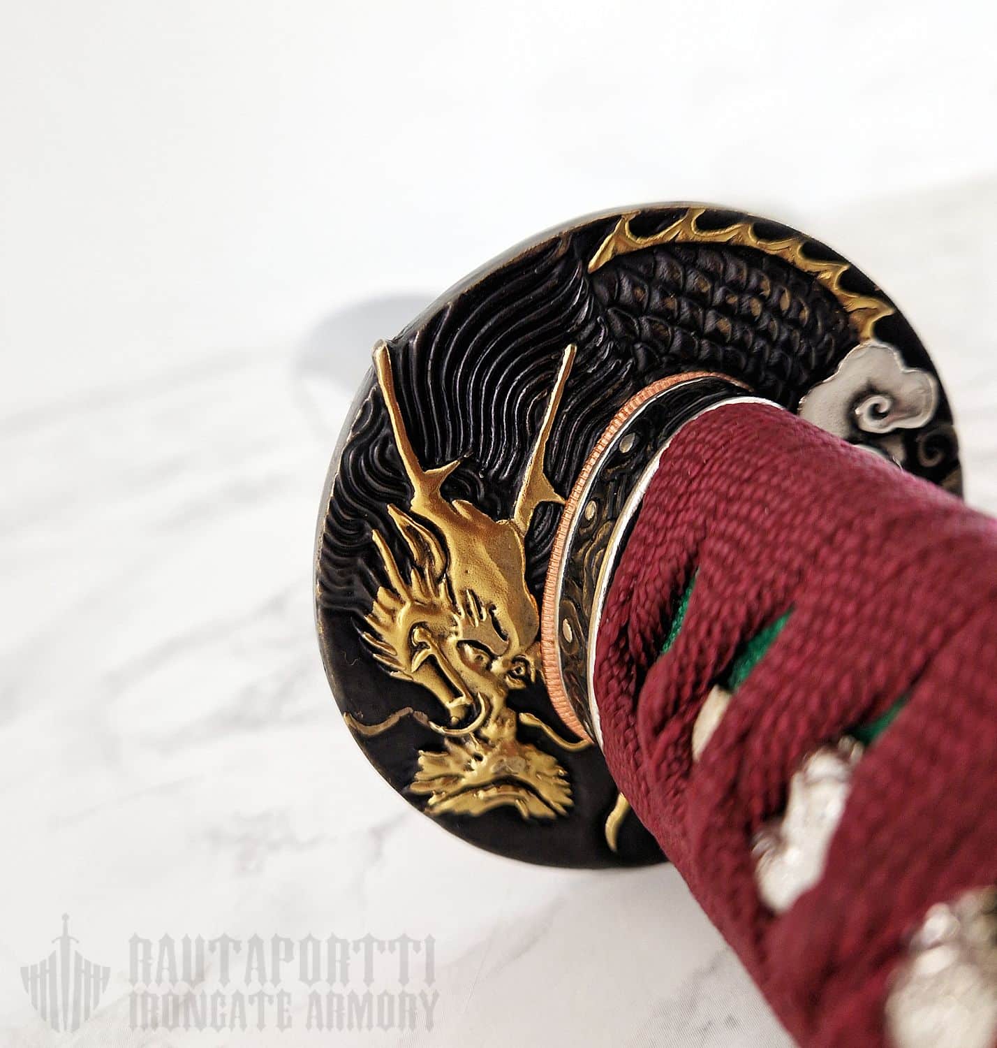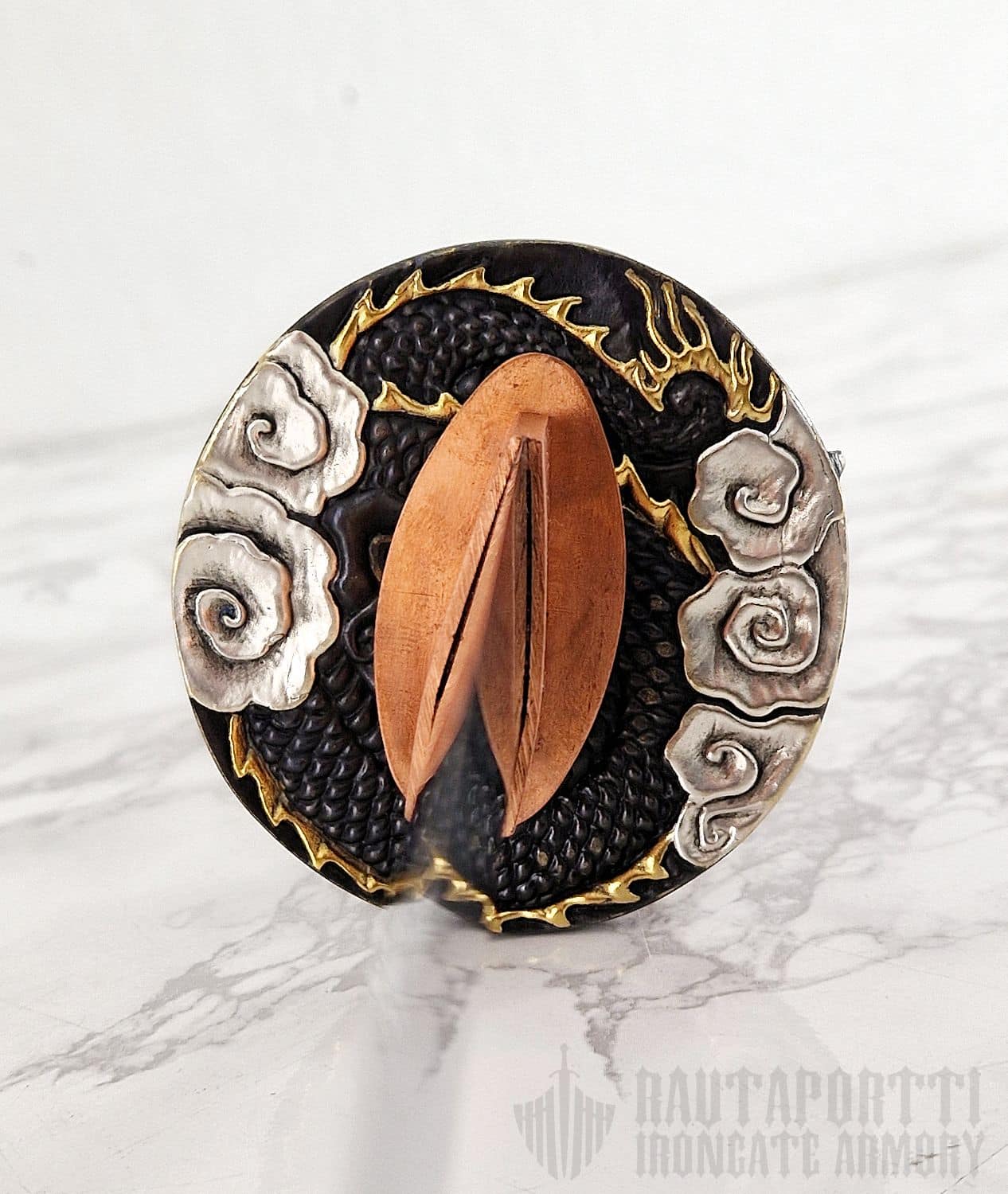 - “Savusta sukeltava lohikäärme”-aiheiset kupariset tsuba, fuchi ja kashira