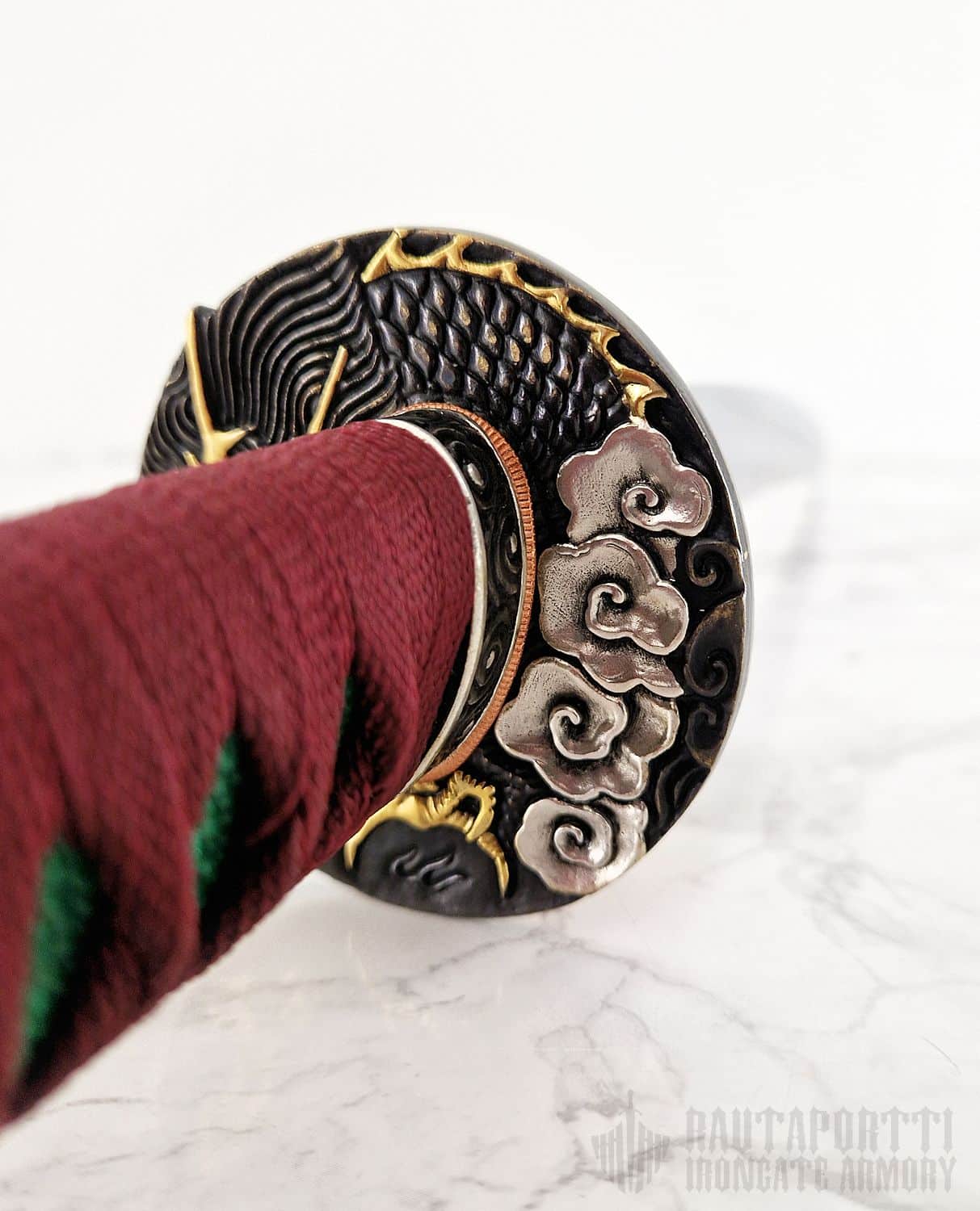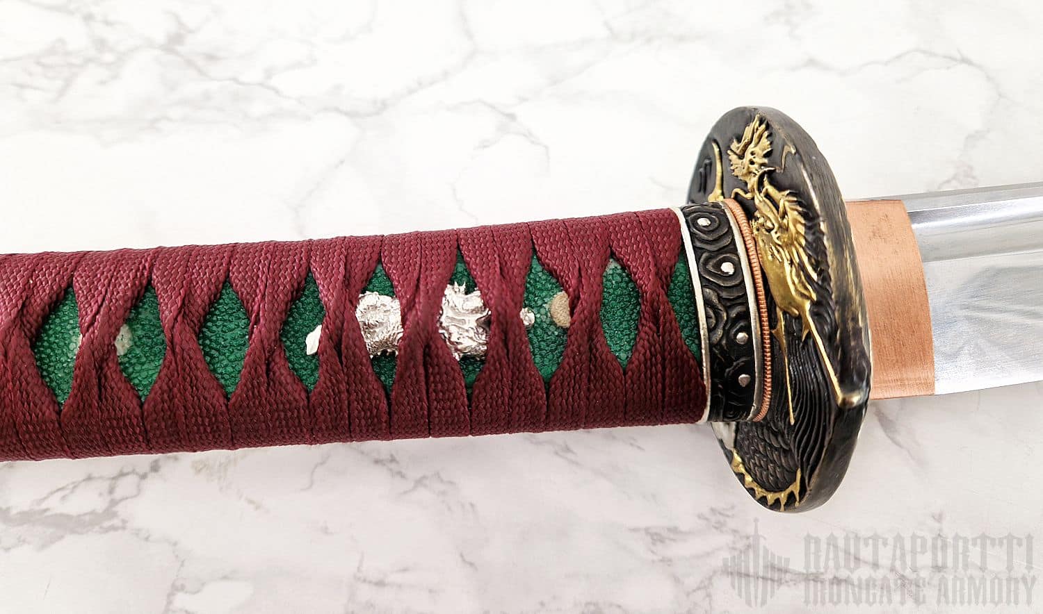 Paksusta nakagosta (ruodista) huolimatta kahvassa on säilytetty perinteinen Rikko-tiimalasimuoto. Kovapuinen kahva on päällystetty smaragdinvihreällä aidoilla rauskun nahalla, koristeltu hopeisilla menukeilla ja sidottu syvän viininpunaisella silkkipunoksella. Fuchi, kashira, tsuba, habaki ja seppa-levyt on valmistettu kuparista, luoden tyylikkään kontrastin ja korostaen miekan värimaailmaa. Lohikäärme & savu -aiheinen tsuba täydentää kokonaisuuden.