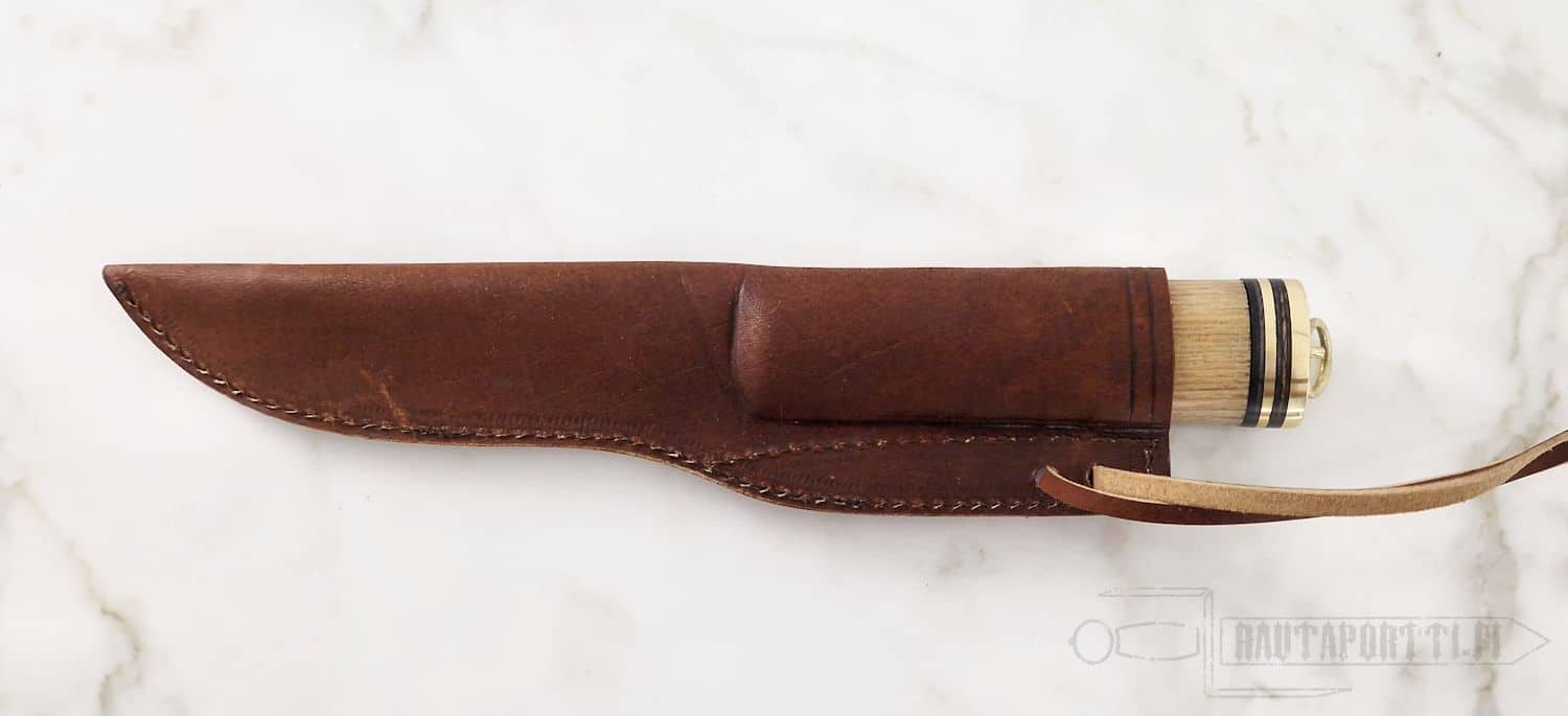Täytyy sanoa että näiden Karhunhammas – veitsien terävyys on kyllä parantunut. Aikaisemmin tilaamani Rajaseudun veitsi ei ollut saapuessaan kovinkaan terävä, jouduin teroittamaan sen jälkikäteen uudelleen. Mutta tämän puukon terävyys on jo toista luokkaa, en nähnyt uudelleenteroitukselle tarvetta. Lisäpisteitä tulee reilun kokoisesta kahvasta, on helppo työskennellä kun ote pitää. Kahvan perässä on turhan oloinen rinkula, ilmeisesti hihnan kiinnitystä varten. Itse olisin pärjännyt ilmankin.