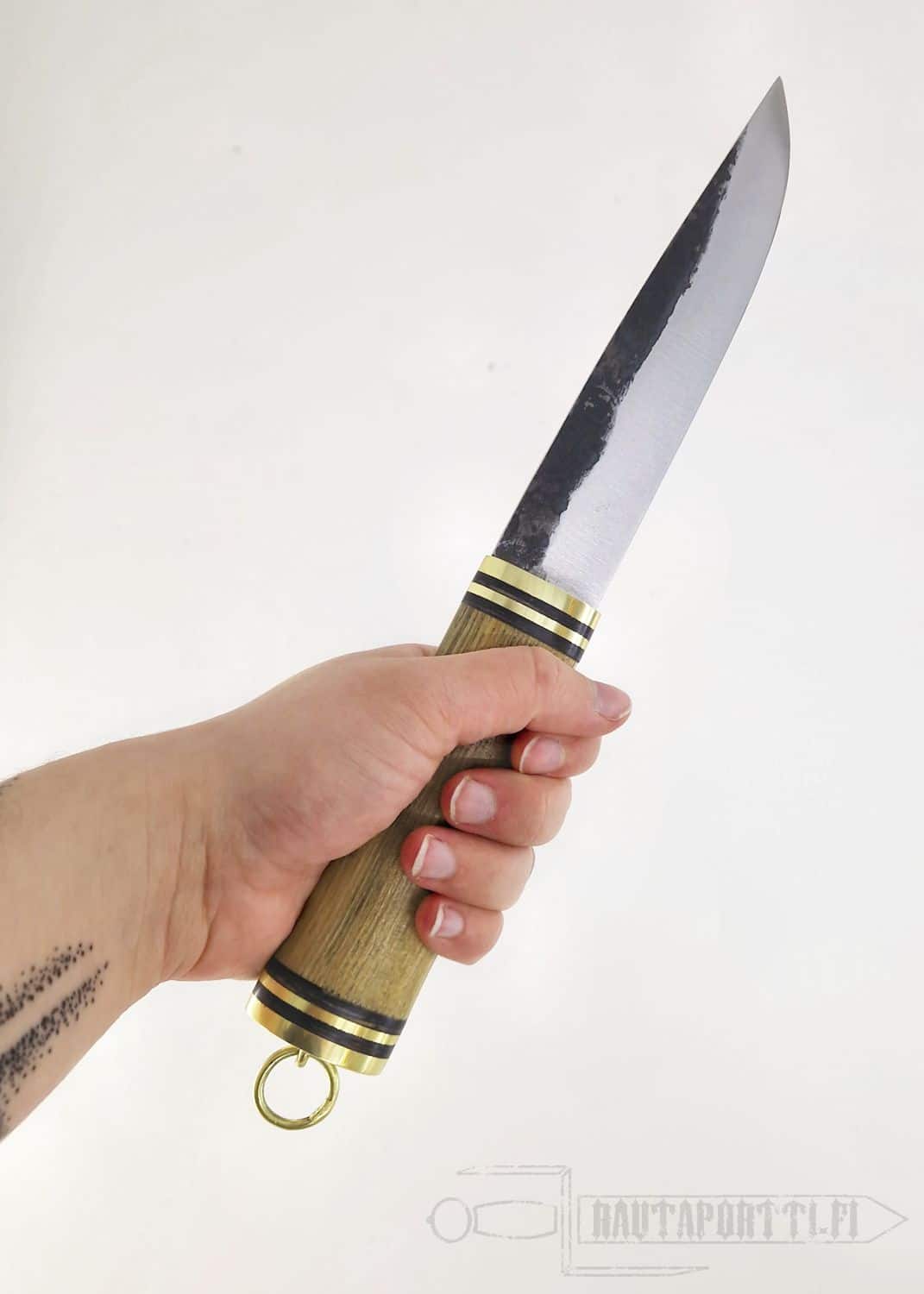 Tämä iso rautakauden puukko on jykevä mutta silti mukava työkalu, tehty käytettäväksi. Se on 100% käsintehty tuote ja jokaisella esineellä on ainutlaatuiset pienet eronsa muihin kappaleisiin. Yleisilme, tuntuma ja koko ovat kuitenkin samat jokaisella kappaleella.