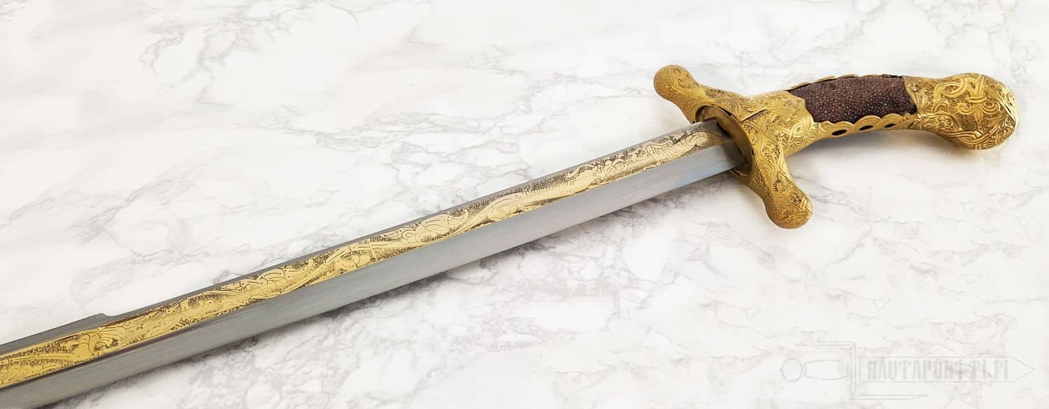 Meidän versiomme tästä sapelista on uskollinen sen alkuperäiselle versiolle, ja siksi siitä on jätetty pois 1400-luvun koristeelliset korjaukset, jotka tekivät miekan käytännössä käyttökelvottomaksi. Korkean hiiliteräksen terä on koristettu kullatulla veriuralla ja yksityiskohtaiset kaiverrukset ovat kuten alkuperäisessäkin. Kahvan rakenne vastaa alkuperäistä; kahvain on päällystetty rauskunnahalla ja messinkiset helat on kullattu. Kullattu ponsi tasapainottaa sapelin kauniisti. Sapelin mukana toimitetaan puinen nahalla päällystetty huotra, jonka kullatut messinkihelat ovat kahvan kanssa yhteensopivat.