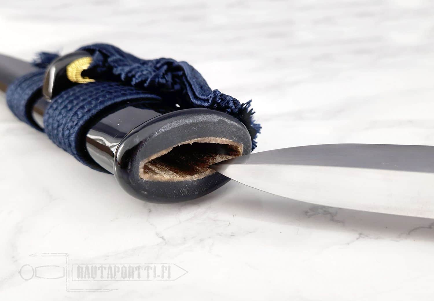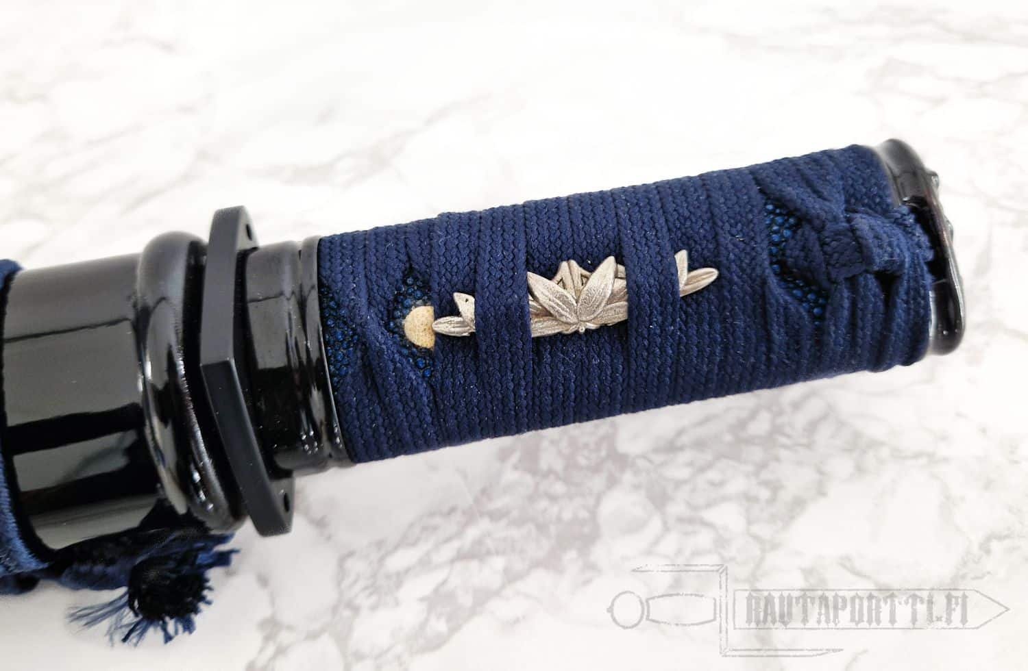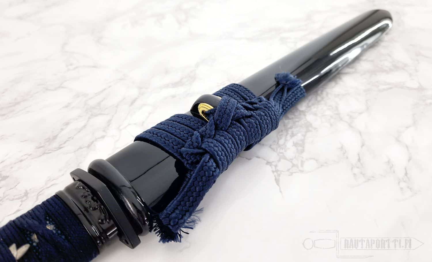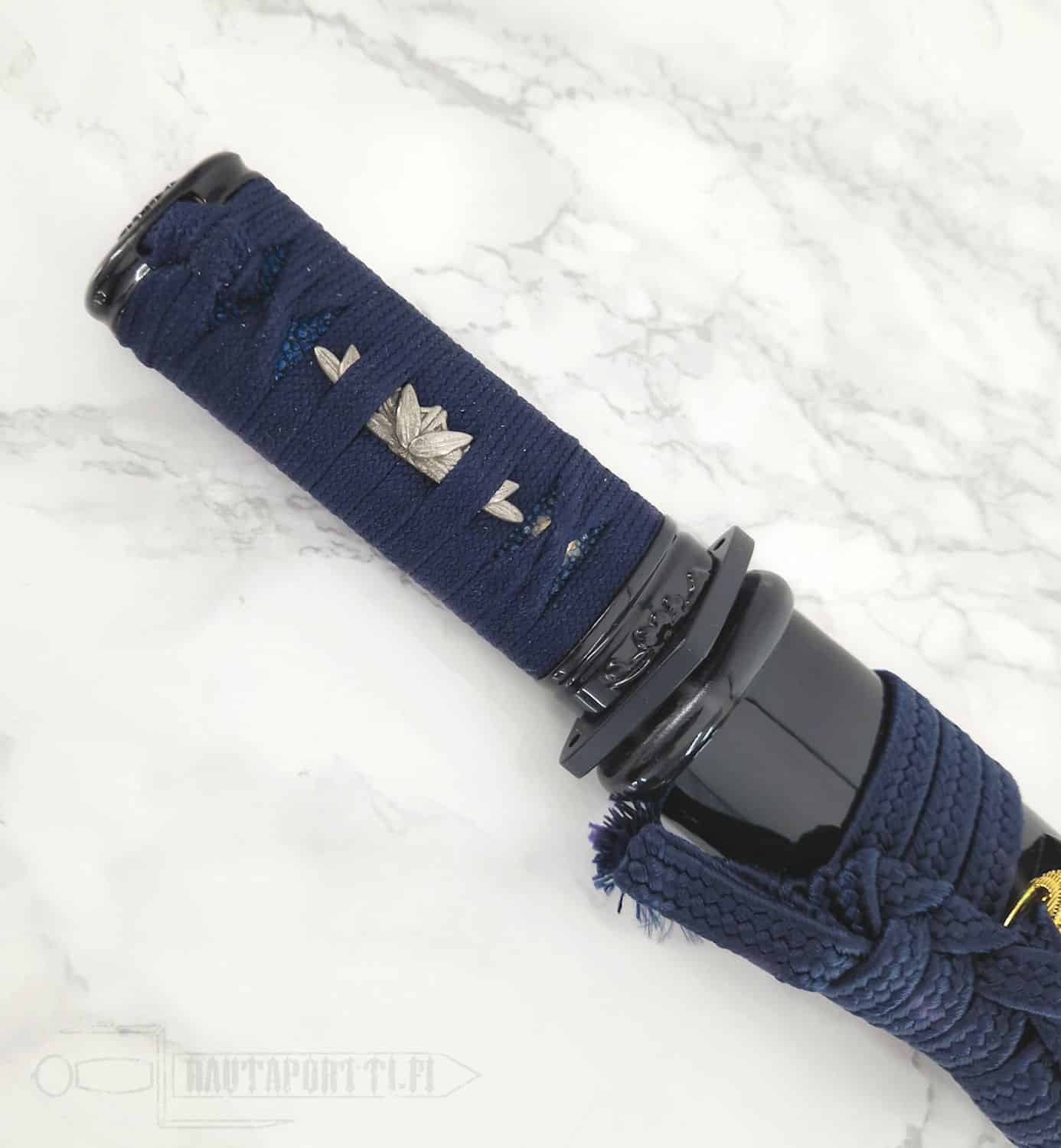 - Yönsininen puuvillapunonta ja aito rauskun nahka kahvassa