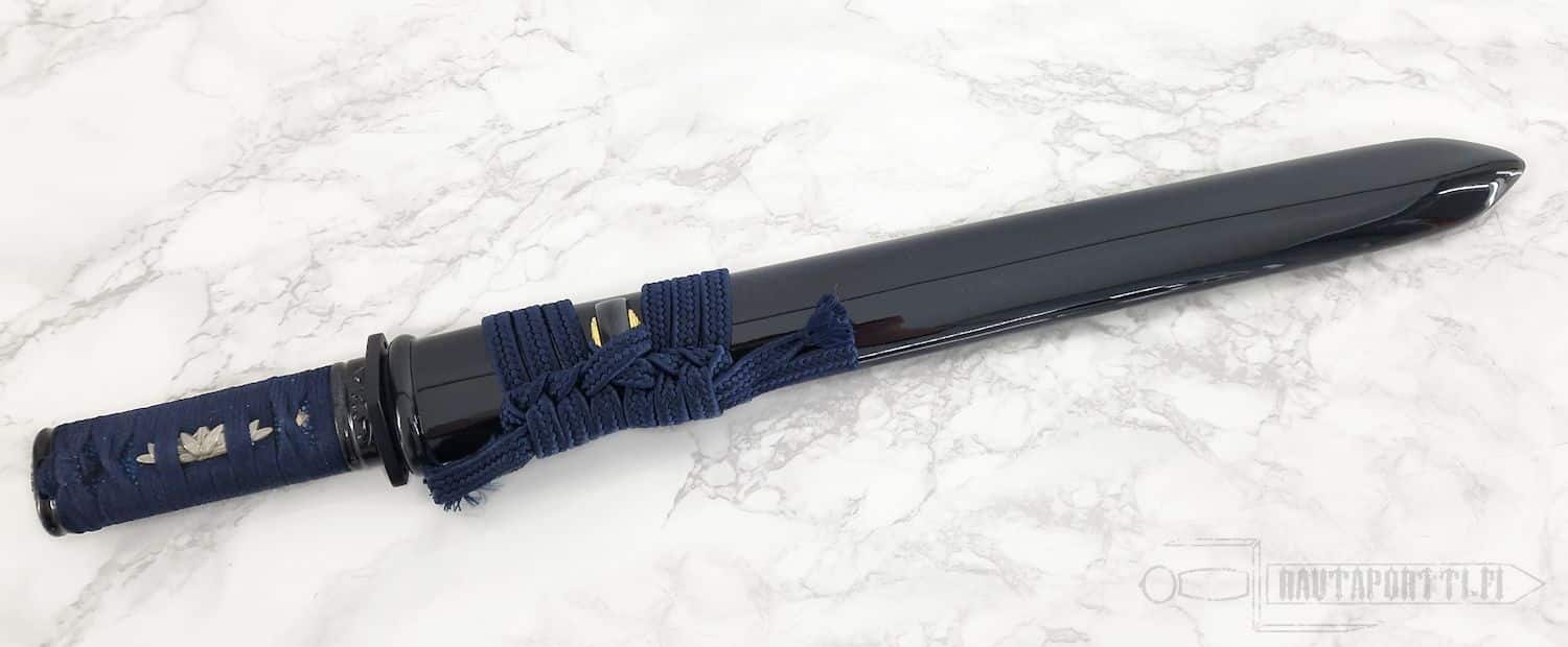 Kage No Senshi Tsurugi Wakizashi erottuu ainutlaatuisella, timantinmuotoisella rautaisella tsuballa, joka säilyttää perinteisen shinobi-miekkojen neliömäisen tsuban hengen, mutta tuo siihen modernia ilmettä. Terän muotoilu on huolella suunniteltu: se on tarpeeksi jämäkkä koville pistoille ja viilloille, mutta samalla niin keveä ja kapea kärkeä kohti, että sitä on nopea ja helppo käsitellä. Aito Notare-tyylinen hamon tuo miekkaan rauhallisen ja tasapainoisen tunnelman. Tämä T10-teräksestä käsintaottu ja käsinhiottu kaksiteräinen ase on pukeutunut yönsiniseen rauskun nahkaan ja tsuka-ito-punokseen. Syvän musta, kustomoitu saya suojaa terää, ja siinä on ainutlaatuinen koiguchi-muoto, joka tekee aseen tupetuksesta vaivatonta.