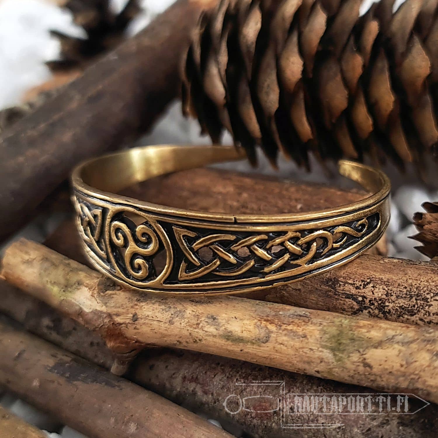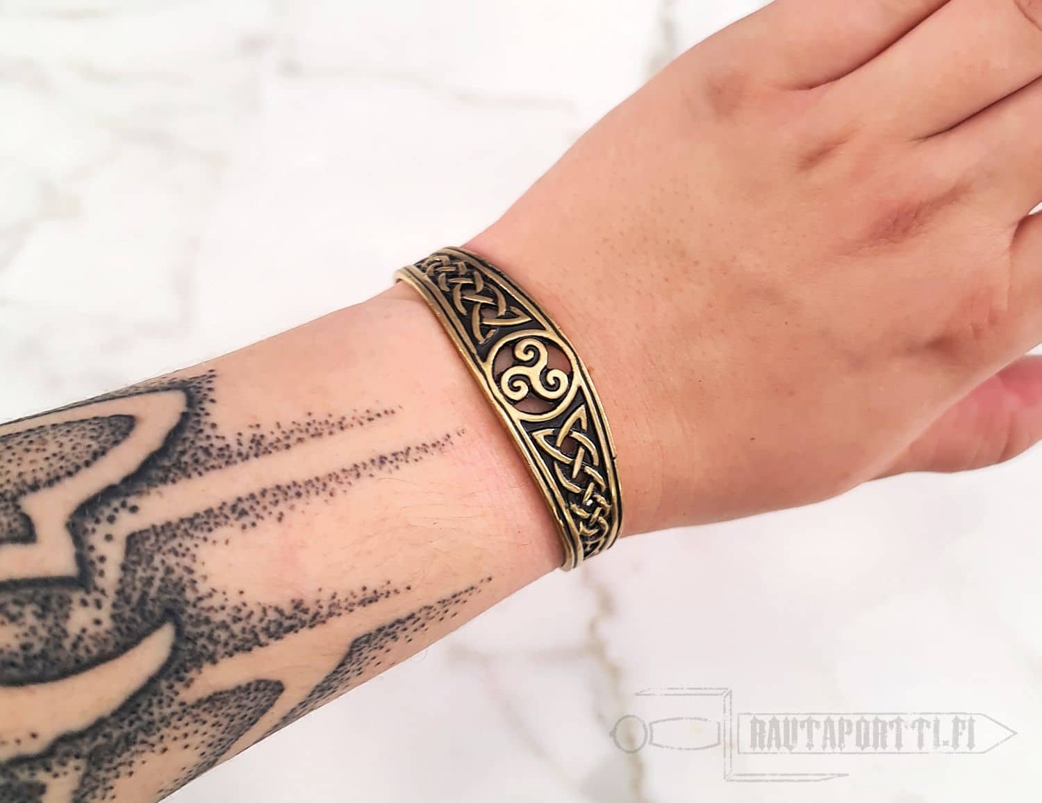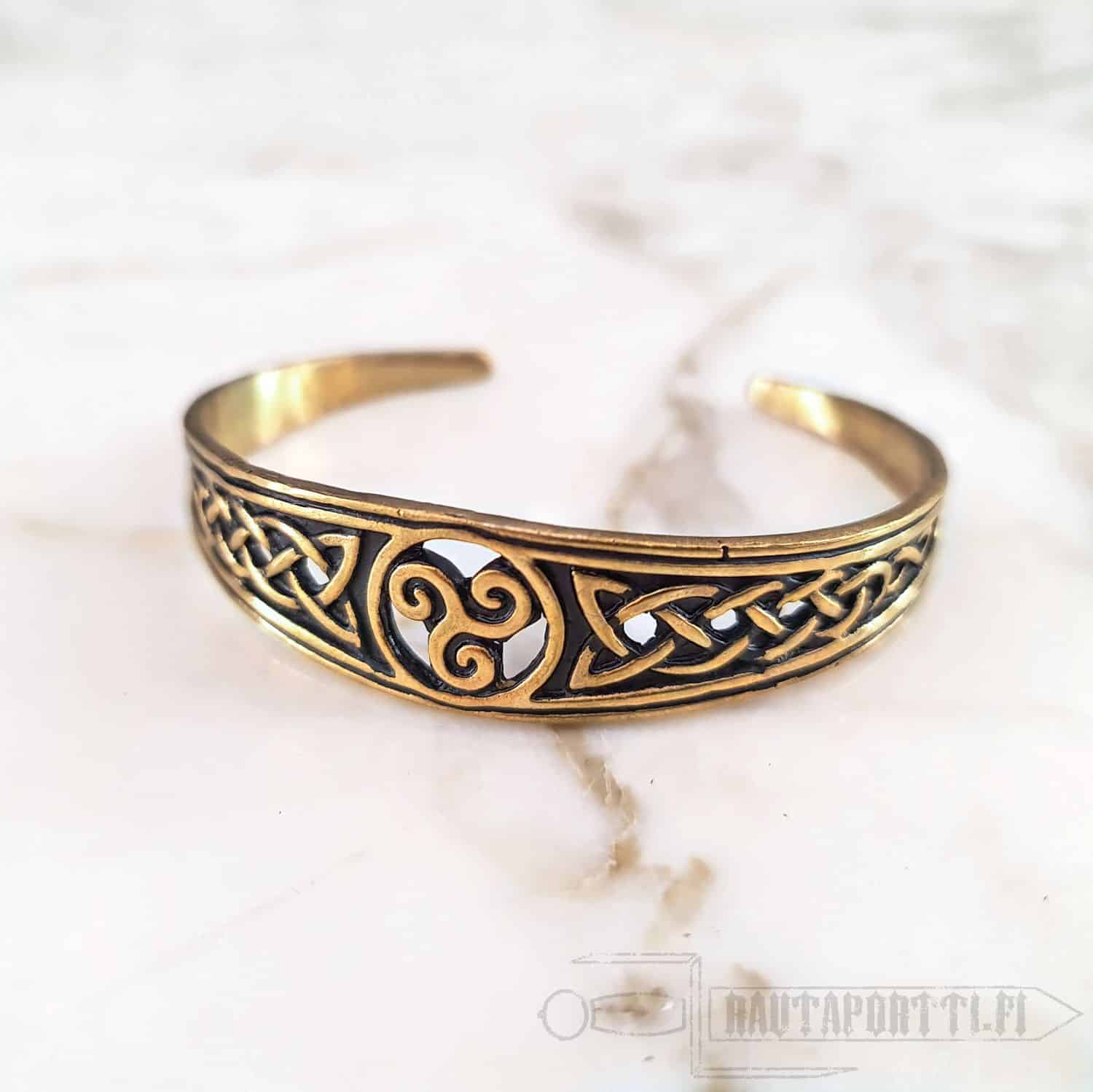 - Kelttityylinen rannerengas, jossa avoin solmukuvio ja keskellä triskele