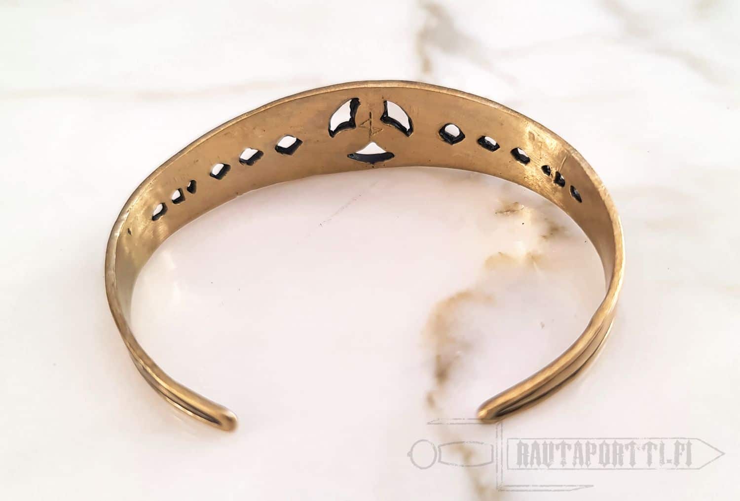 Tämä siro ranneke on valmistettu pronssista, ja se on n. 1,5 cm leveä. Materiaali on taipuisaa, joten renkaan saa taivutettua sopimaan käyttäjänsä ranteisiin. Soveltuu ranteisiin joiden ympärysmitta on n. 16-19 cm.