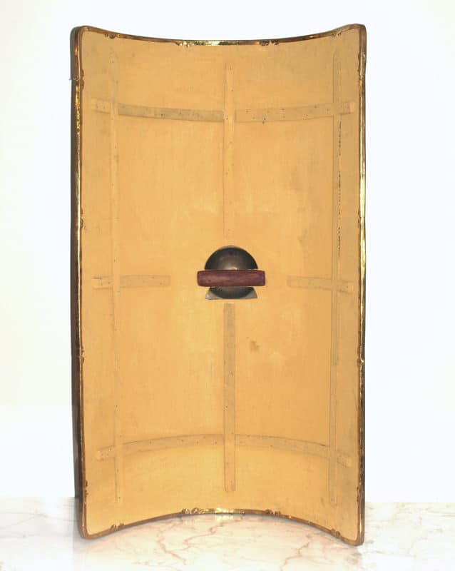 Tämä kangaspäällysteinen puukilpi on käsinmaalattu. Kilven reunoja kiertää messinkireunus/vahvike. Keskuskupura on messinkiä. Kilven takaosassa on ohuet puiset lisävahvikkeet.