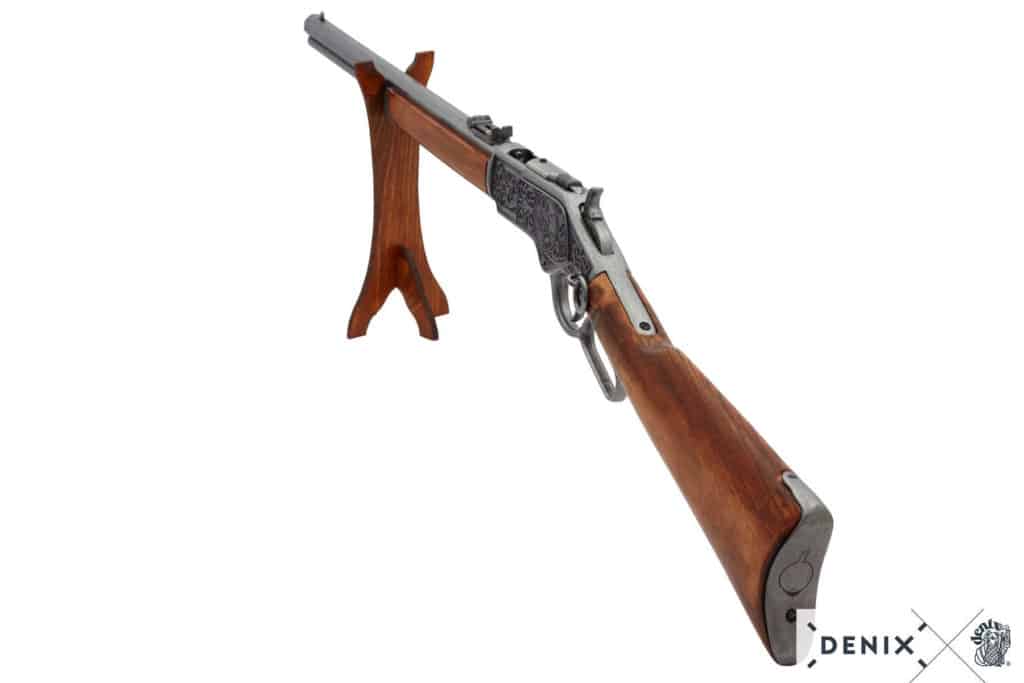 Tämä kappale on Winchesterin vipulukkokivääri vuosimallia 1873, jossa on vieläpä tyylikkäät koristekuviot kyljessä. 1873 malli oli ensimmäinen Winchester-malli jossa aseen runko tehtiin asemetallin (keltaisen pronssiseoksen) sijaan raudasta. 1873 malli oli kaiken kaikkiaan suosituimpia Winchester-malleja. Näitä valmistettiin 720 000kpl vuosien 1873 ja 1923 välillä. Winchester-kivääri perustui aiemmalle 1862 Henry-kiväärille. Ennen tätä 1873 Winchester-mallia oltiin valmistettu mallia 1866 ja tämän jälkeen tulivat vielä mallit 1876, 1886 ja 1892, joista jokainen malli toi mukanaan pieniä muutoksia ja uudistuksia. Visuaalisesti ja toiminnallisesti eri Winchester mallit ovat hyvin samanlaisia ja useita eri malleja valmistettiin ja myytiin samanaikaisesti antaen ostajalle valinnanvaraa.