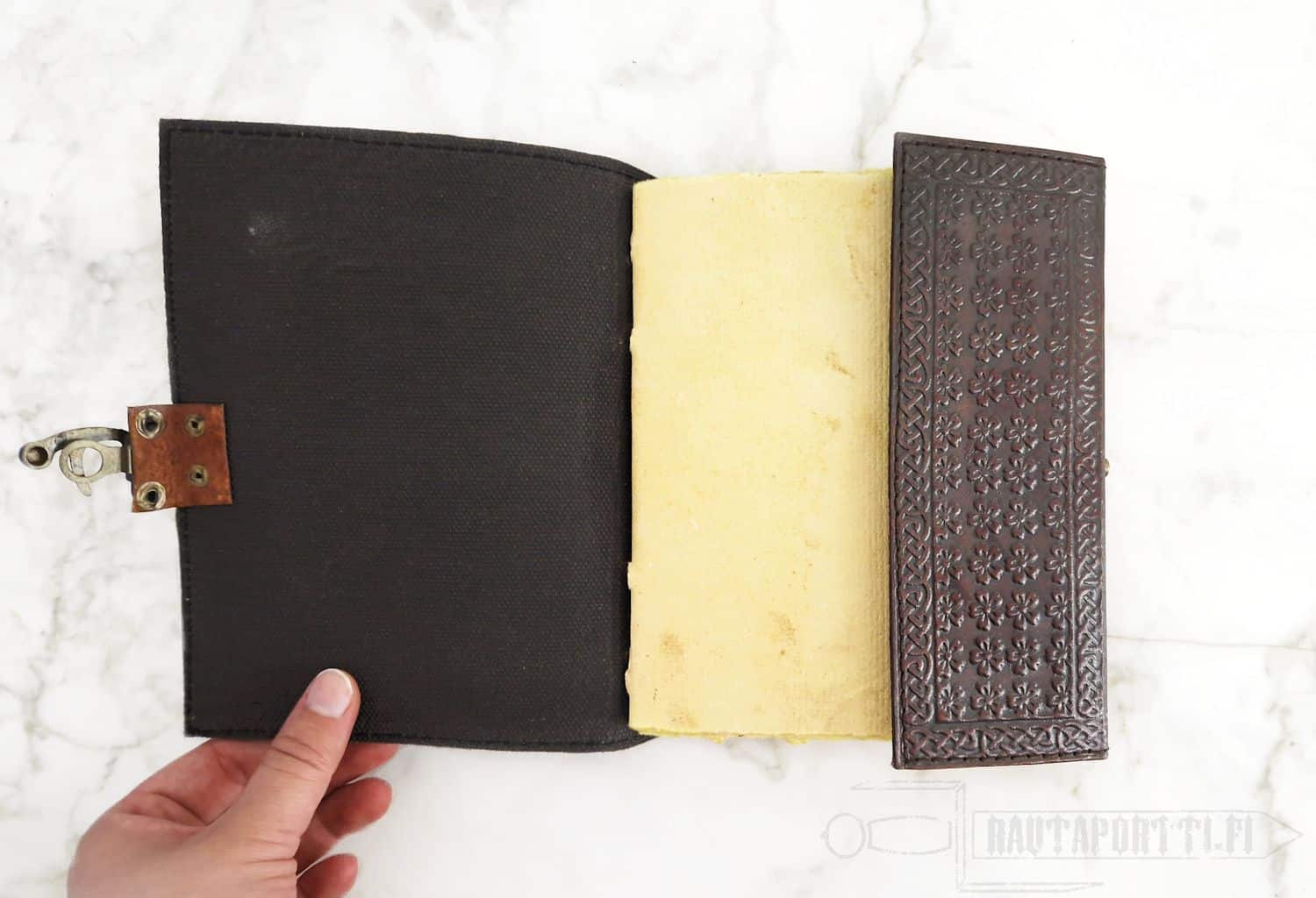 Muistikirjan sivut ovat antikoitua käsintehtyä puuvillapaperia. Tätä muistikirjaa voit käyttää esim. päiväkirjana, sukupuu-kirjana kirjatessasi ylös omaa sukuluetteloasi, piirtäjän luonnosteluvihkona, tilauskirjana, vieraskirjana, reseptikirjana, matkakirjana, taikojen, ajatusten tai havaintojen ylöskirjoittamiseen, unikirjana, kouluvihkona jne.