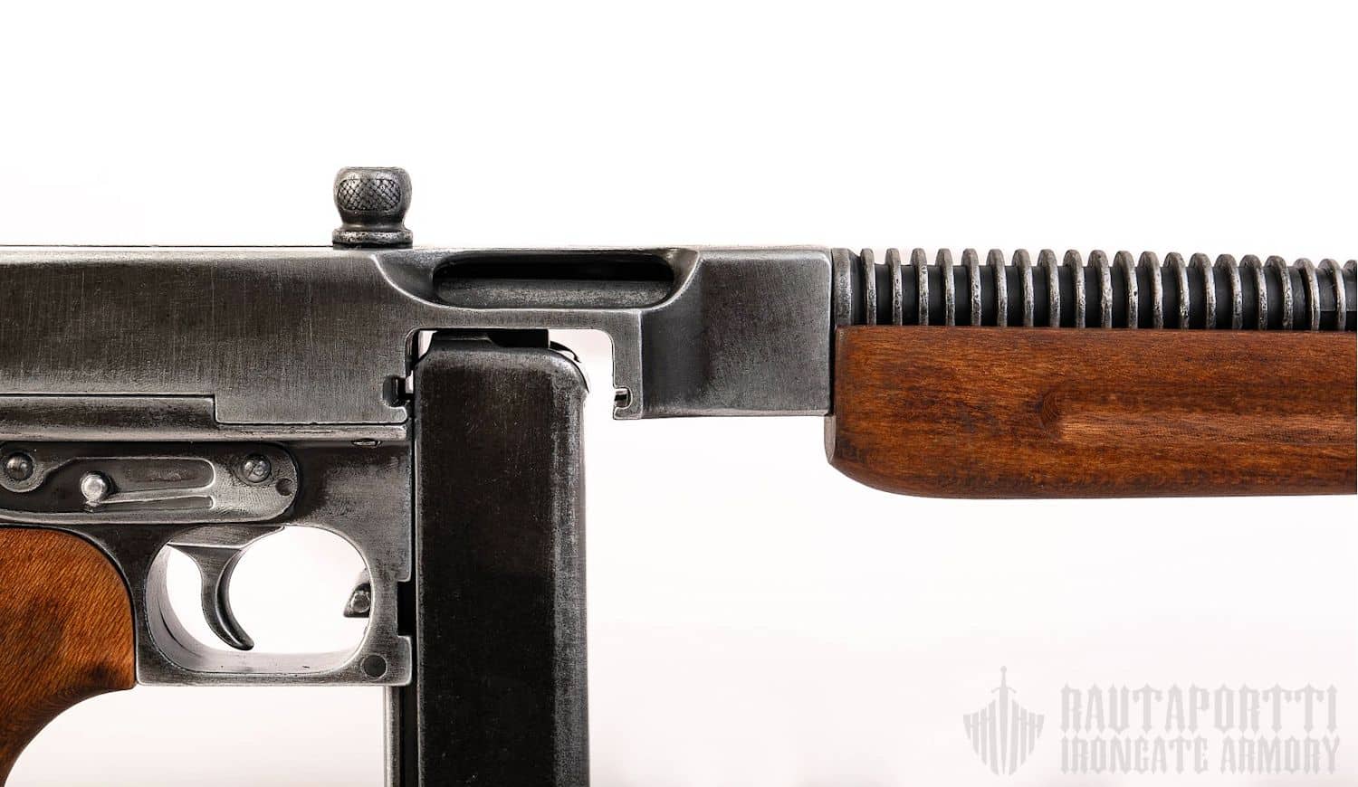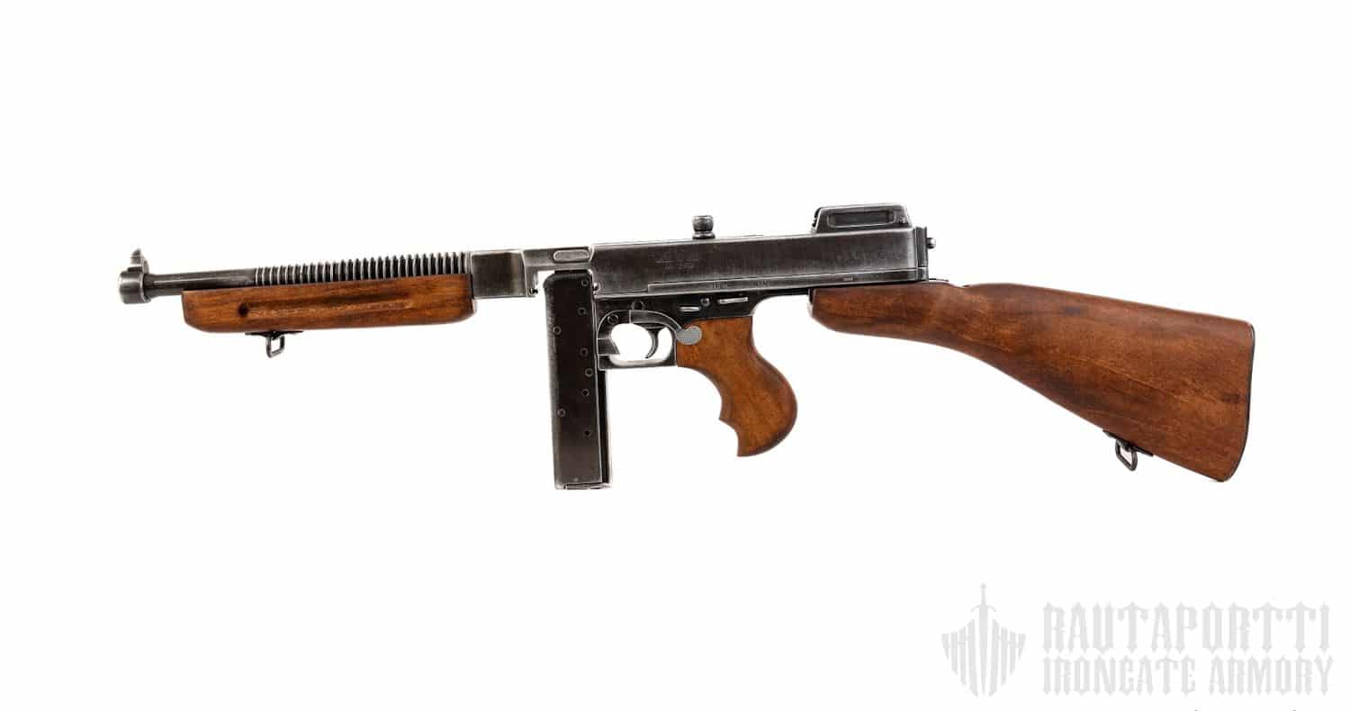 Tämä Thompson M1928 sotilasversio on yksi toisen maailmansodan tunnetuimpia aseita. Thompson-konepistooli tuli tunnetuksi myös 1920-luvun gangsteriaseena ja on kaikkiaan yksi helpoiten tunnistettavimpia aseita kautta historian. Yleinen lempinimi tälle kevyelle sarjatulta ampuvalle konepistoolille oli Tommy Gun. Tämä on Thompson-konepistoolin sotilasversio, joka oli varustettu 20 patruunan tankolippaalla ja kiväärimäisellä etutukilla. Sodissa käytettiin myös rumpulippaalla ja etukahvalla varustettua mallia, mutta suurin osa sotilaskäytössä olleista konepistooleista oli tällaisia tankolippaalla varustettuja malleja.
