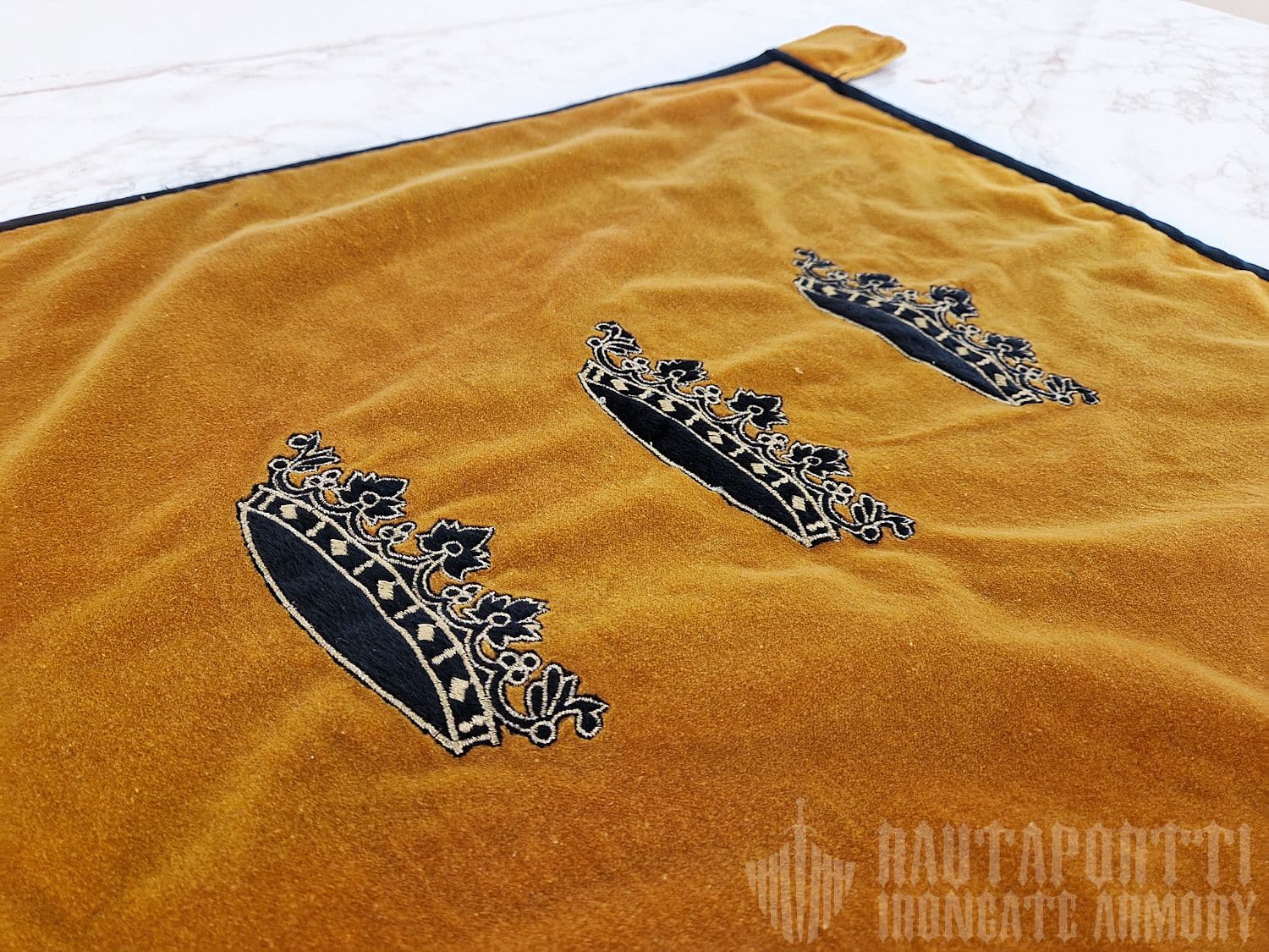 Tämä ylellinen standaari on valmistettu paksusta kellertävästä sametista, ja kultaiset kruunut on kirjailtu lipun etupuolelle. Lipussa on kaksi kangaslenkkiä, joilla voit ripustaa sen joko airueesi trumpettiin, tai vaihtoehtoisesti verhotankoon tai muuhun seipääseen tuomaan ripauksen keskiaikaista viehätystä kotisi sisustukseen.