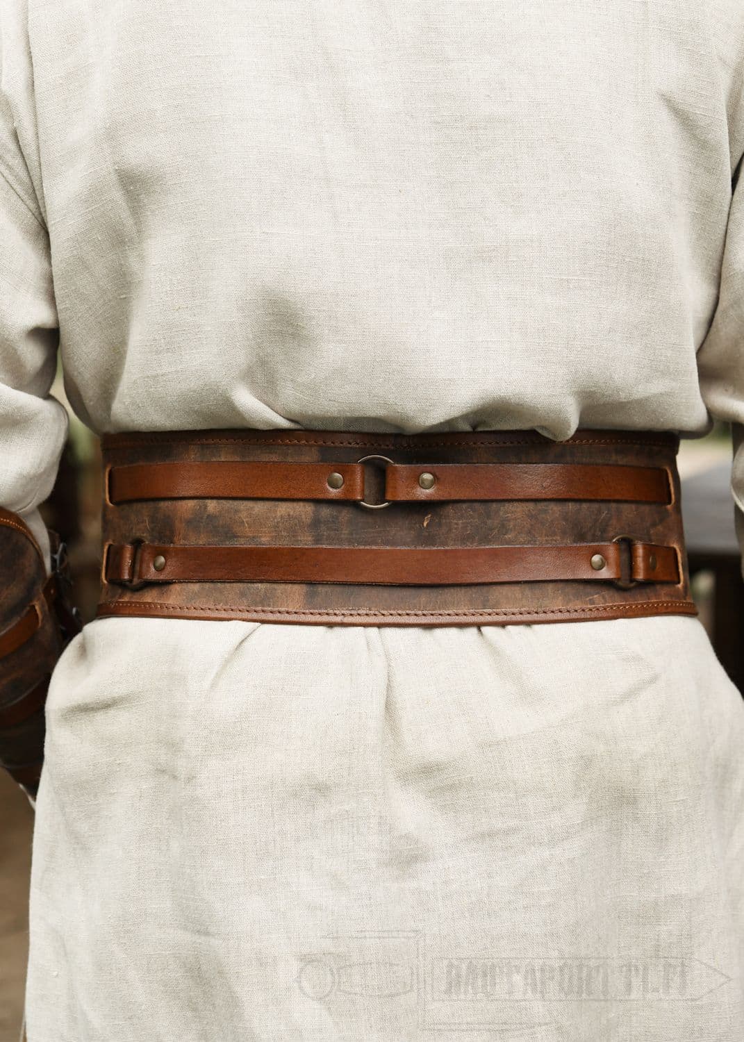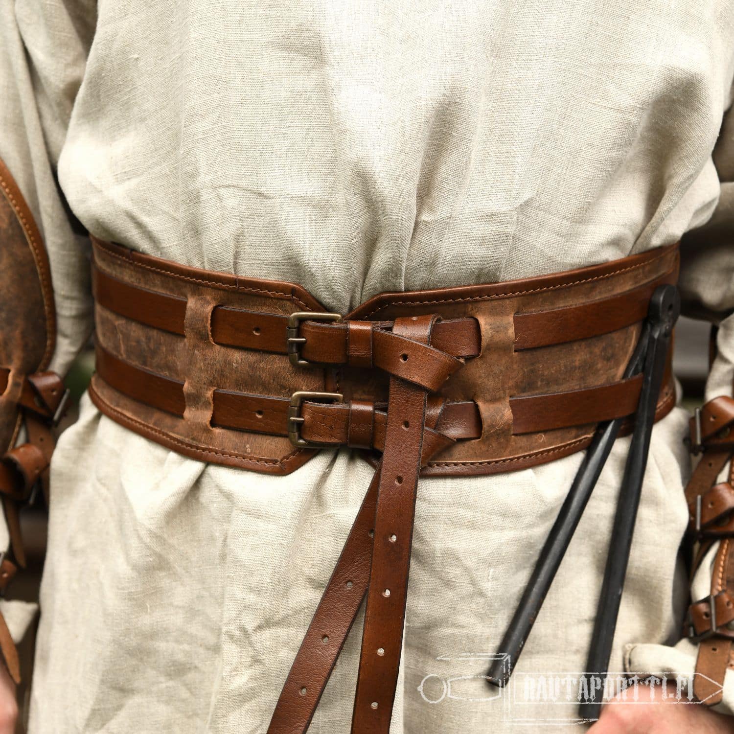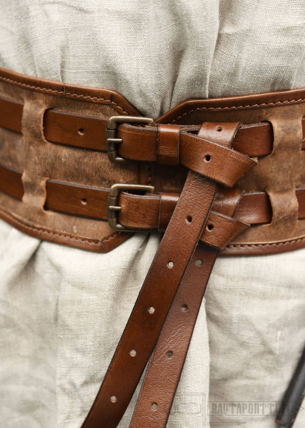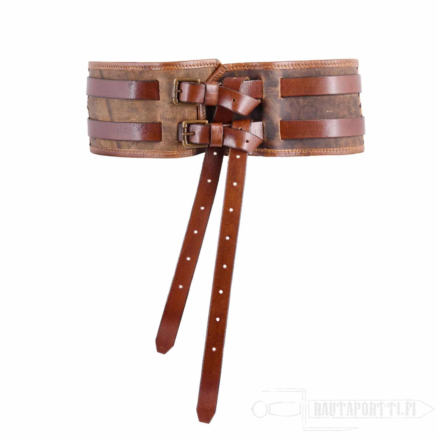 Tämä leveä vyö koostuu kahdesta kapeammasta nahkahihnasta, jotka on kiinnitetty leveämpään vyöhön tukevilla lenkeillä. Vyöl kiinnitetään soljilla jotka on valmistettu antikoidusta messingistä. Nahkahihnoissa on integroidut metallirenkaat, ja sen lisäksi että ne tuovat vyöhön kauniin yksitysikohdan, ne ovat myös käytännölliset, sillä niihin saat helposti ripustettua pussukoita, työkaluja tai jopa aseita. Vöihin saa helposti kiinnitettyä myös vyölaukkuja ja aseenkannattimia.