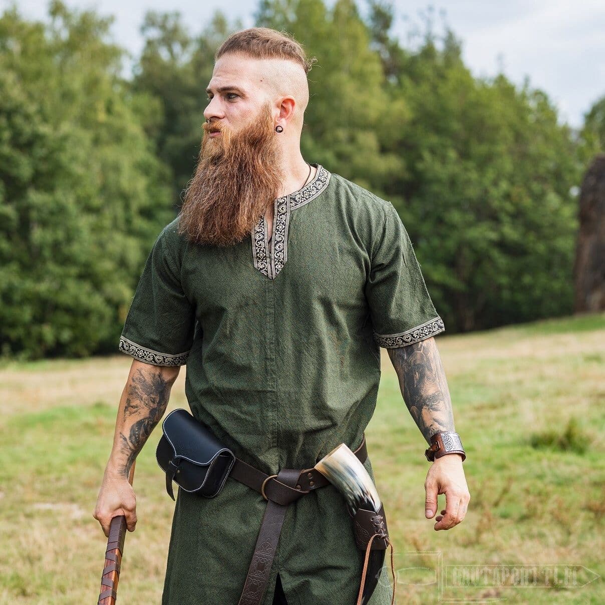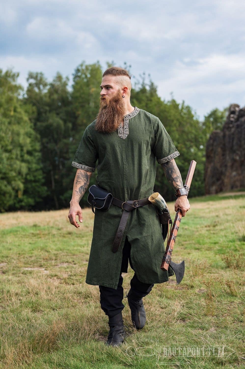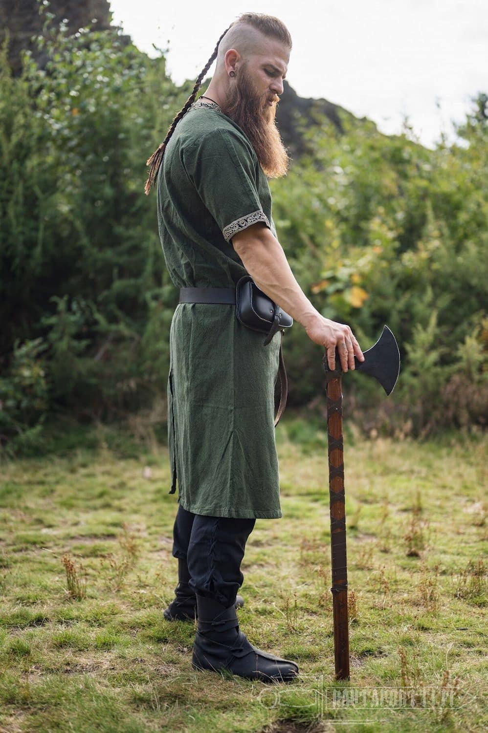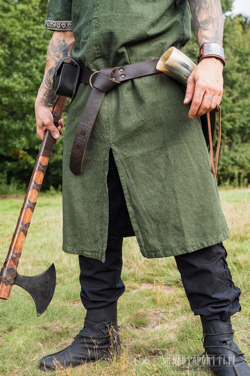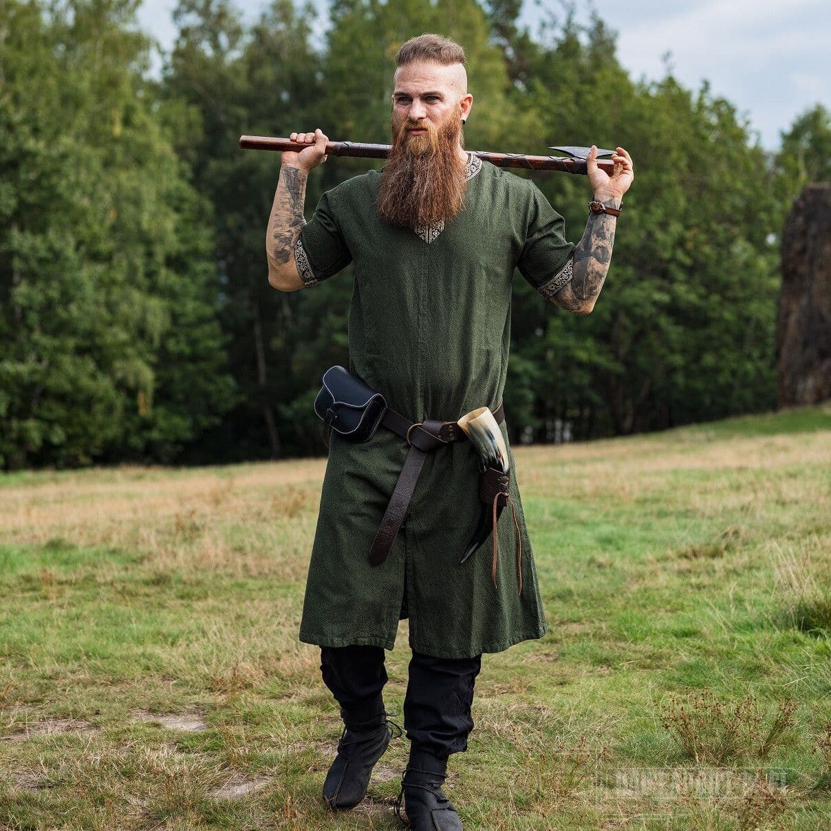 Tämä tunika sopii historiallisestikin niin miehille kuin naisille. Tämän lyhythihaisen tunikamallin helmaosassa on pitkät halkiot edessä ja takana, jolloin on saatu lisää liikkumatilaa jaloille. Erityisesti taistelussa mahdollisimman vapaa jalkojen liikkuvuus on tärkeää.