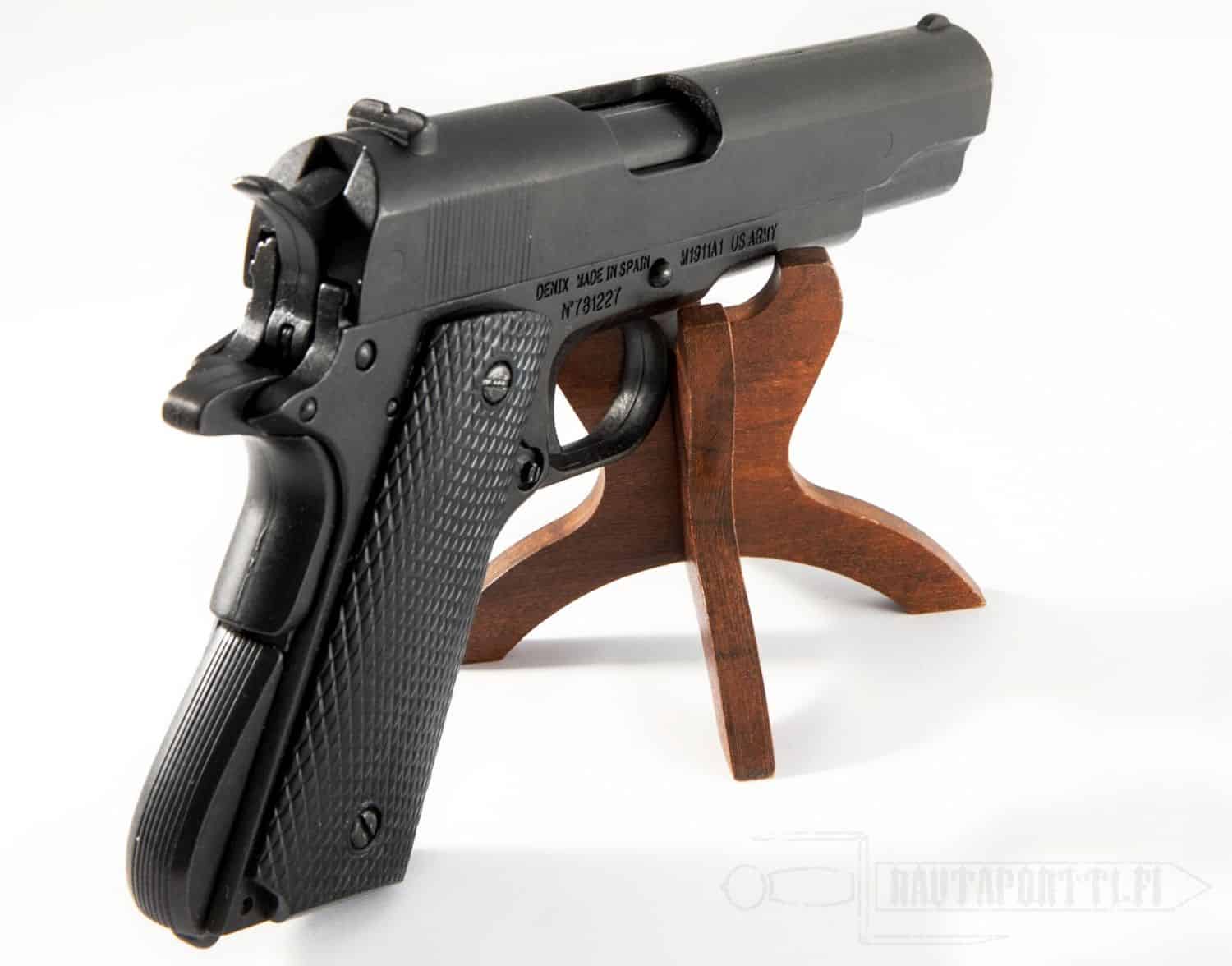 Colt M1911A1 lippaaseen mahtuu 7kpl .45 ACP panoksia ja se on useimpien pistoolien tapaan tehokas alle 50m etäisyyksillä.