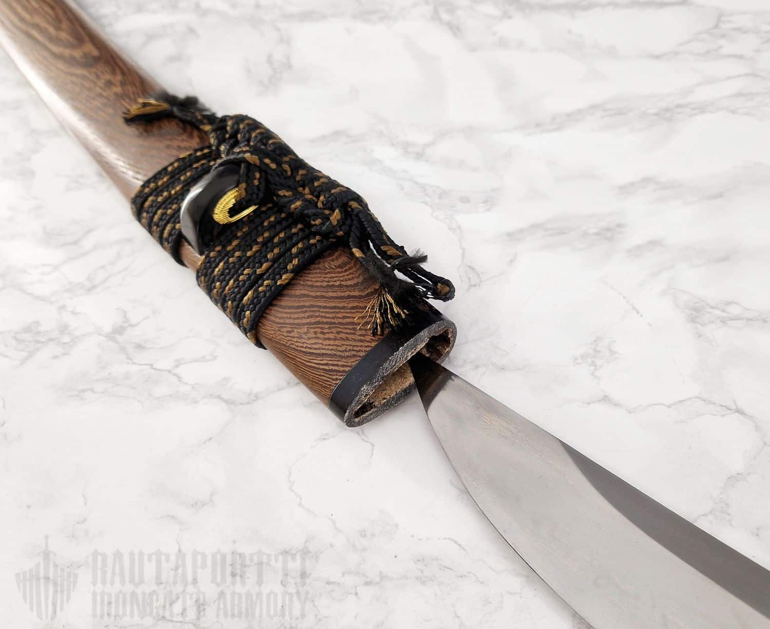 Tälle miekalle on tehty yhtä erityinen huotra: käsin valmistettu kovapuinen saya, jossa on musta/kulta silkkinen sageo sekä puhvelinsarviset koiguchi ja kurigata. Puinen huotra tuo ylellisen ilmeen, ja jokainen huotra on sovitettu juuri omaan miekkaansa – mikään muu miekka ei istu siihen täydellisesti.