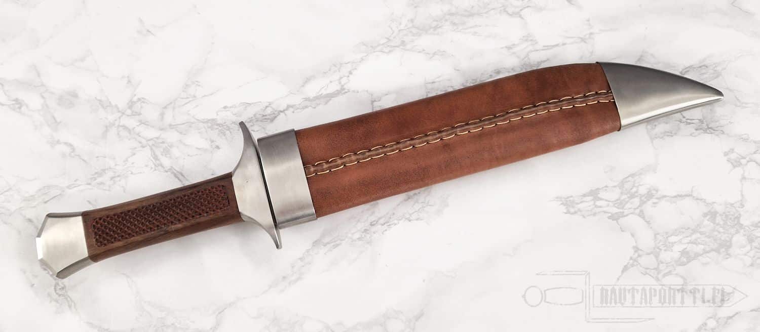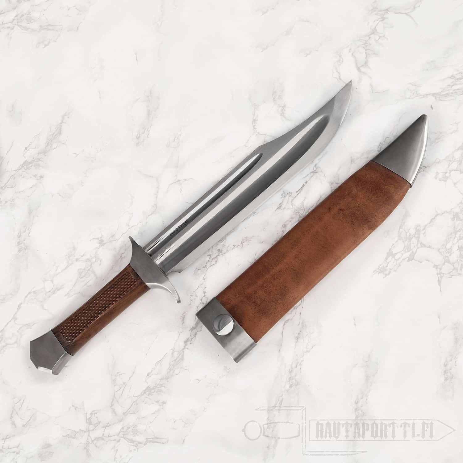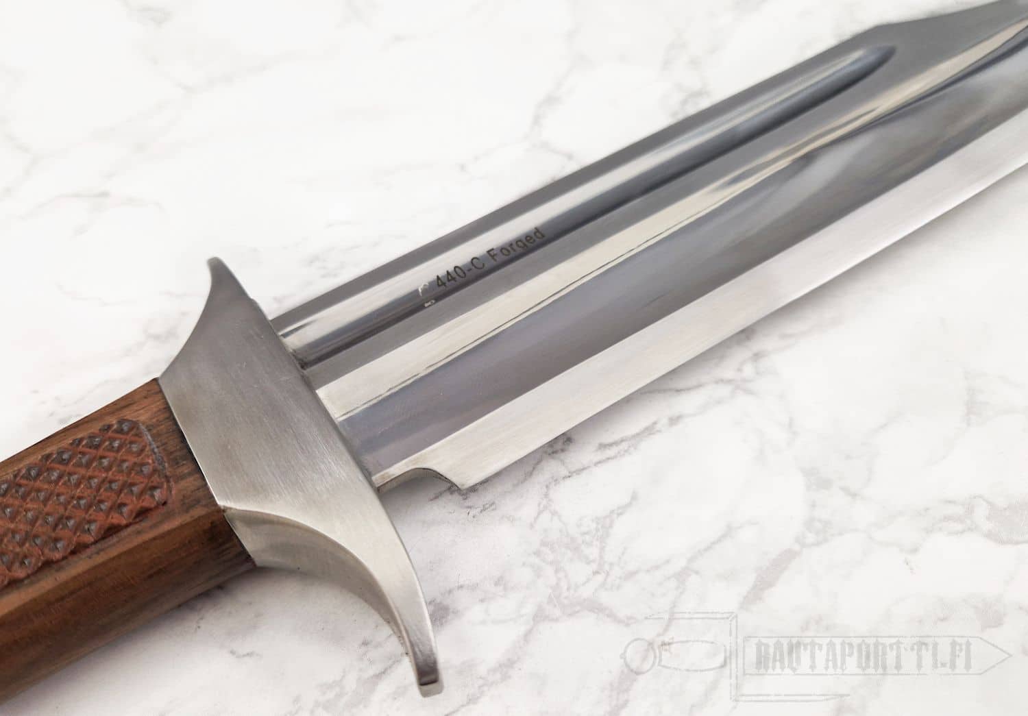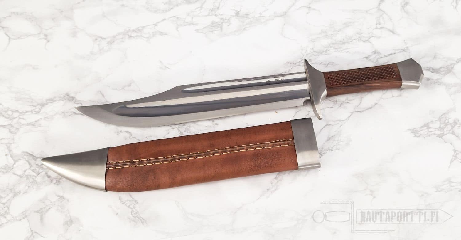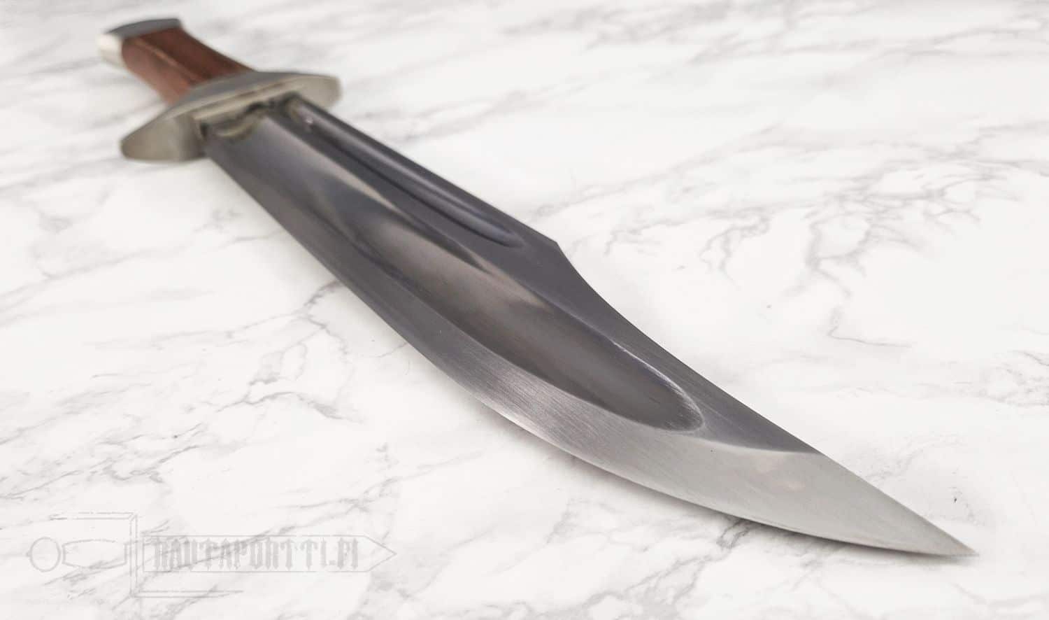 Tämä Outrider Bowie on yksi isoimmista bowie-veitsistämme. Sen 28,5cm pitkä terä on taottu 440C ruostumattomasta teräksestä. Helat ovat harjattua ruostumatonta terästä ja kahvaosa on kuvioitua ruusupuuta. Mitoistaan huolimatta tämä bowie on kauniin sopusuhtainen leikkaustyökalu. Terän syvät veriurat tekevät veitsestä erinomaisen hyvin tasapainotetun ja ketterän. Veitsen mukana tulee kova nahkapäällysteinen tuppi ja vyöpidike turvallista mukanakantamista varten. Esilläpitoa varten miekan mukana toimitetaan tammipuinen pöytäteline. Bowie toimitetaan pehmustetussa vetoketjullisessa säilytyspussissa.