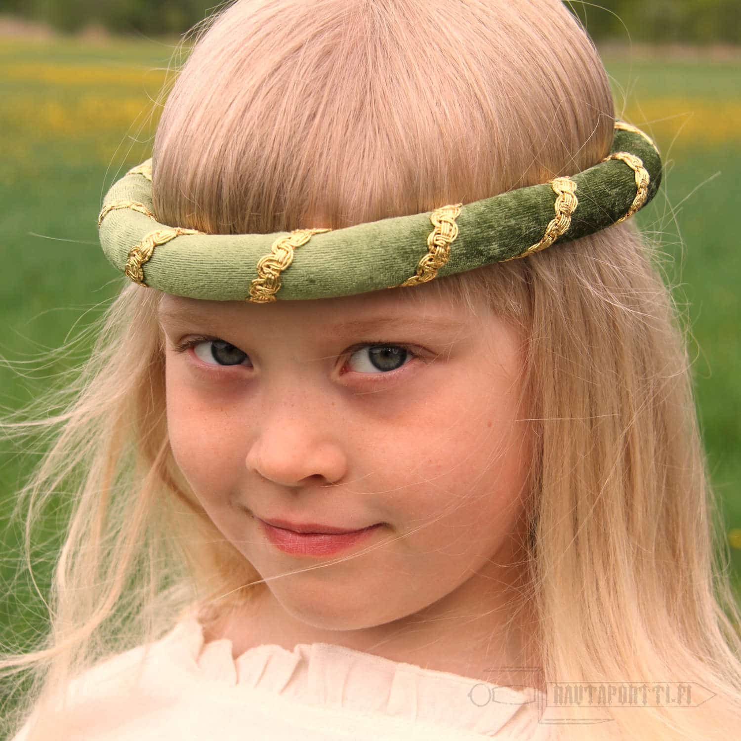Tämä prinsessan pääpanta koostuu pehmeästä vaahtomuovirenkaasta, joka on päällystetty samettimaisella kankaalla. Pehmeän pääpannan ympäri kiertää koristeellinen nauha. Valkoisesta tyllikankaasta tehty huntu ja koristenauhat riippuvat alas pääpannan takaa. Pannan halkaisija on noin 14 cm. Tämän hienon neidon pääpannan kanssa on helppo uppoutua keskiajan kuningattarien ja prinsessojen maailmaan. Olipa teidän perheen prinsessa järjestämässä kuninkaallisia teejuhlia tai osallistumassa tanssiaisiin puutarhassa, tämä yksinkertainen asuste lisää ripauksen kuninkaallista eleganssia tilaisuuteen.