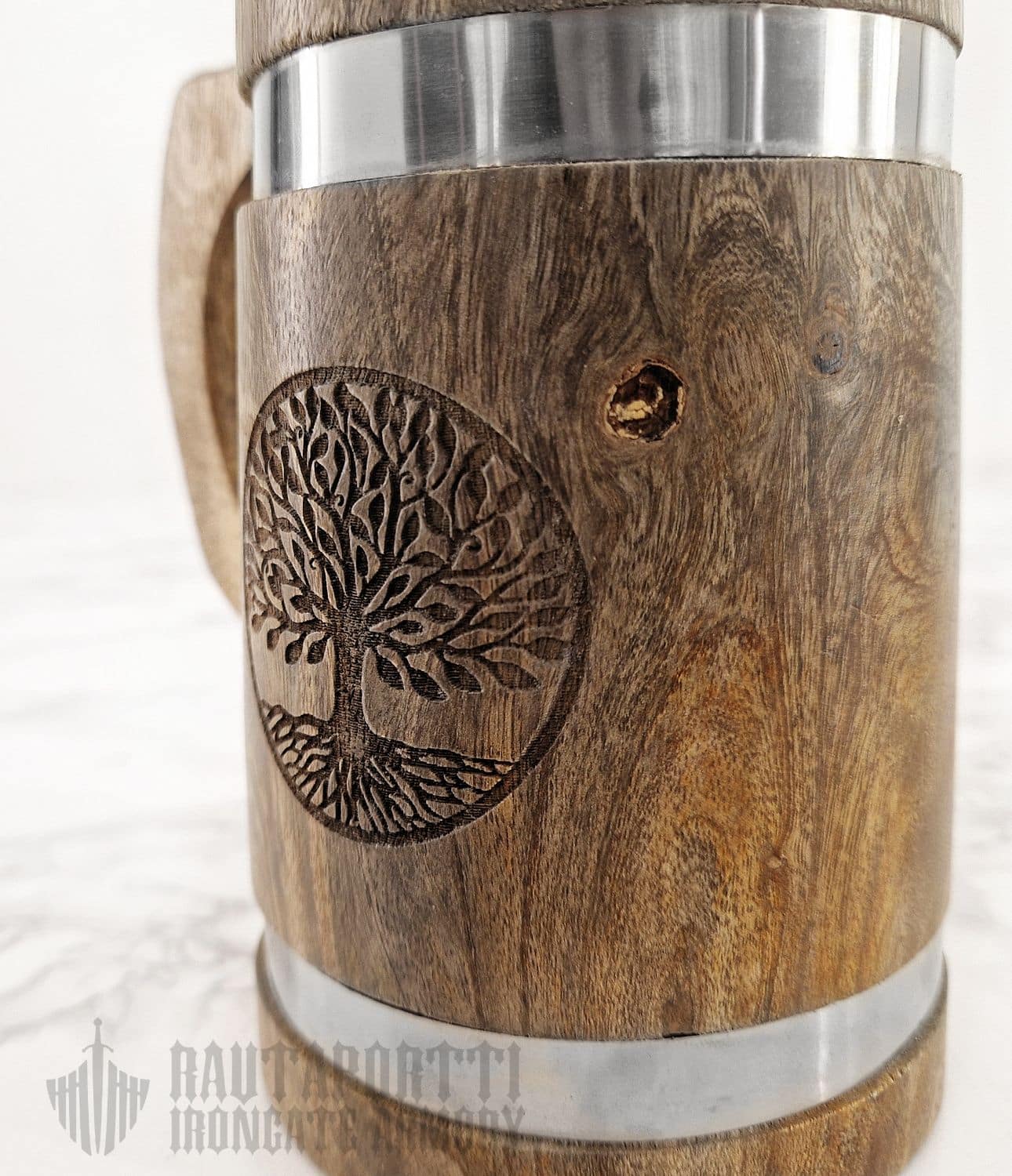 Puuastiat on usein koristeltu kaiverruksin. Tämän kolpakon koristekaiverruksena on luonnonläheinen maailmanpuu, joka löytyy useista vanhoista mytologioista maailman ylläpitäjänä ja tärkeimpänä rakenteena. Maailmanpuu löytyy niin skandinaavisesta mytologiasta (Yggdrasil), Kalevalasta (iso tammi), Siperian uskonnoista, Mongolian mytologiasta (joka levisi Tsingis-kaanin maailmanvalloituksessa), Amerikan alkuperäiskansojen uskomuksista kuin Slaavien, Baltian, Turkin, Kiinan ja Intiankin vanhoista taruista. Puut ovat edelleen tärkeitä ihmisille, mutta evoluutiohistoriassamme puut ovat todella olleet koko maailmamme ja lajimme elämän mahdollistaja. Ehkäpä tämän kaukaisen muiston takia jättimäinen maailmanpuu löytyy niin monista vanhoista myyteistä koko maailman selittäjänä ja kehyksenä.