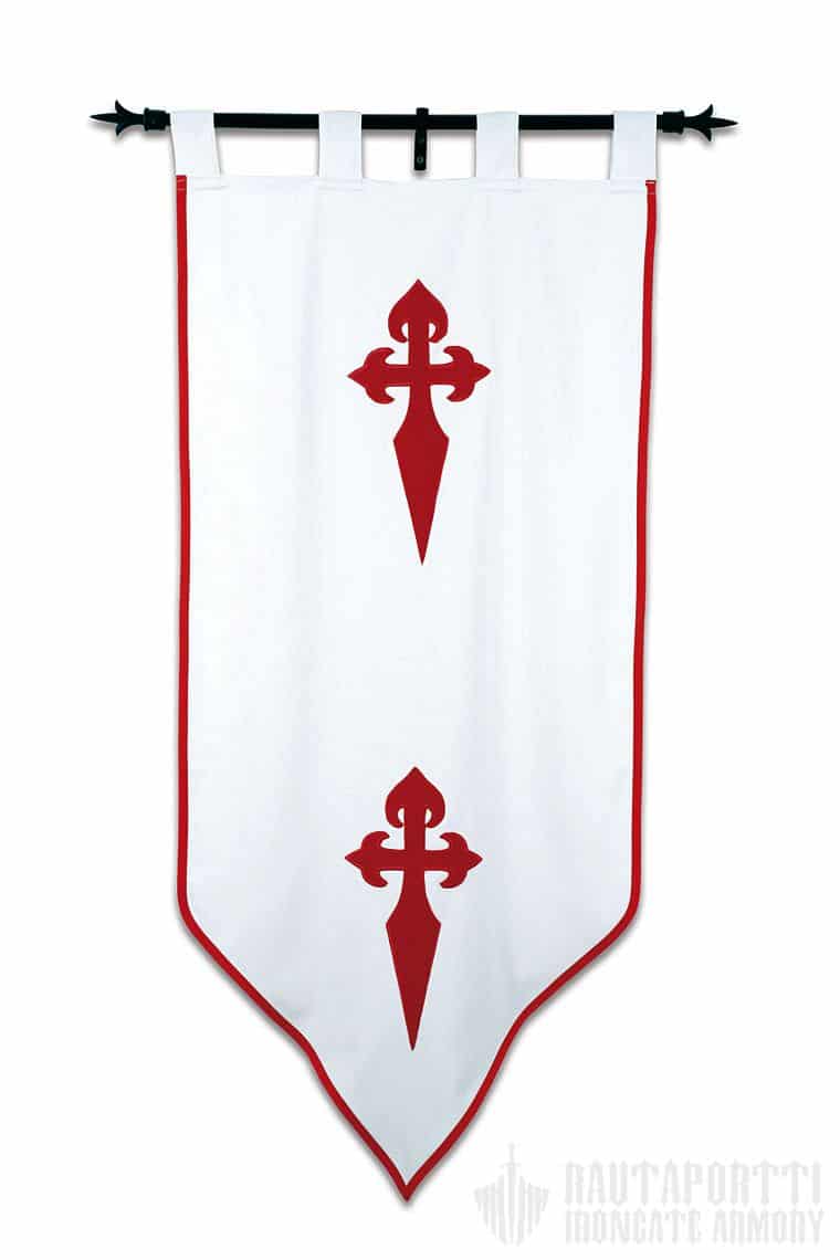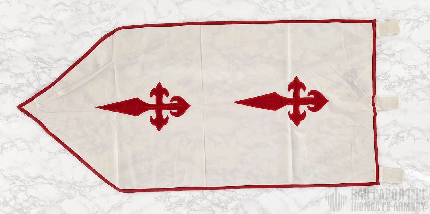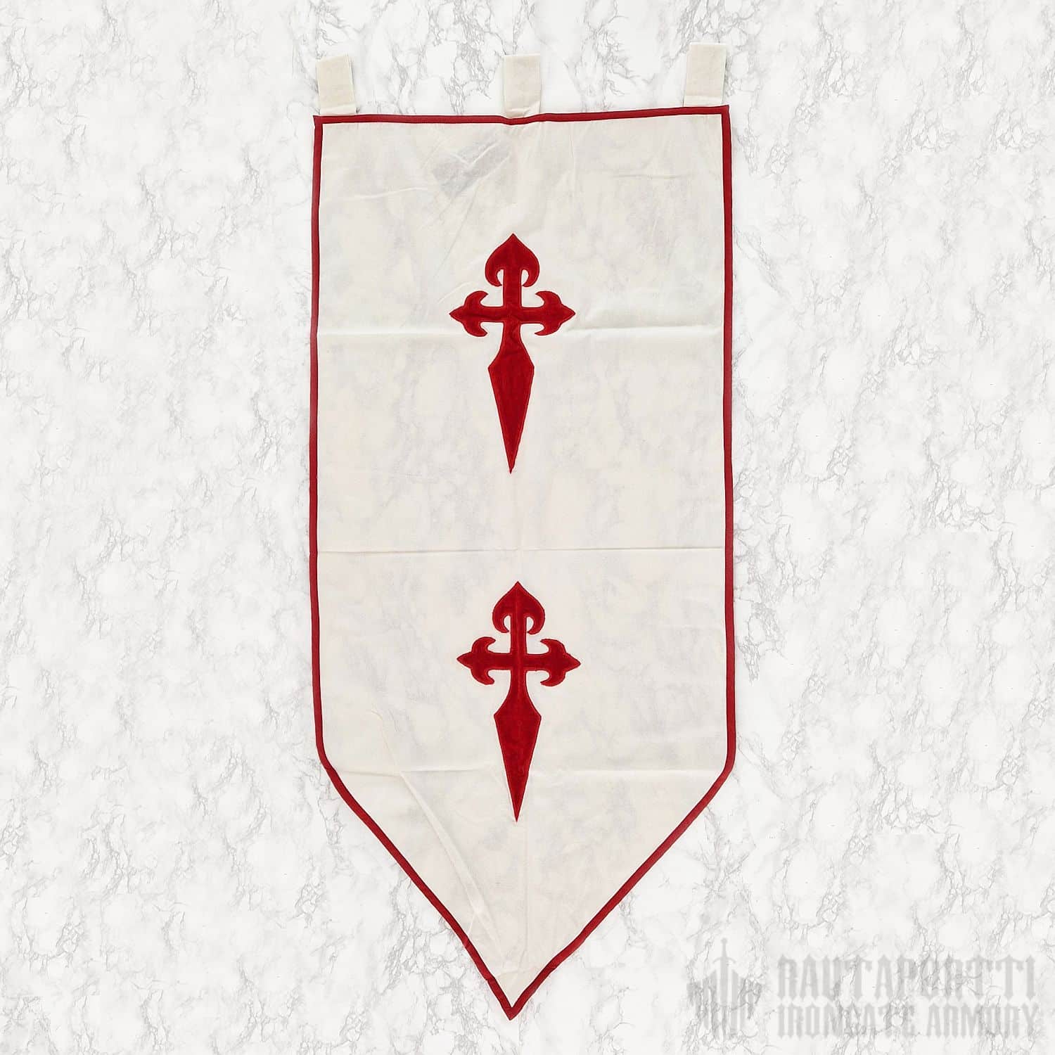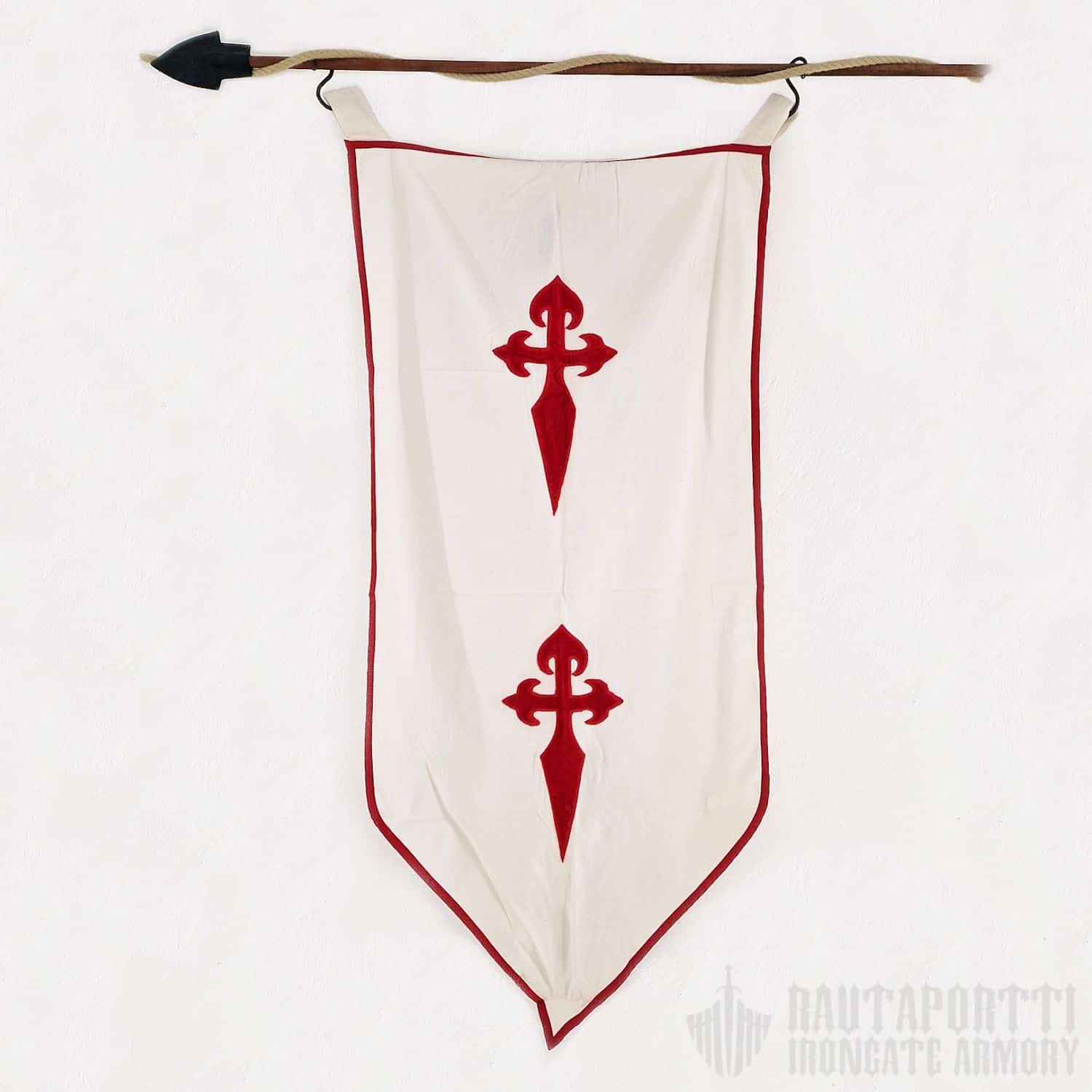Tämä standaari on valmistettu tukevasta valkoisesta puuvillakankaasta, ja sen etupuolelle on kirjailtu punaiset Pyhän Jaakon ritarikunnan ristit. Lipussa on kolme kangaslenkkiä, joilla voit ripustaa sen joko airueesi trumpettiin, tai vaihtoehtoisesti verhotankoon tai muuhun seipääseen tuomaan ripauksen keskiaikaista viehätystä kotisi sisustukseen.