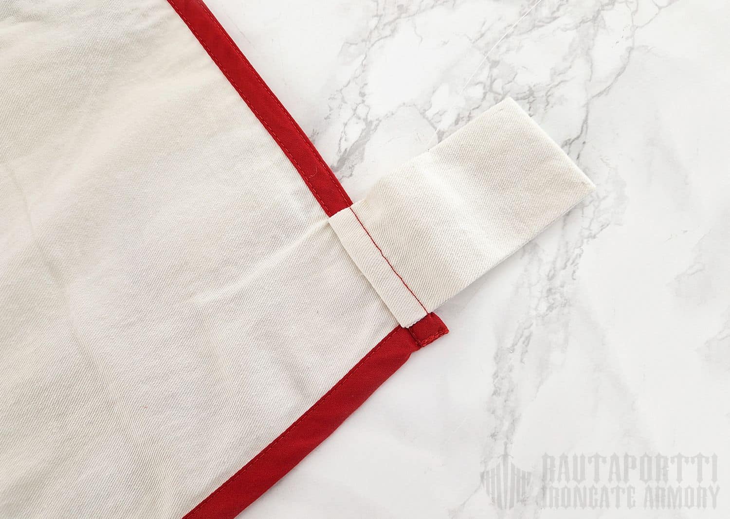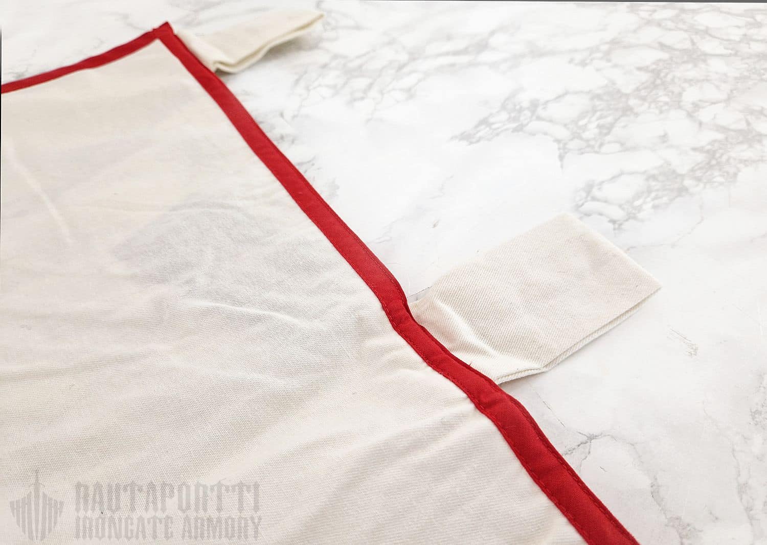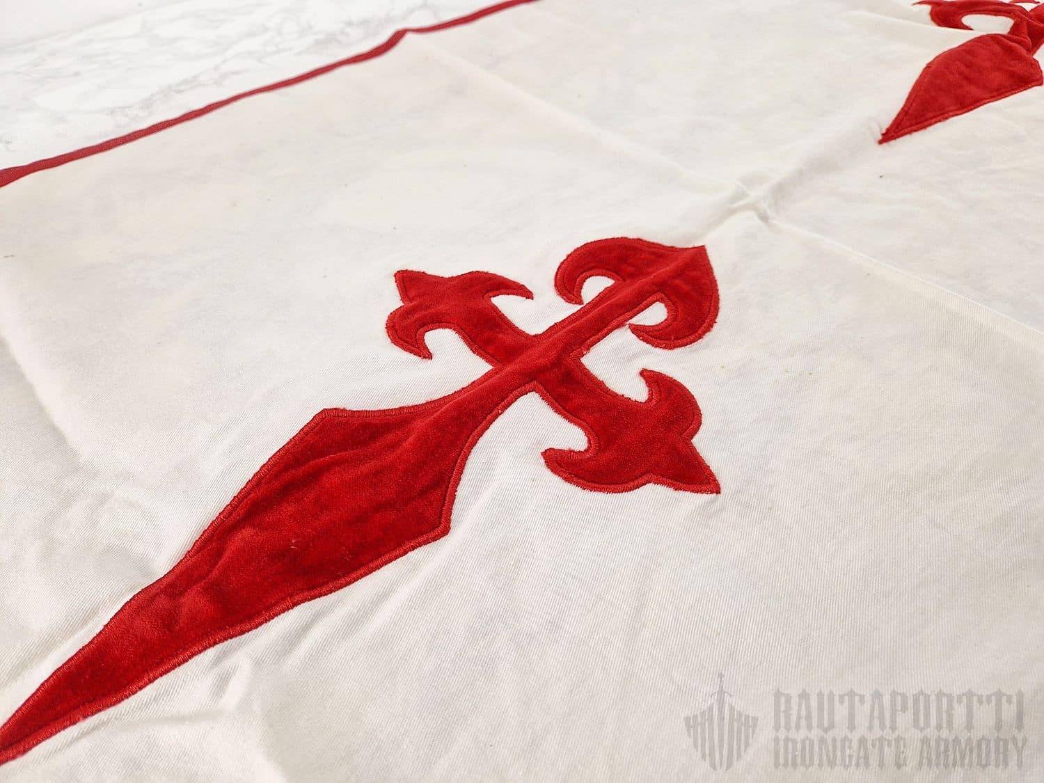 Tämä standaari on valmistettu tukevasta valkoisesta puuvillakankaasta, ja sen etupuolelle on kirjailtu punaiset Pyhän Jaakon ritarikunnan ristit. Lipussa on kolme kangaslenkkiä, joilla voit ripustaa sen joko airueesi trumpettiin, tai vaihtoehtoisesti verhotankoon tai muuhun seipääseen tuomaan ripauksen keskiaikaista viehätystä kotisi sisustukseen.