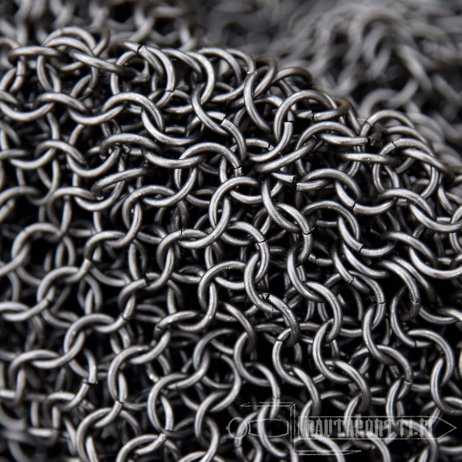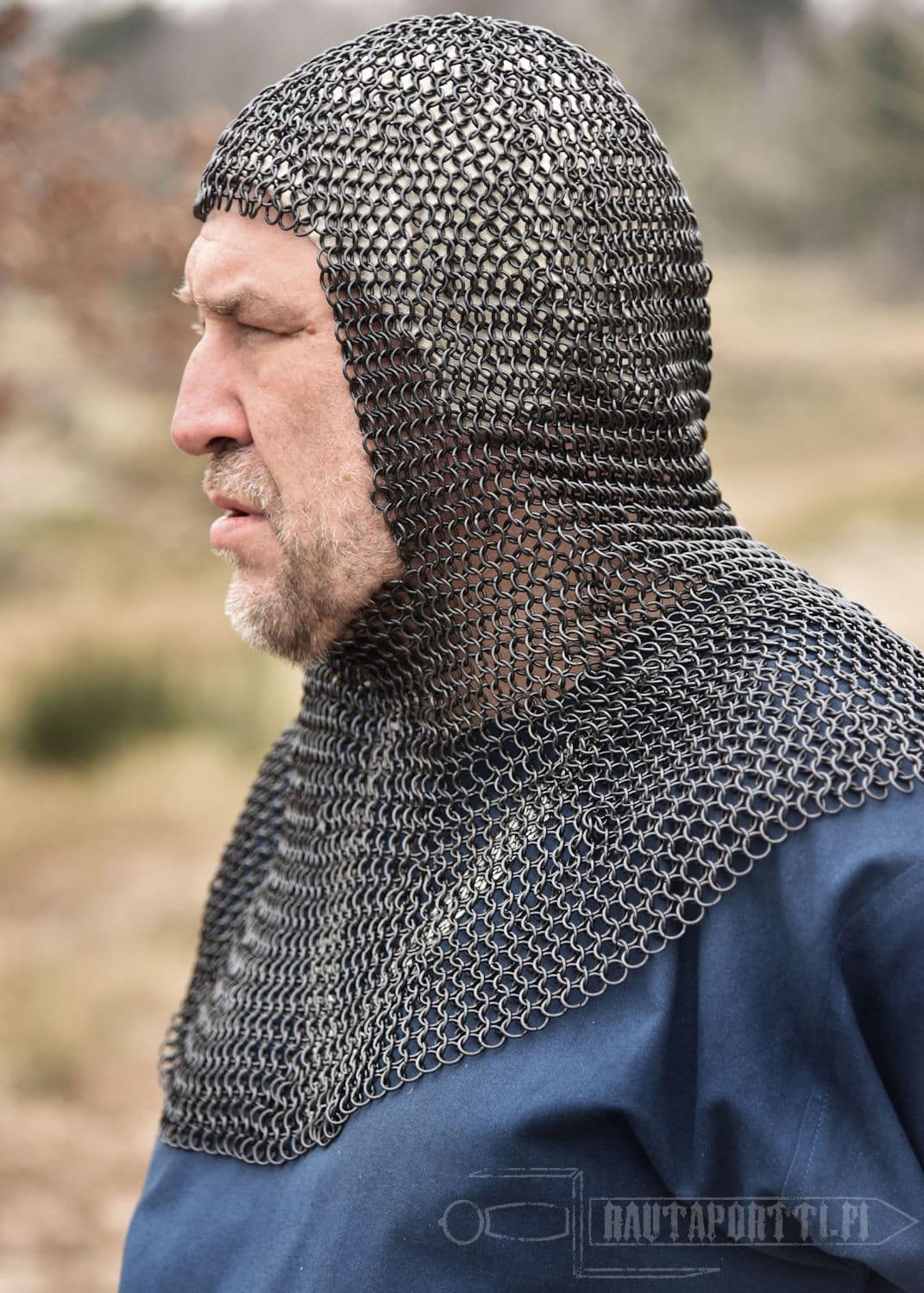 Mustattu malli on valmistettu 1,6 mm paksusta teräslangasta taivutetuista renkaista ja on rakenteeltaan perinteinen eurooppalainen rengashaarniska. Haarniskan silmukointi on tyypillistä neljä rengasta läpi viidennestä -tyyliä. Rengashaarniskahuppu on kokonaisuudessaan mustattu, mikä jonkin verran suojaa sitä ruostumiselta. Suosittelemme kuitenkin, että pidät hupun kevyesti öljyttynä ruostumisen estämiseksi.