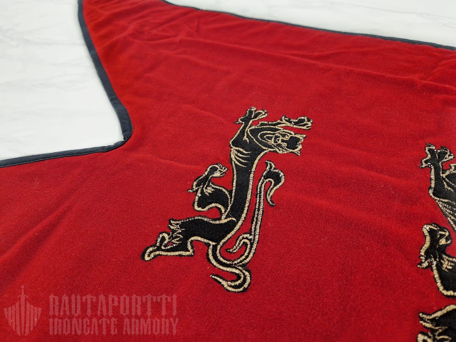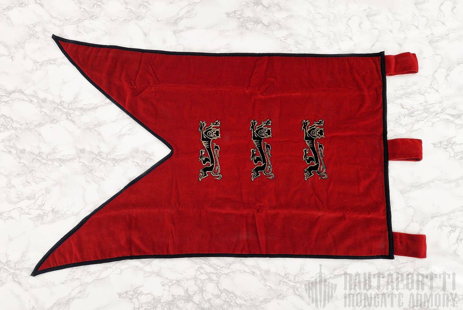 Tämä ylellinen standaari on valmistettu paksusta punaisesta sametista, ja leijonat on kirjailtu lipun etupuolelle. Lipussa on kolme kangaslenkkiä, joilla voit ripustaa sen joko airueesi trumpettiin, tai vaihtoehtoisesti verhotankoon tai muuhun seipääseen tuomaan ripauksen keskiaikaista viehätystä kotisi sisustukseen.