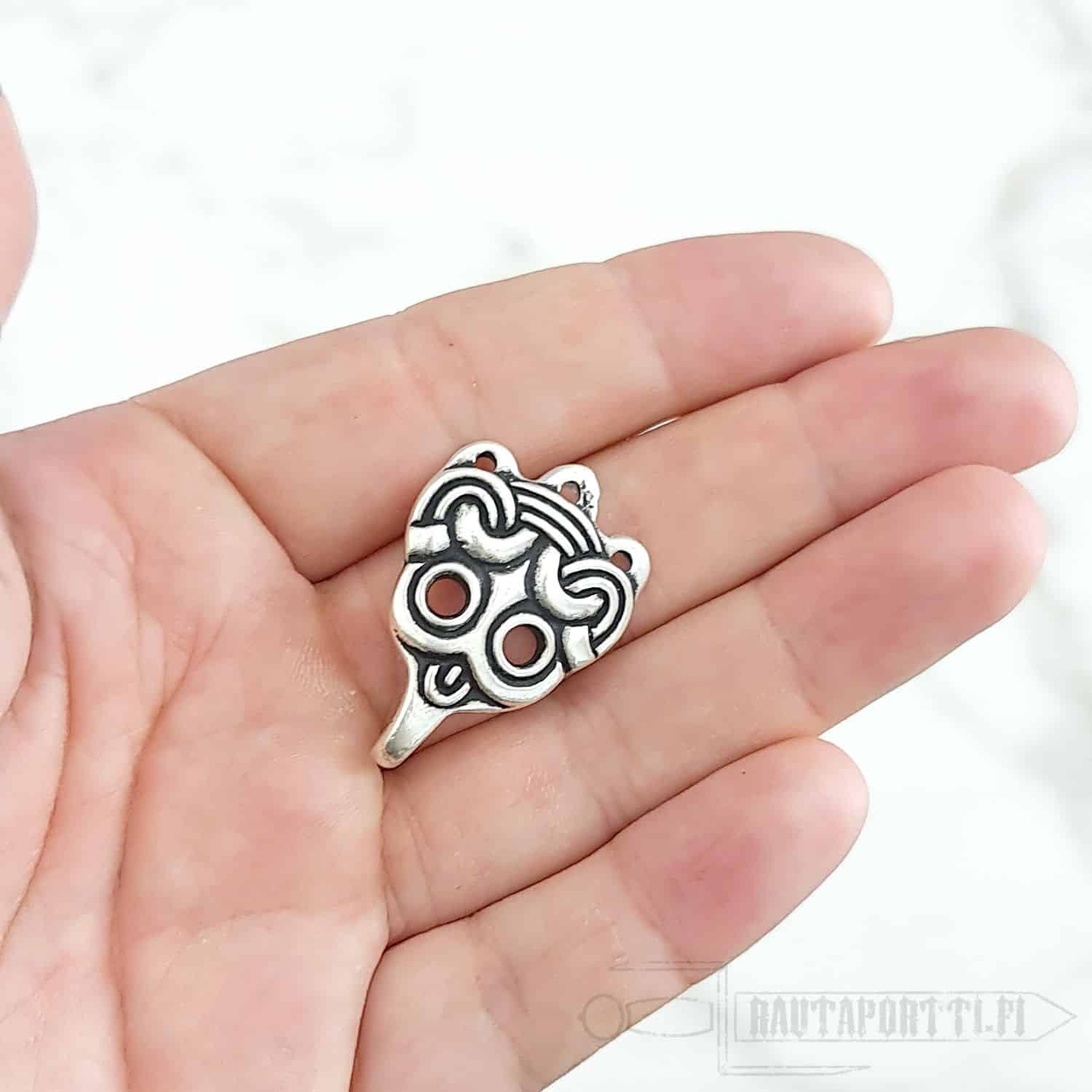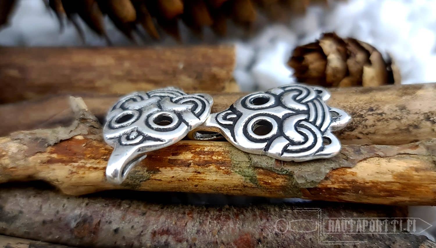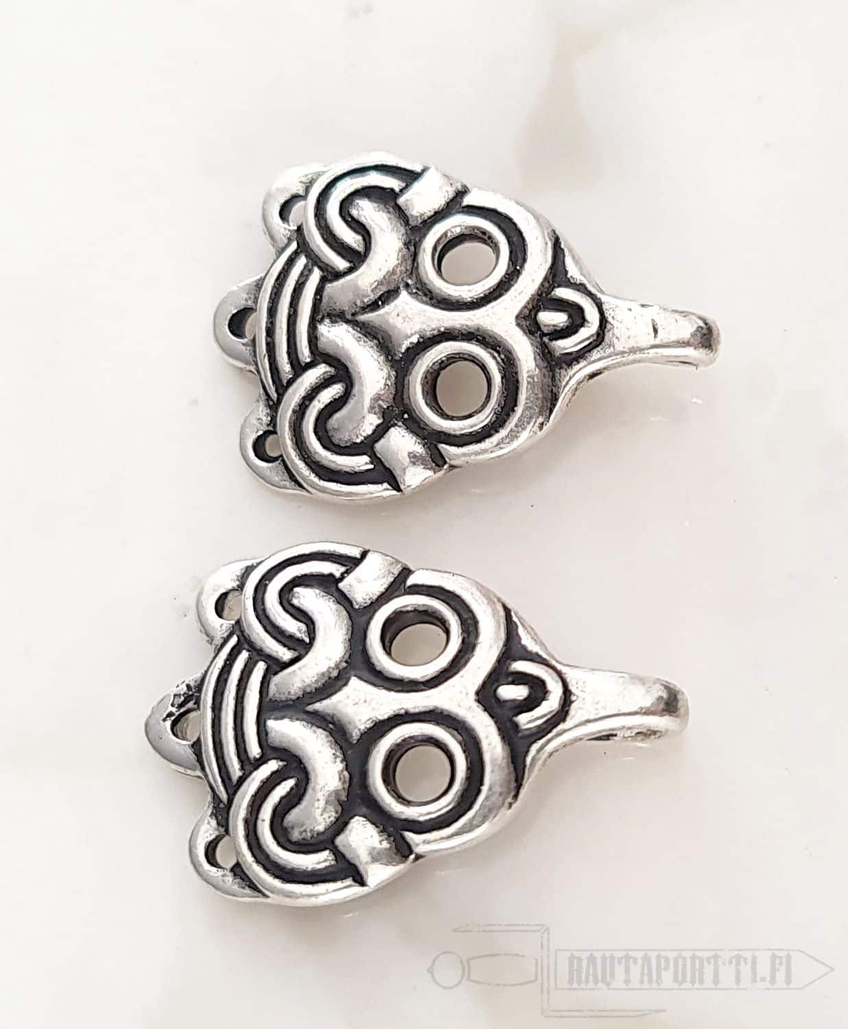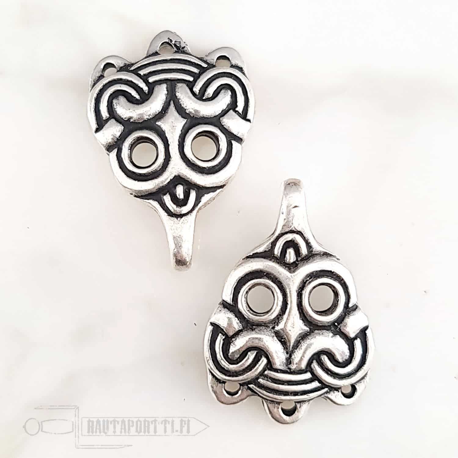 Nämä maskikuvioiset säärisiteiden kiinnityskoukut ovat jäljennös Birkan viikinkiasutuksesta Ruotsista löydetyistä kiinnityskoukuista. Ne ovat peräisin 900-luvulta. Hyvin samanlaisia, naamioin koristeltuja koukkuja, on löytynyt myös Laatokasta (Laatokanlinnasta), Novgorodista ja Gnjozdovosta nykyisen Venäjän alueilta. Viikinkiaikana säärisiteitä, ja näin ollen myös säärisiteiden kiinnityskoukkuja, käyttivät kaikki ihmiset sukupuolesta riippumatta. Erilaisia koukkuja on löydetty ympäri Eurooppaa; kaikkialta Skandinaviasta, idän rusien alueilta, Saksasta sekä Englannista. Alkuperäiset koukut löydettiin Birkasta haudasta 903. Säärisiteiden koukut löydettiin haudatun miehen polvien tienoilta ja niillä oli kiinnitetty säärisiteet hänen pellavahousujensa päälle.