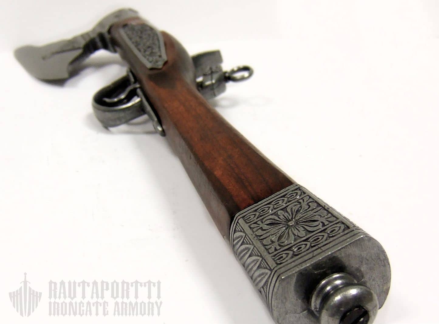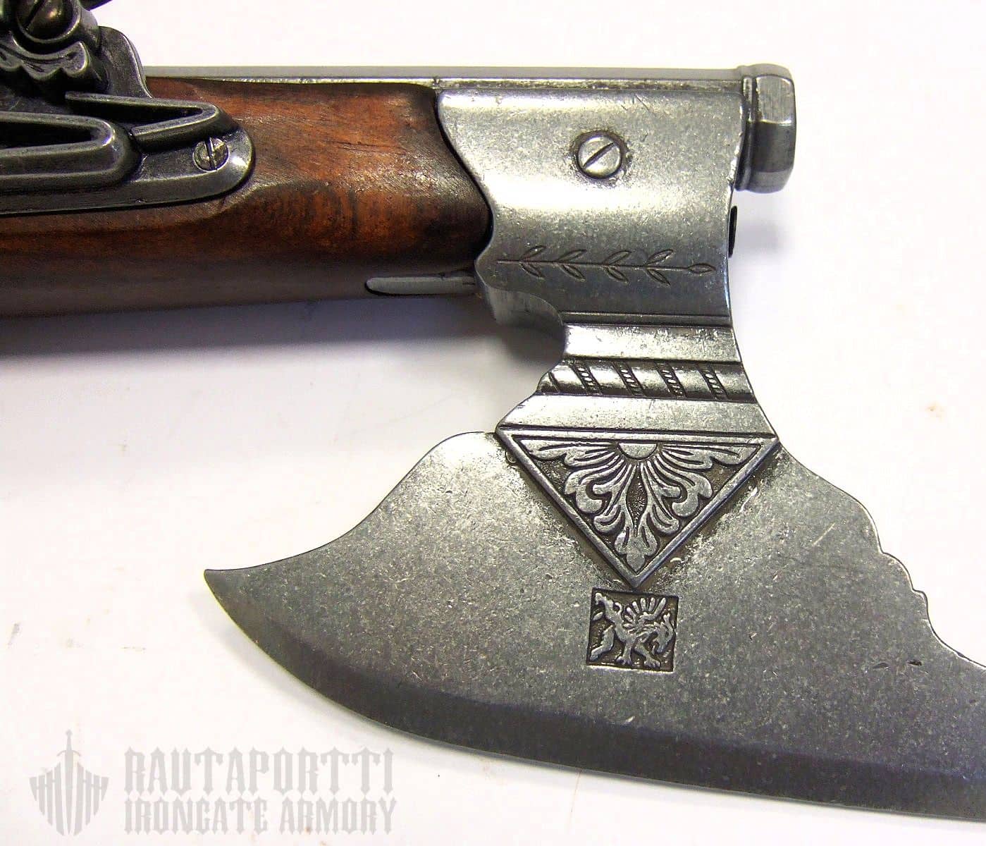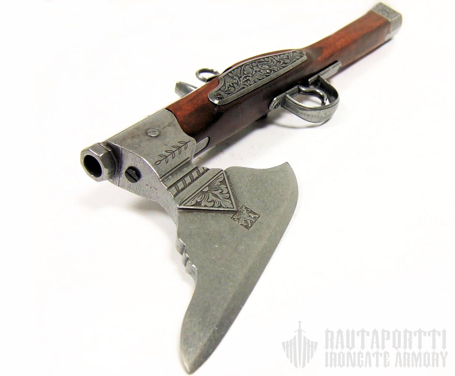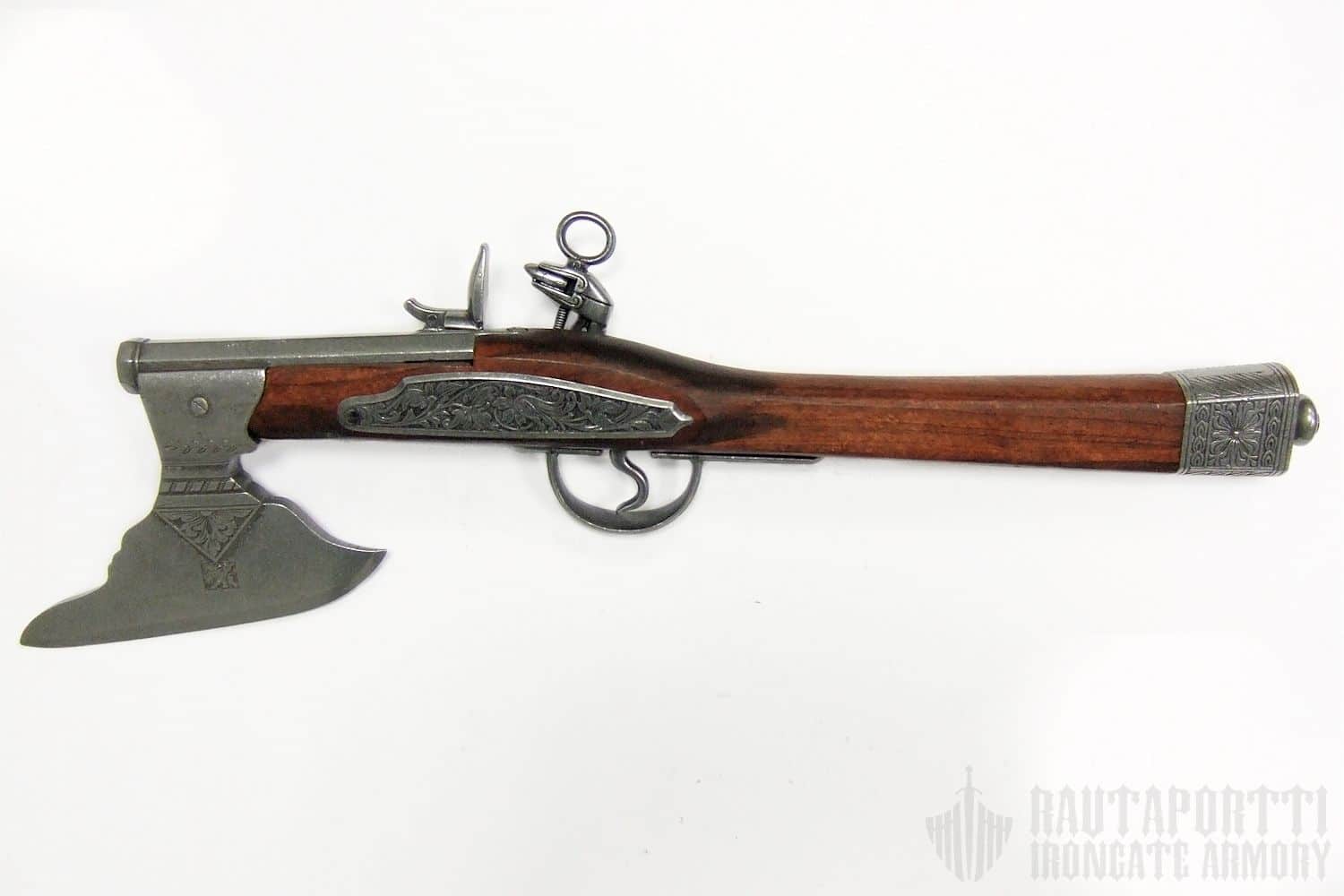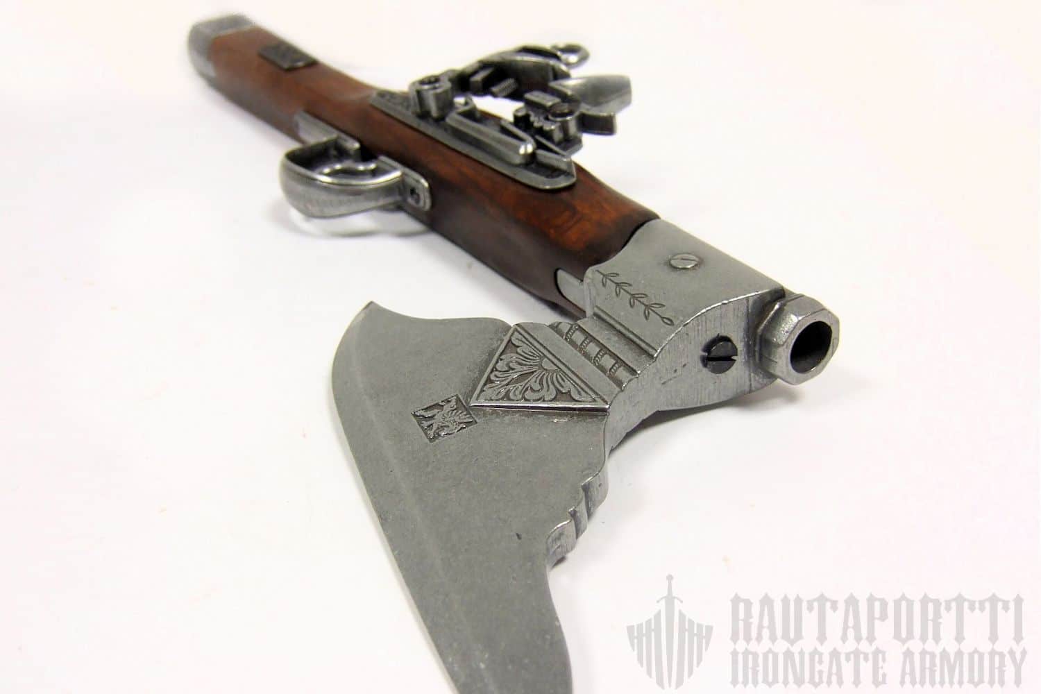 Tässä näyttävässä kirvespistoolissa on upeita yksityiskohtia, puuosat ovat tummaa jalopuuta ja terä, lukko, liipasin ja piippu on taidokkaasti koristeltua antiikinharmaata valumetallia. Aseen saa viritettyä ja laukaistua liipaisimesta kuin oikean. Tämä ase on ulkonäöltään aitoa vastaava, mutta sillä ei saa oikeasti ammuttua, eikä sitä ole mahdollista muuntaa ampuvaksi. Myöskään valumetallinen kirveenterä ei kestä kirveskäyttöä. Tällaista yhdistelmäasetta ei käytetty ainoastaan hevosen selässä Itä-Euroopassa, vaan se oli hyödyllinen myös Karibianmeren merirosvoille vihollisen aluksiin noustessa ja lähitaisteluissa laivan kannen alla.