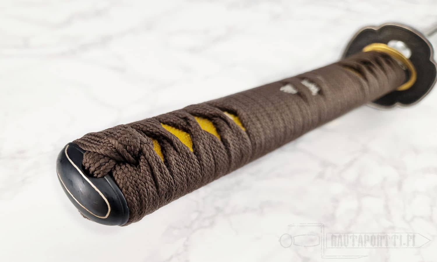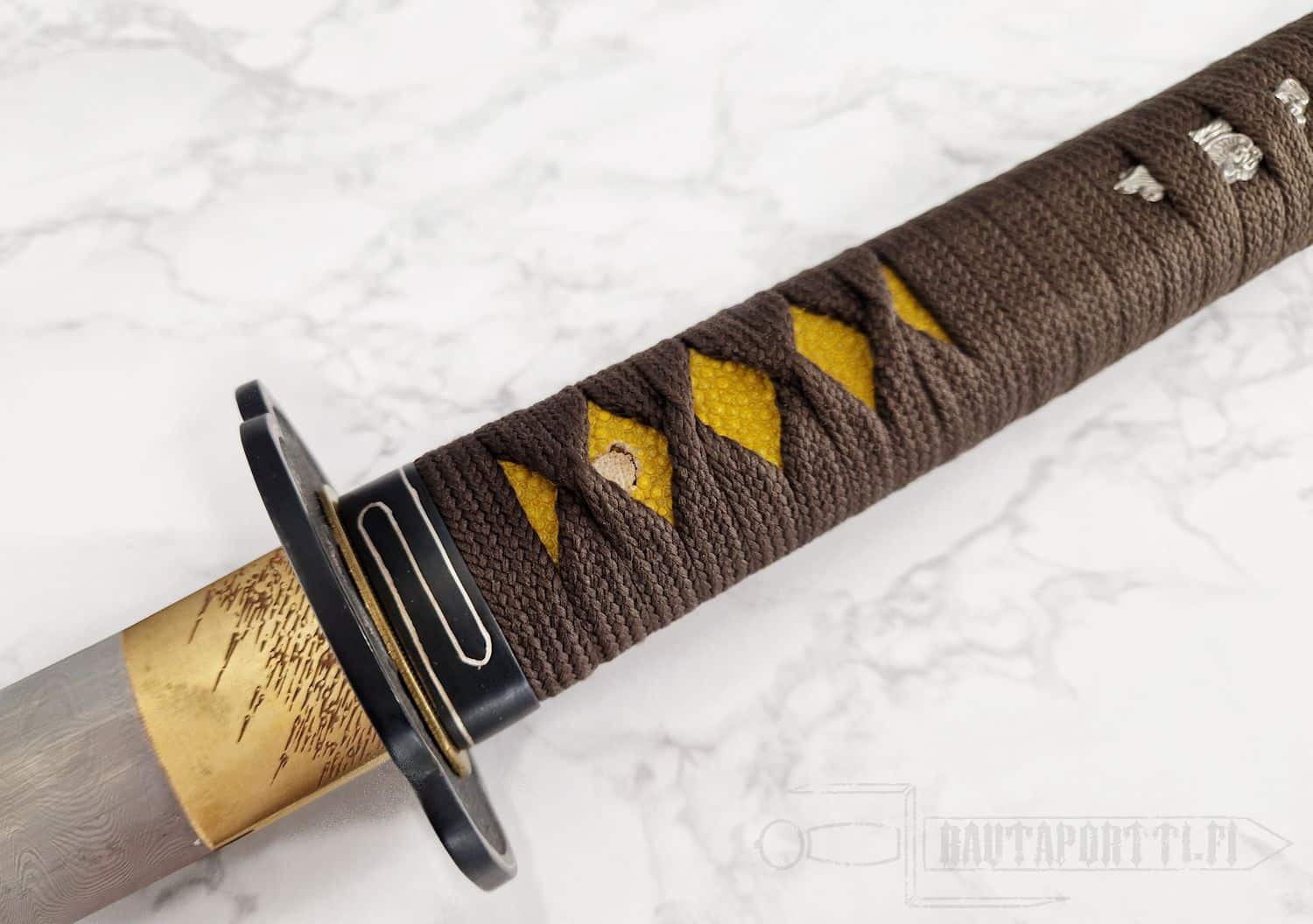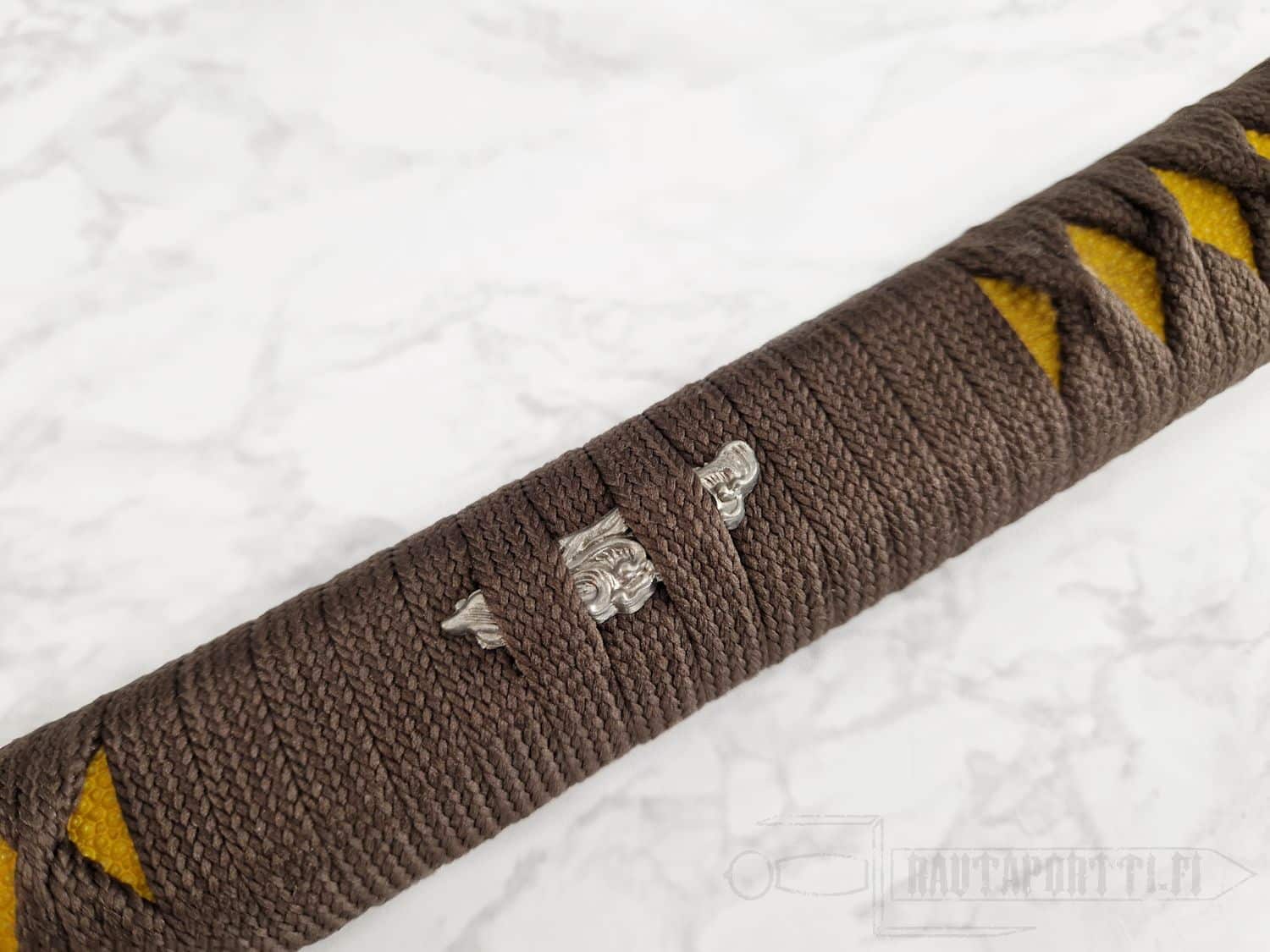 Kokonaisuus huokuu harkittua viimeistelyä: kovapuinen kahva on sidottu ruskealla silkkisidonnalla katatemaki-tekniikalla, ja yksityiskohtina ovat hopeapinnoitetut menukit sekä hopeareunuksin koristellut rautaiset tsuba, kashira ja fuchi. Silkkisidonnan alla kahvaa viimeistelee värjätty same (rauskun nahka).