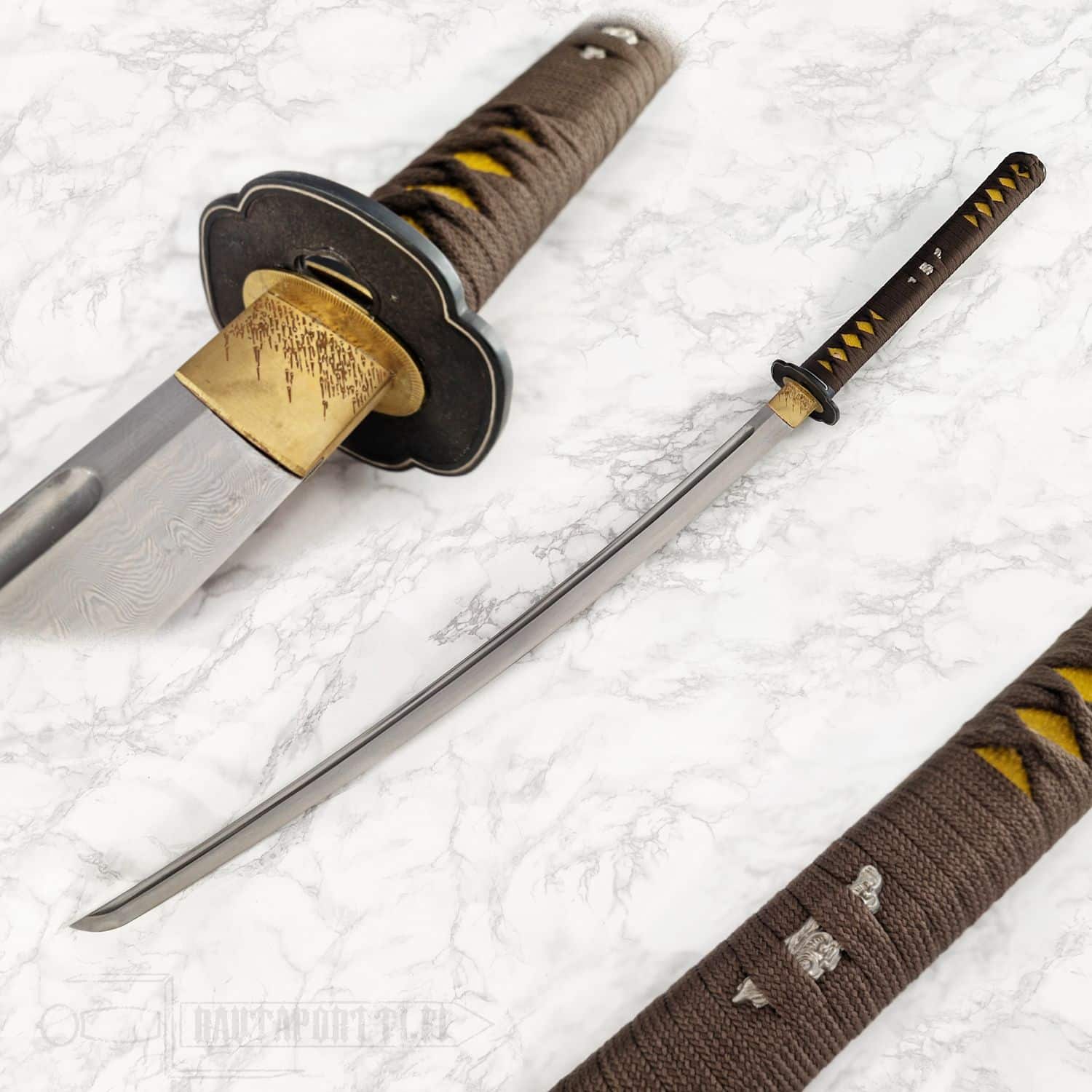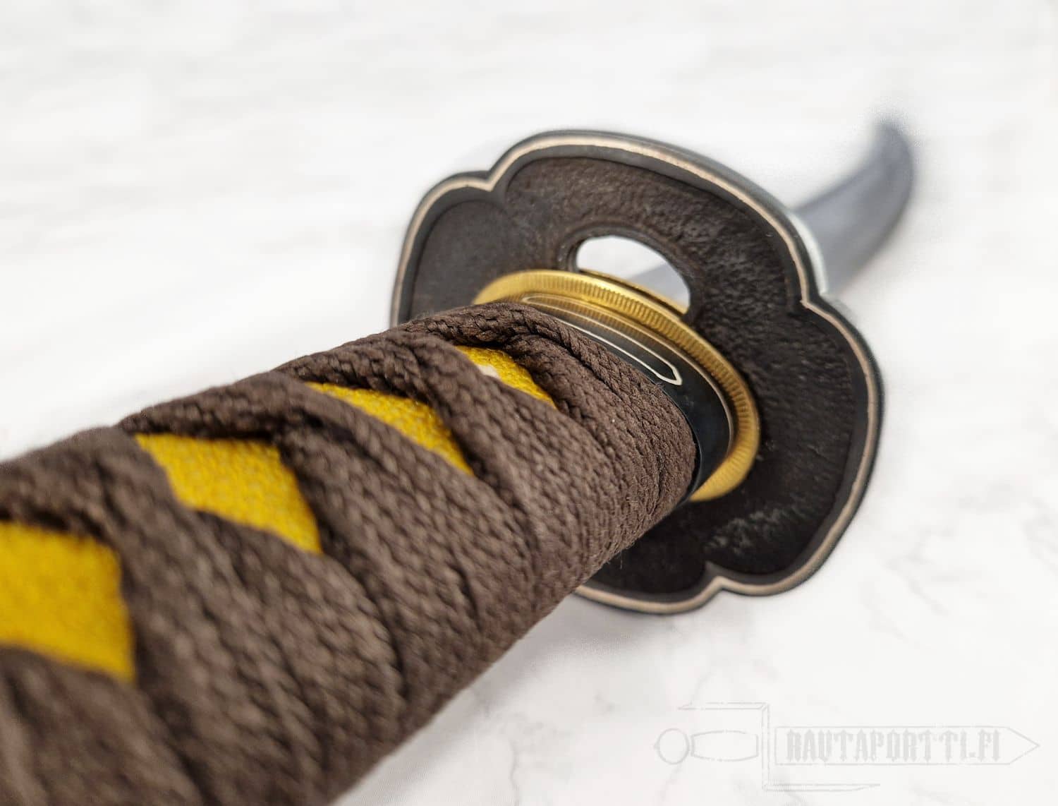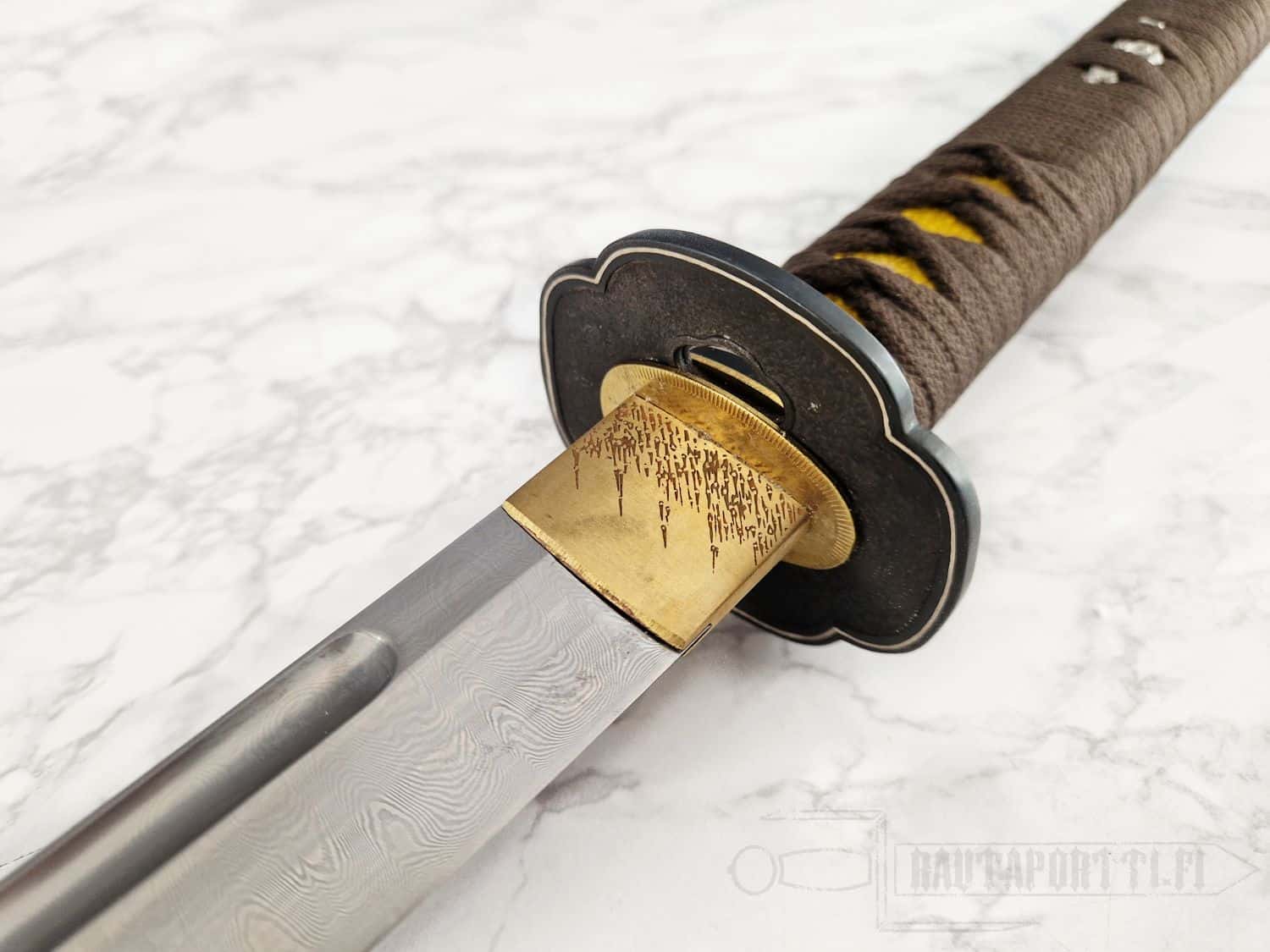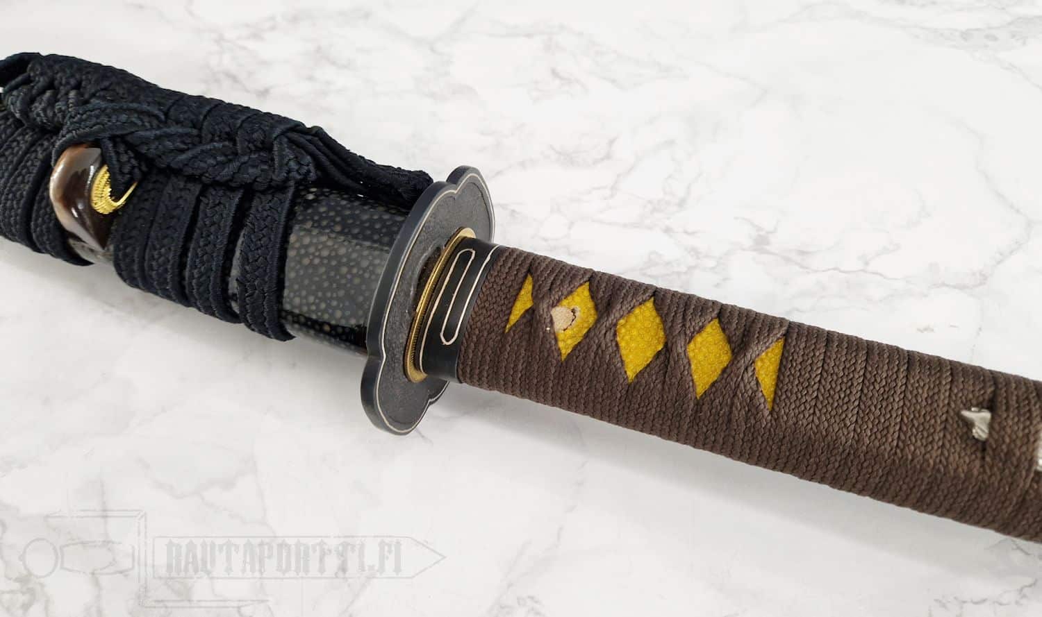Kokonaisuus huokuu harkittua viimeistelyä: kovapuinen kahva on sidottu ruskealla silkkisidonnalla katatemaki-tekniikalla, ja yksityiskohtina ovat hopeapinnoitetut menukit sekä hopeareunuksin koristellut rautaiset tsuba, kashira ja fuchi. Silkkisidonnan alla kahvaa viimeistelee värjätty same (rauskun nahka).