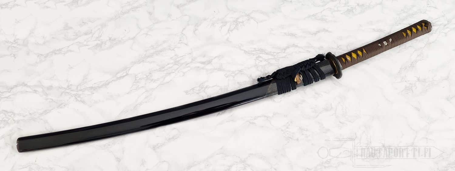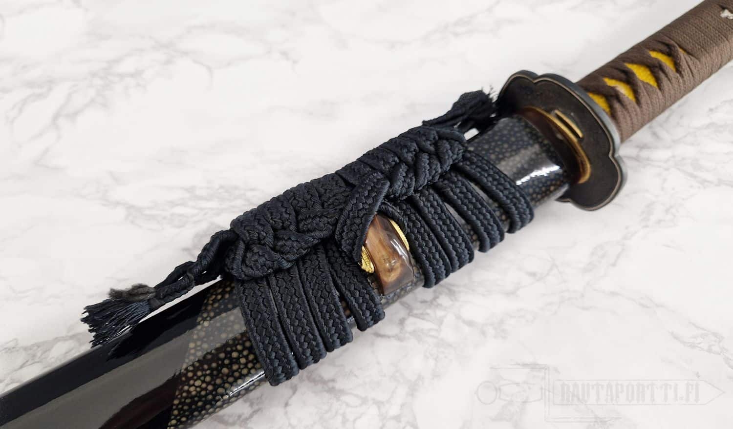Tuppeen on panostettu erityisesti: kovapuusta valmistettu saya on lakattu neljällä paksulla mustan lakan kerroksella ja viimeistelty aidoilla puhvelinsarviosilla – koiguchi, kojiri ja kurikata. Silkkinen sageo ja tarkoin valittu rauskun nahka viimeistelevät kokonaisuuden.